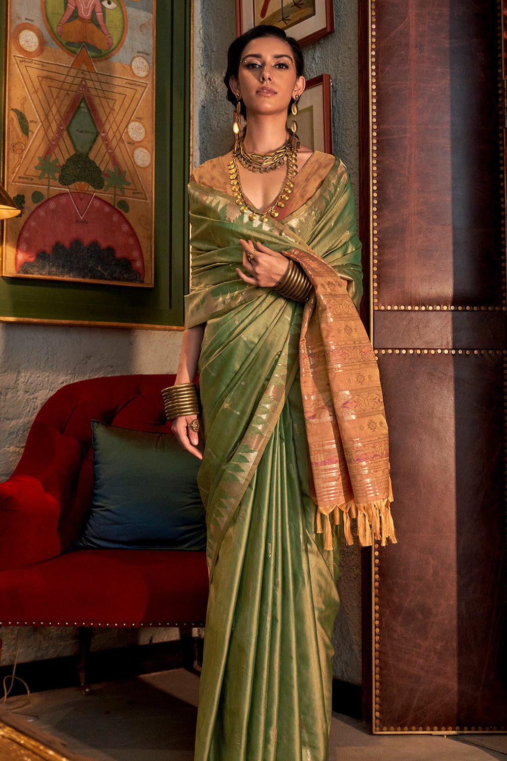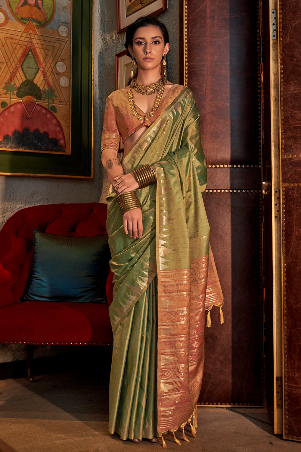 Enhance your traditional look with our elegant green tussar saree. Featuring a stunning contrast ikkat pallu and blouse, this saree is perfect for any occasion. Made from high-quality tussar fabric, it offers both comfort and style. Elevate your wardrobe with this timeless piece.