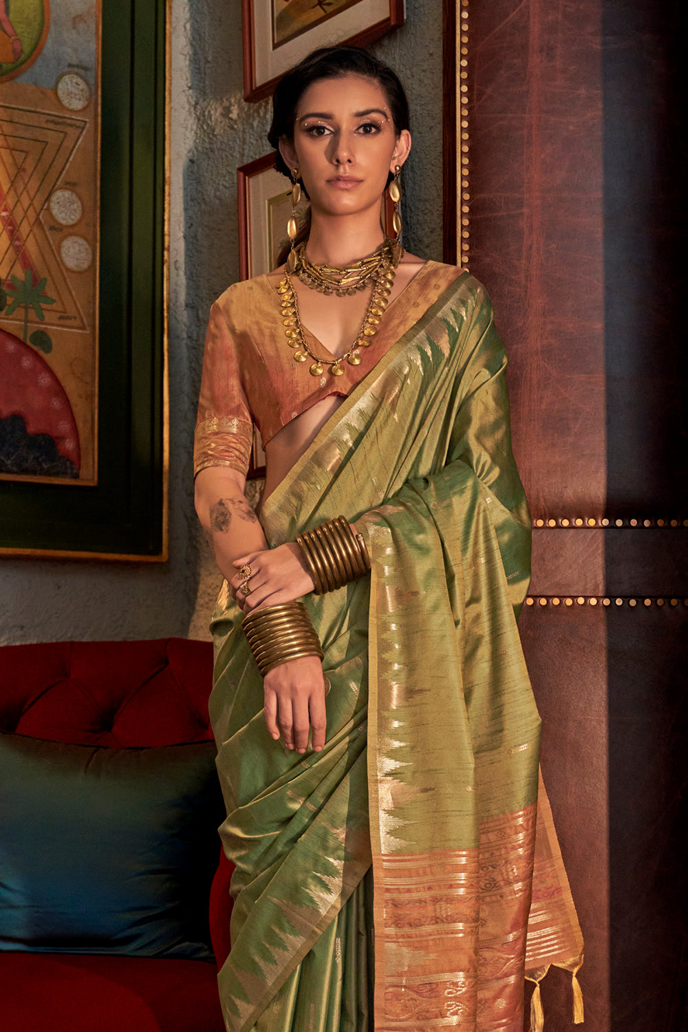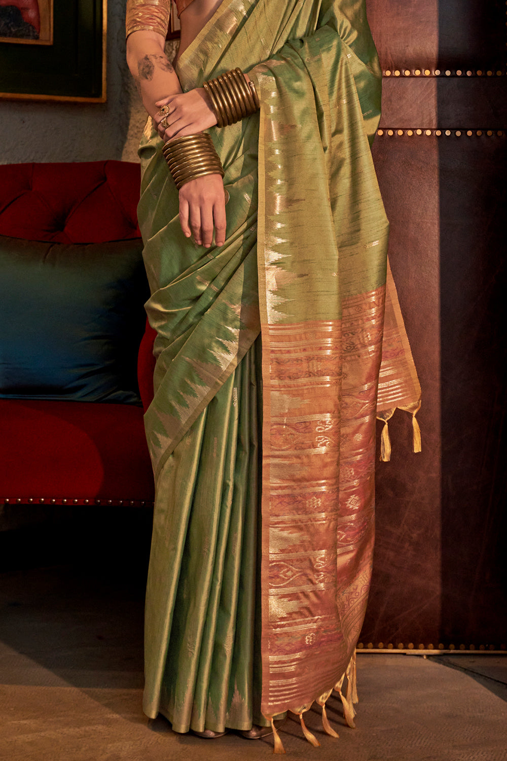 Green Saree With Contrast Ikkat Pallu And Blouse