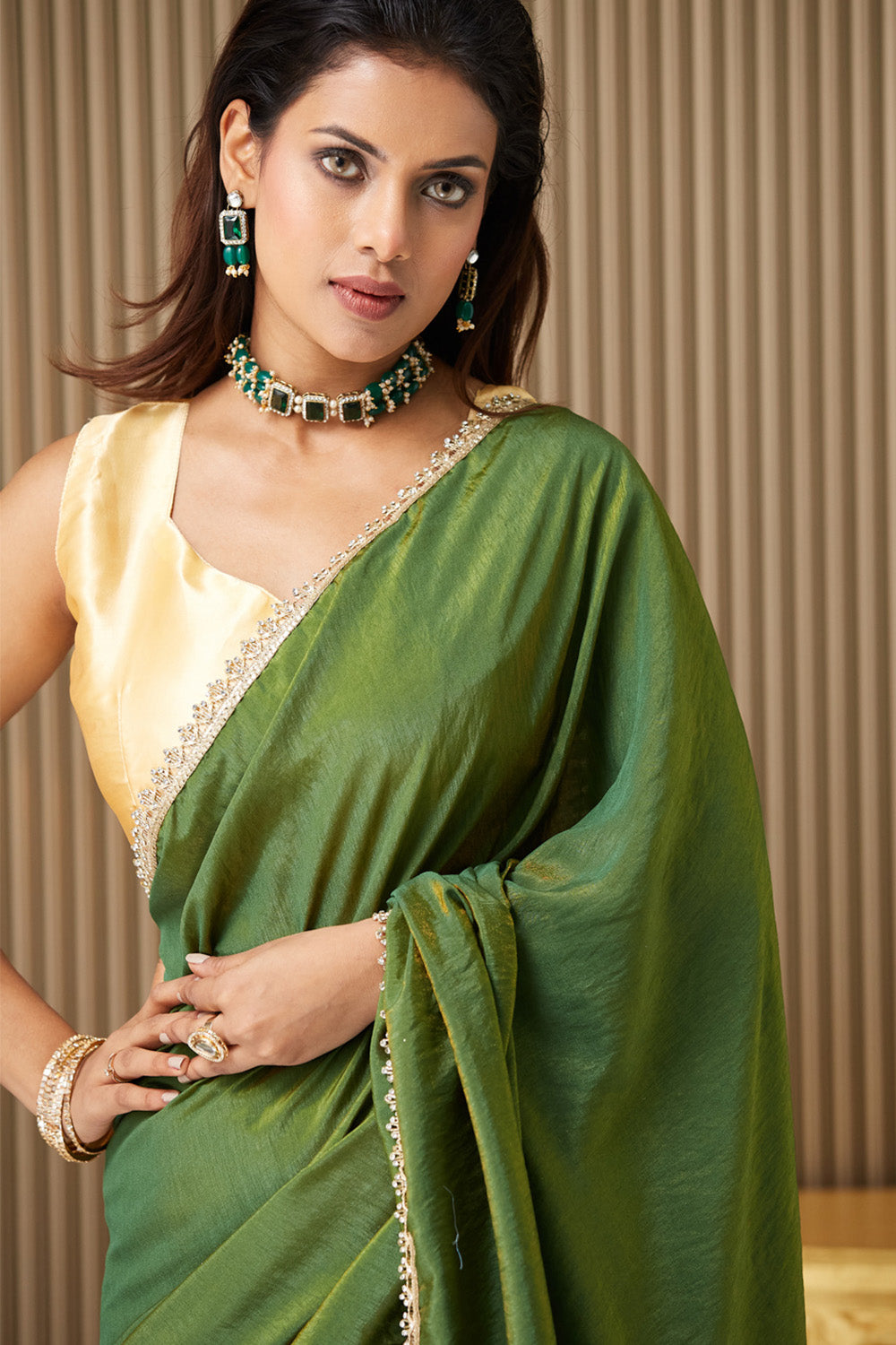 Elevate your traditional wardrobe with this Green Weaved Lace Saree, expertly crafted to combine elegance and intricate design. The delicate lace weaving adds texture and sophistication, while the included matching blouse ensures a seamless, polished look. Perfect for formal occasions, this saree offers both style and comfort, making it a refined choice for discerning wearers.