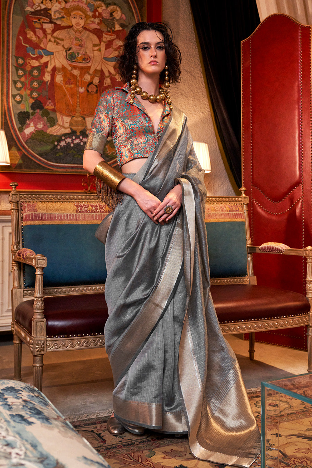 Grey Banarasi Georgette Saree With Jacquard Blouse