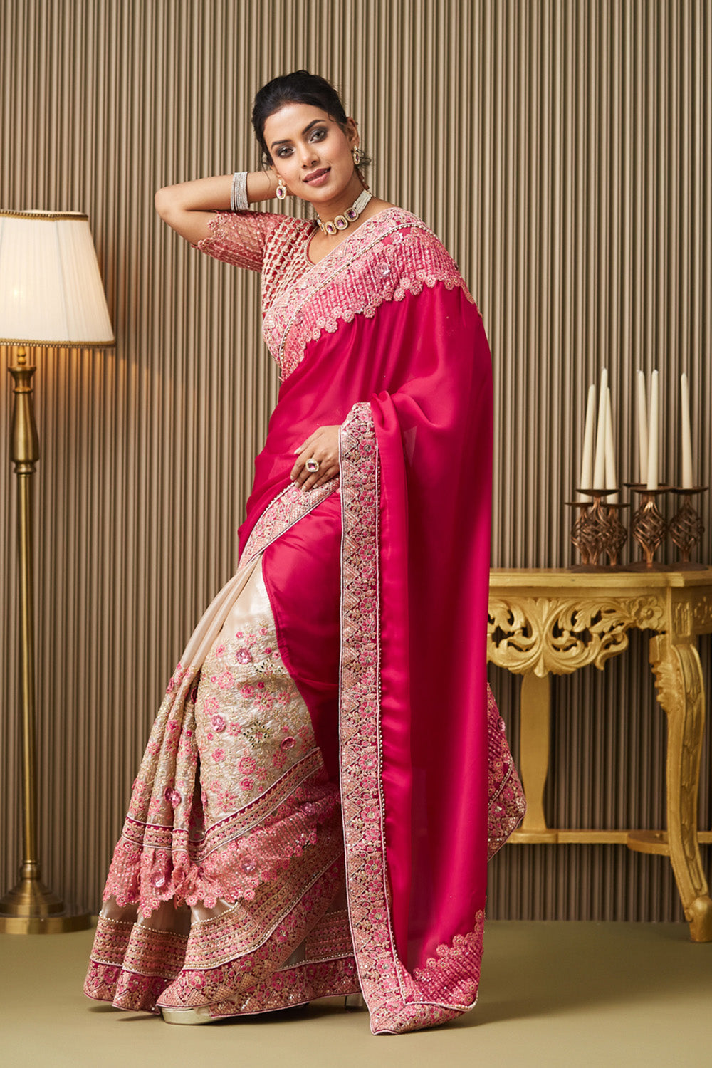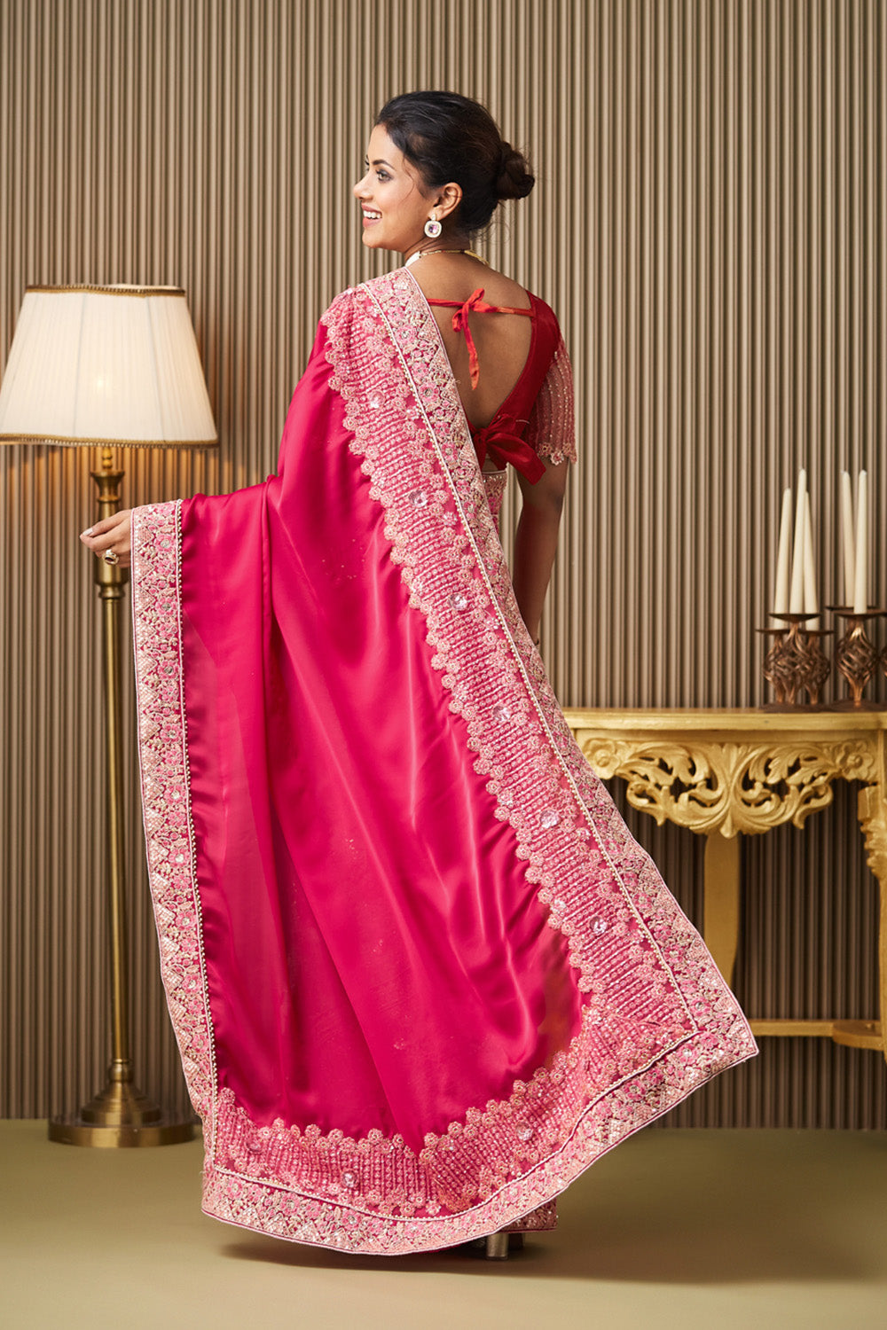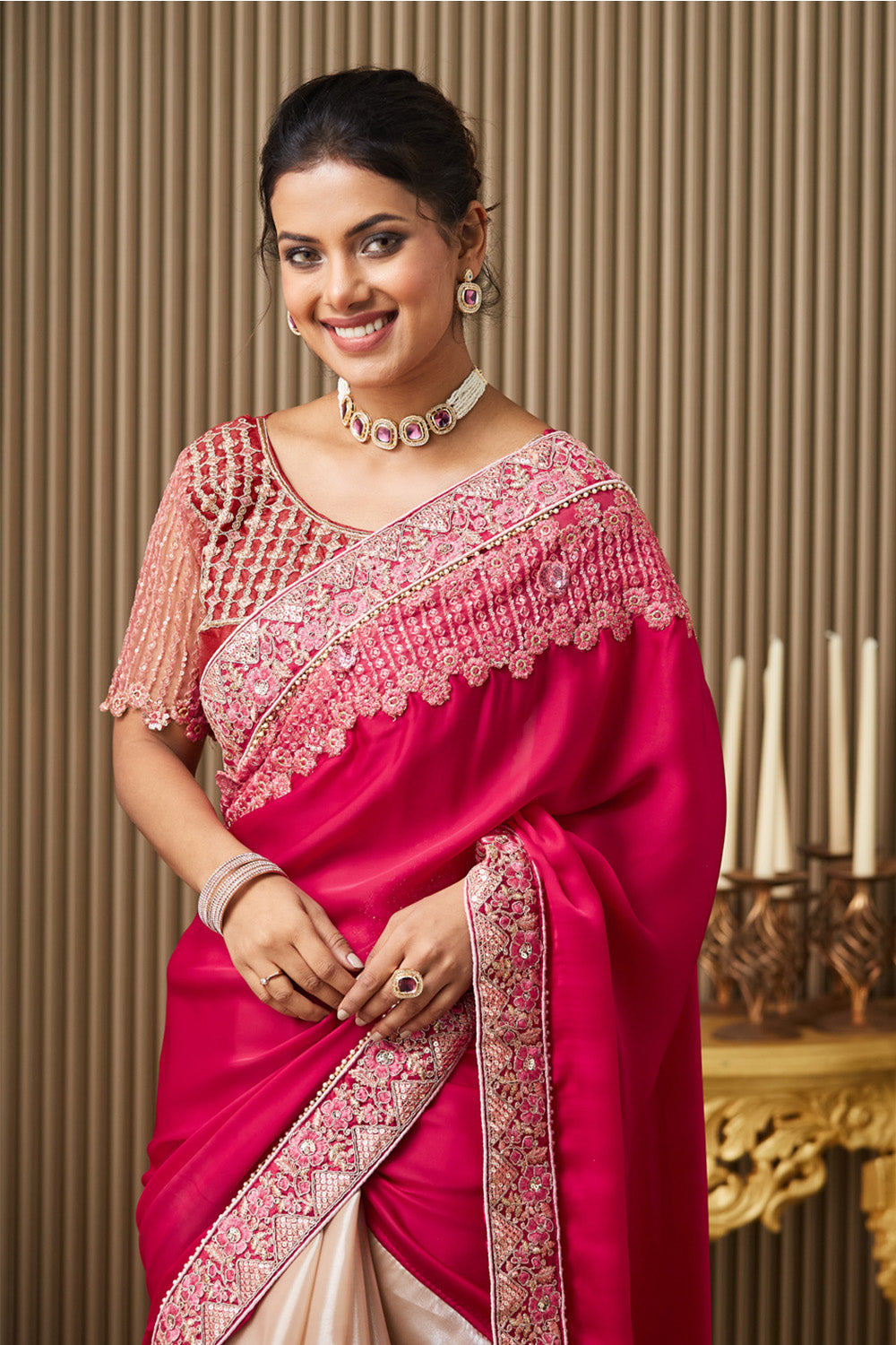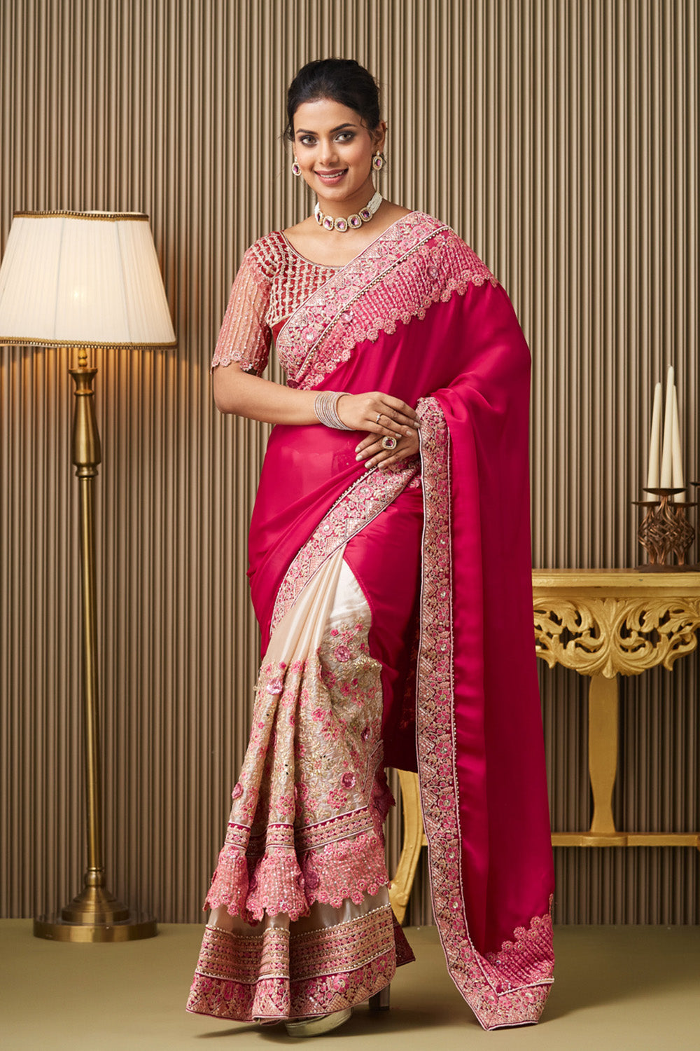 Elevate your wardrobe with this Pink Cream Embroidered Satin Saree, paired with a matching blouse. Crafted from smooth satin, it offers a luxurious drape and subtle sheen. The intricate embroidery adds refined elegance, making it ideal for formal occasions and celebrations. This saree combines traditional craftsmanship with contemporary style, ensuring a graceful and sophisticated look.