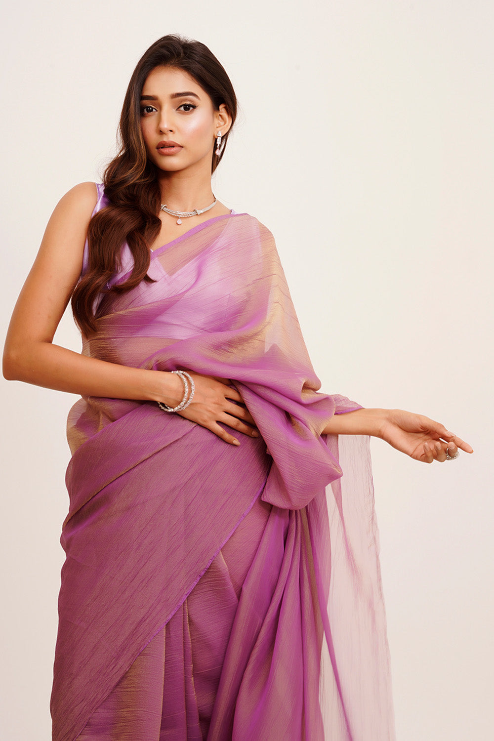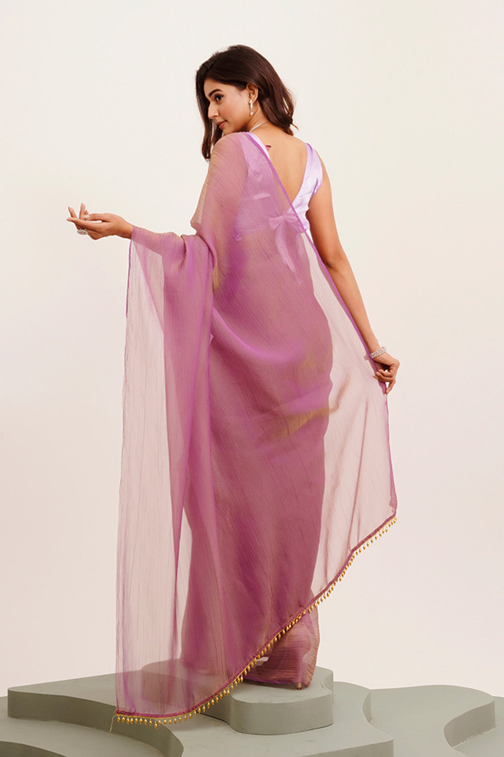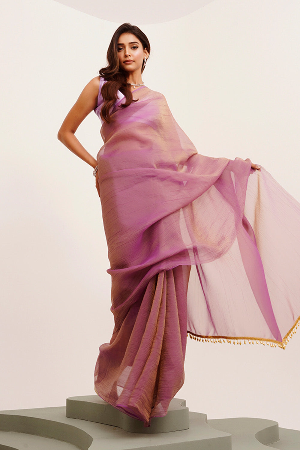 Elevate your wardrobe with this Lavender Solid Tissue saree featuring delicate tassels for a refined finish. Crafted from lightweight tissue fabric, it offers a graceful drape and comfortable wear. Paired with a matching blouse, this ensemble blends traditional elegance with modern subtlety, making it ideal for formal occasions and celebrations.