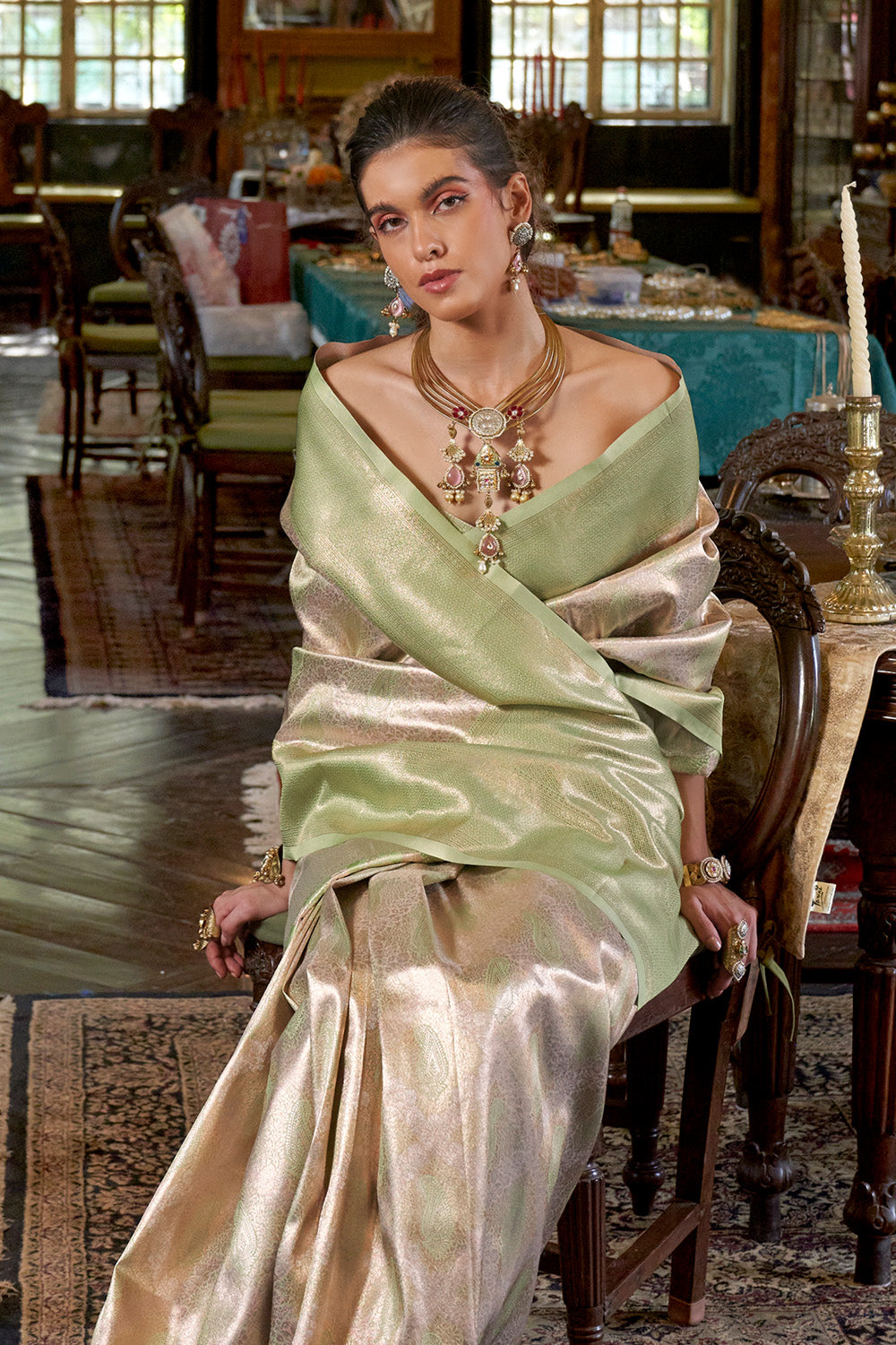 This Light Green Dharmavaram saree showcases exquisite traditional weaving known for its rich texture and vibrant finish. Crafted with finesse, it offers durability alongside elegance. The included matching blouse completes the ensemble, making it a perfect choice for festive occasions and celebrations where authentic craftsmanship is appreciated.