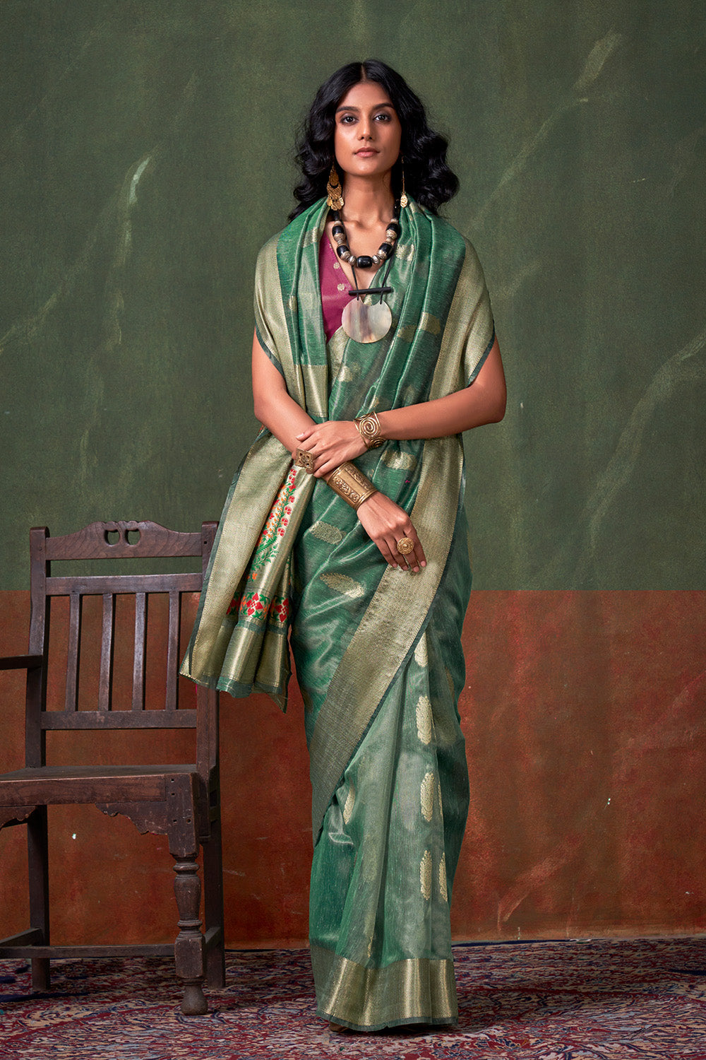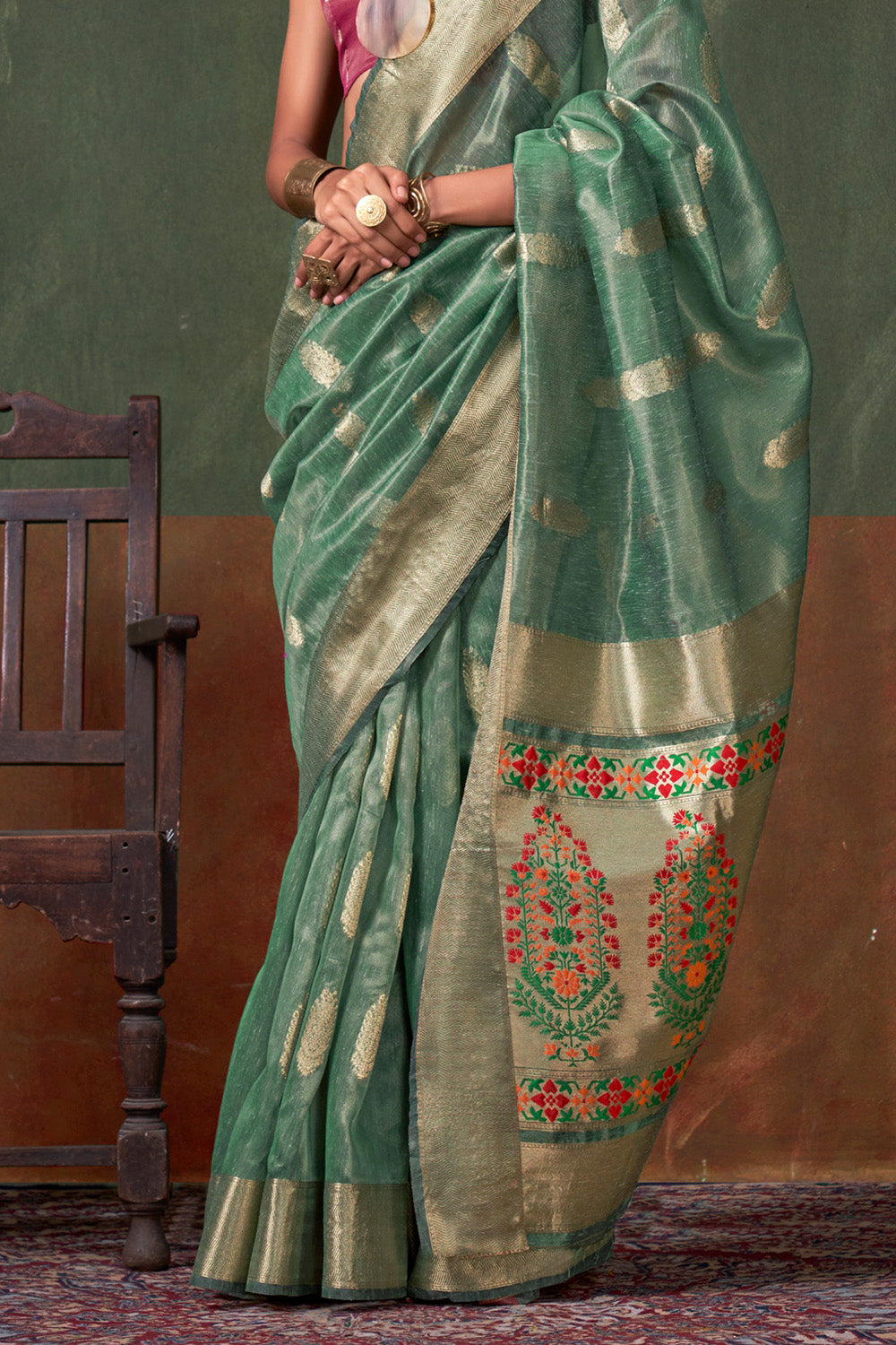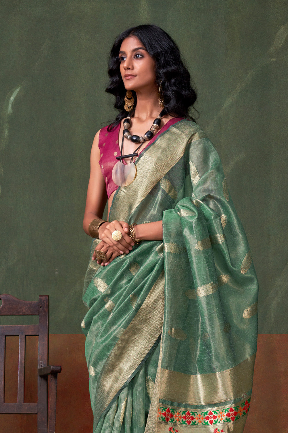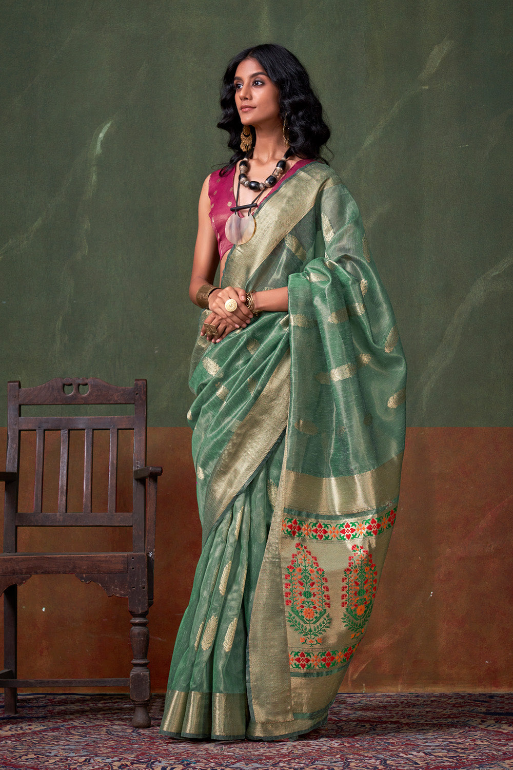 Expertly crafted for a flawless drape, this light green Paithani saree is adorned with intricate Zari detailing. Made from premium Tissue fabric, it exudes elegance and grace. With a matching blouse, this saree is perfect for traditional occasions.
