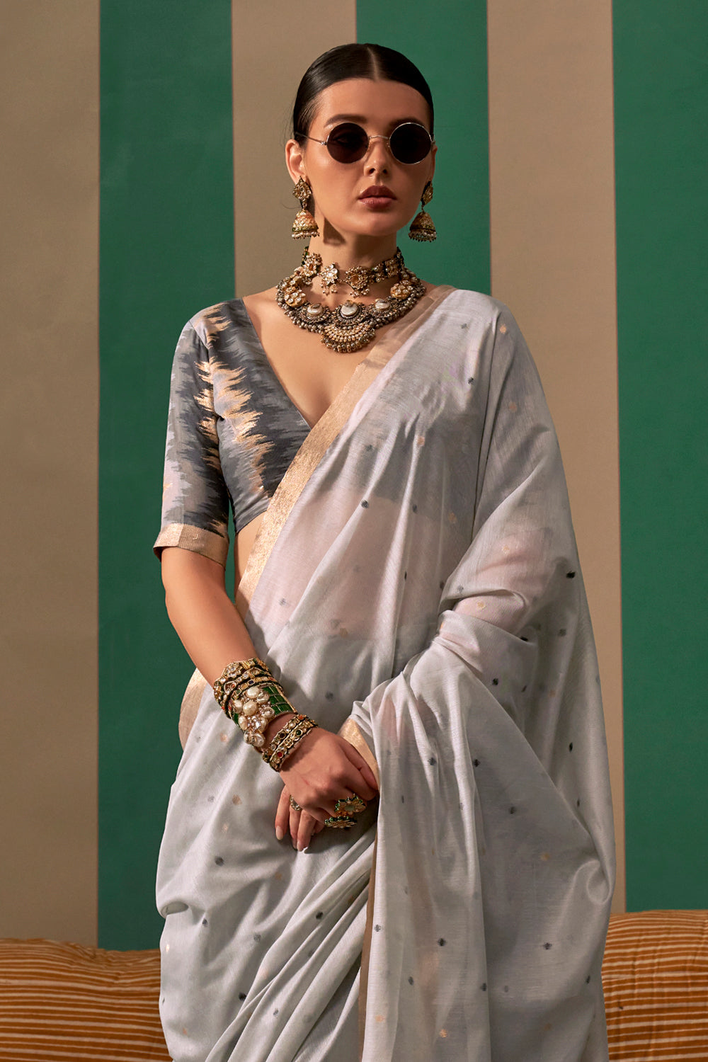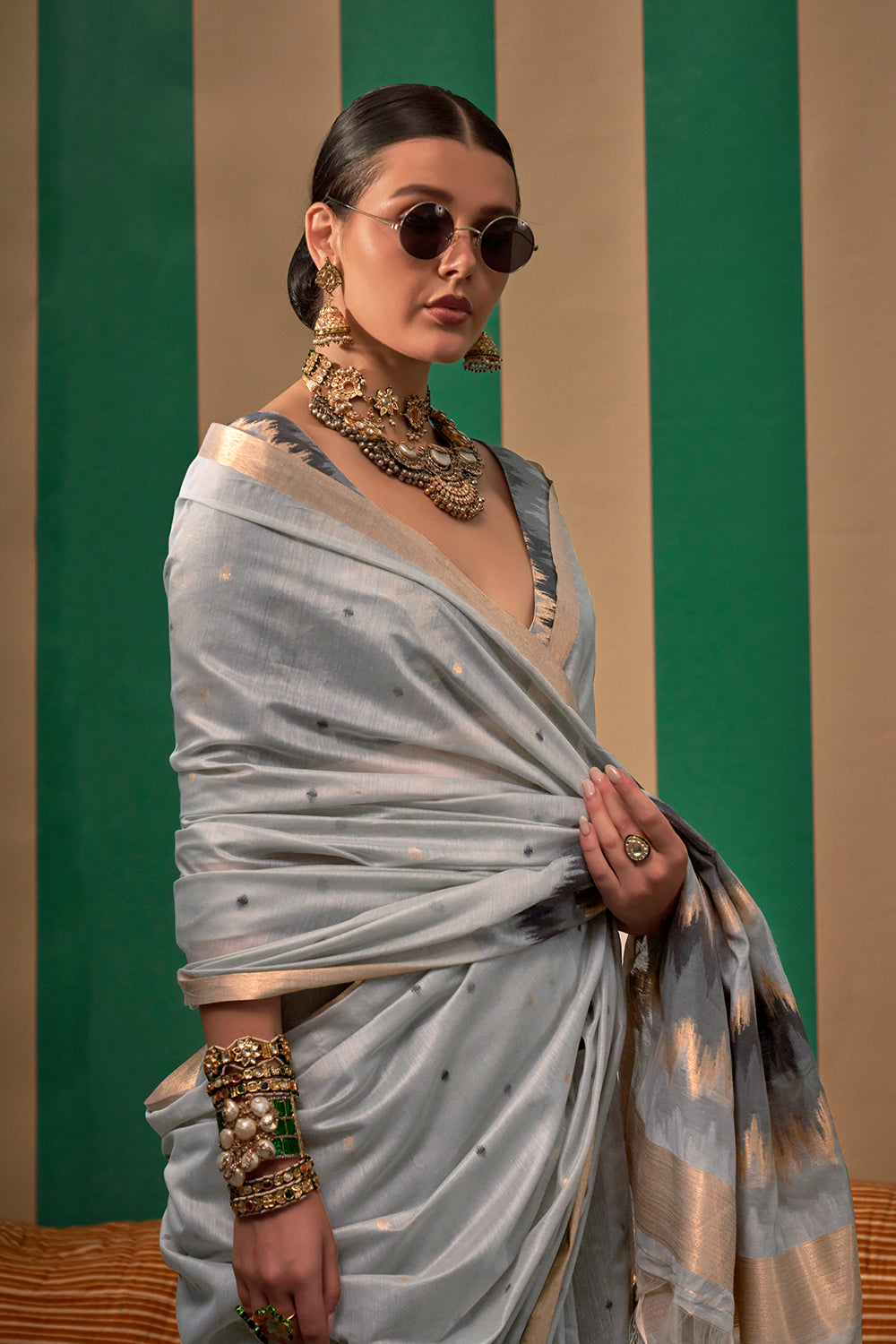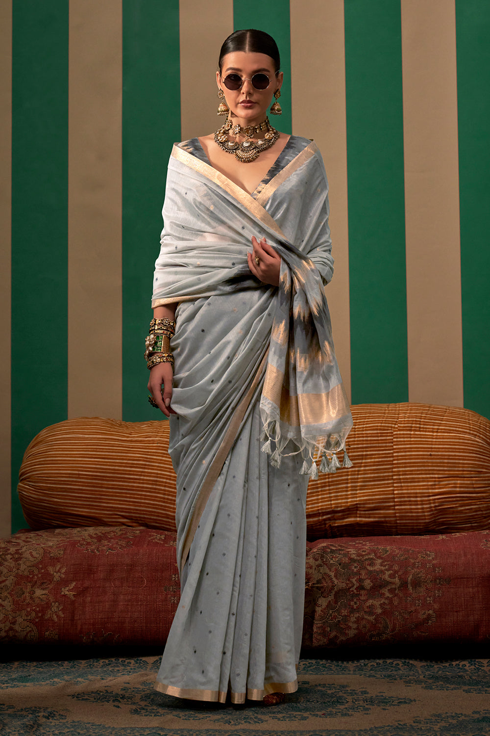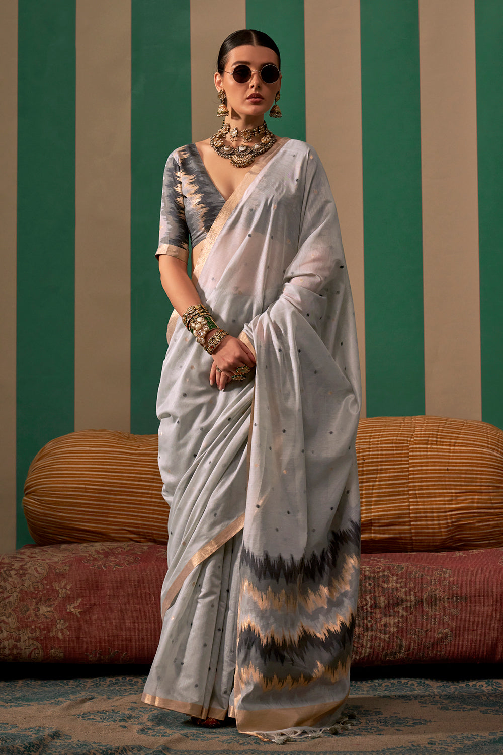 Exude elegance with our light grey ikkat saree. Featuring a beautiful ikkat print, this saree is sure to make a statement. The included blouse adds a touch of sophistication. Elevate your traditional wardrobe with this stylish and versatile piece.