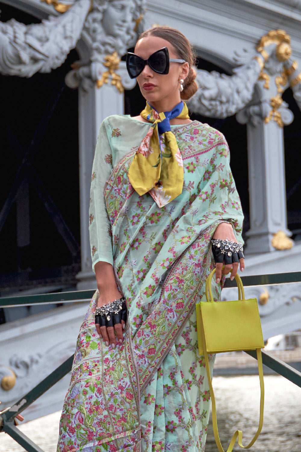 Expertly crafted with light green organza fabric, these parsi sarees are a must-have for any traditional wardrobe. Paired with a matching green blouse, the delicate fabric drapes beautifully and adds an elegant touch to any look. Elevate your style with this stunning combination of heritage and modern flair.