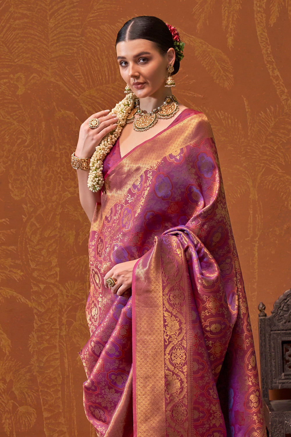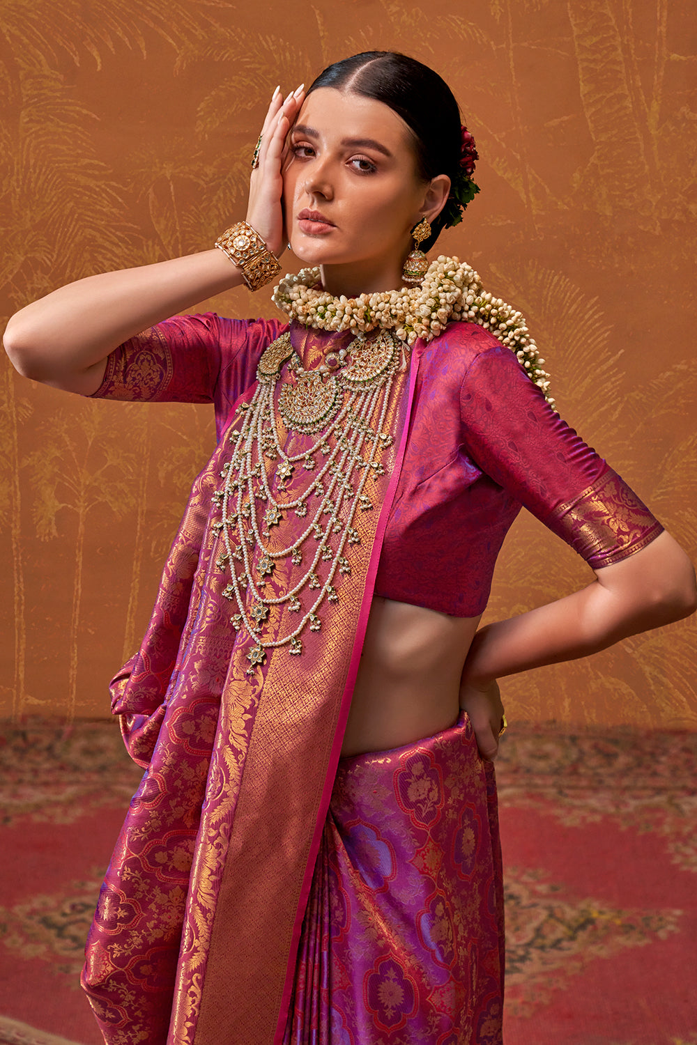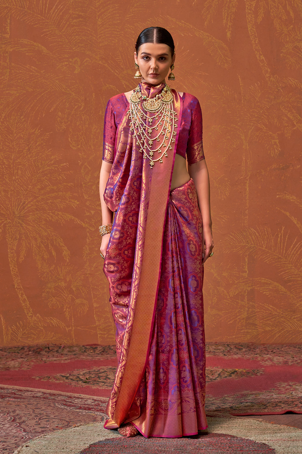 Elevate your ethnic wardrobe with our lilac Banarasi motif sarees, featuring intricate motifs and a matching blouse. Made from high-quality fabric, these sarees offer comfort and elegance. Enhance your style with these must-have sarees, perfect for any occasion.