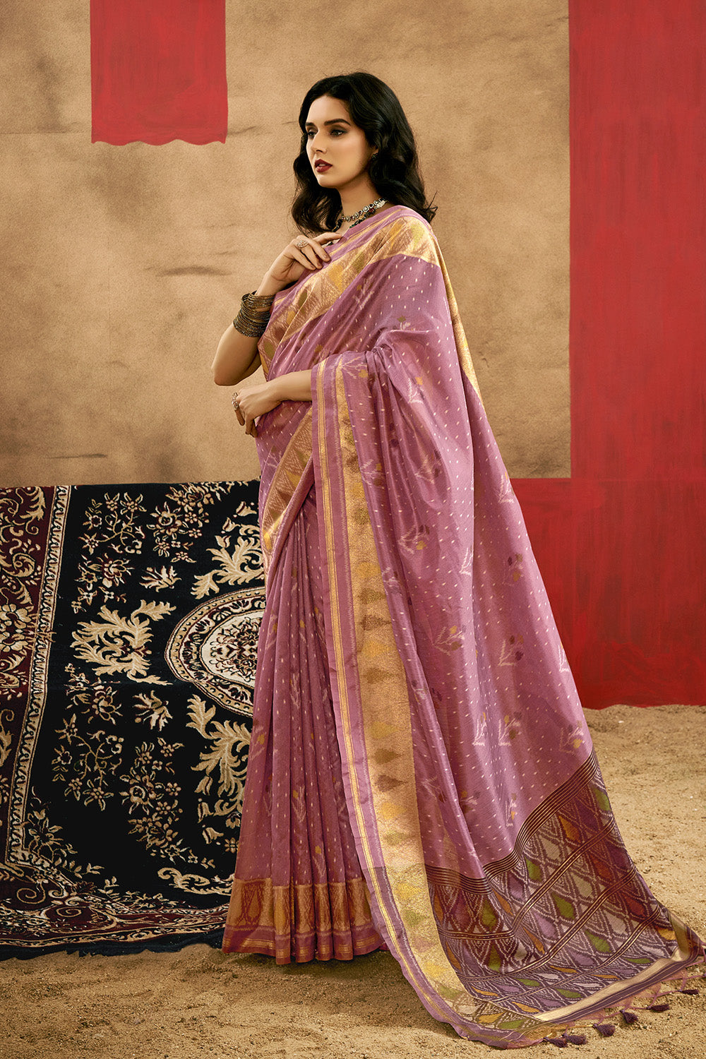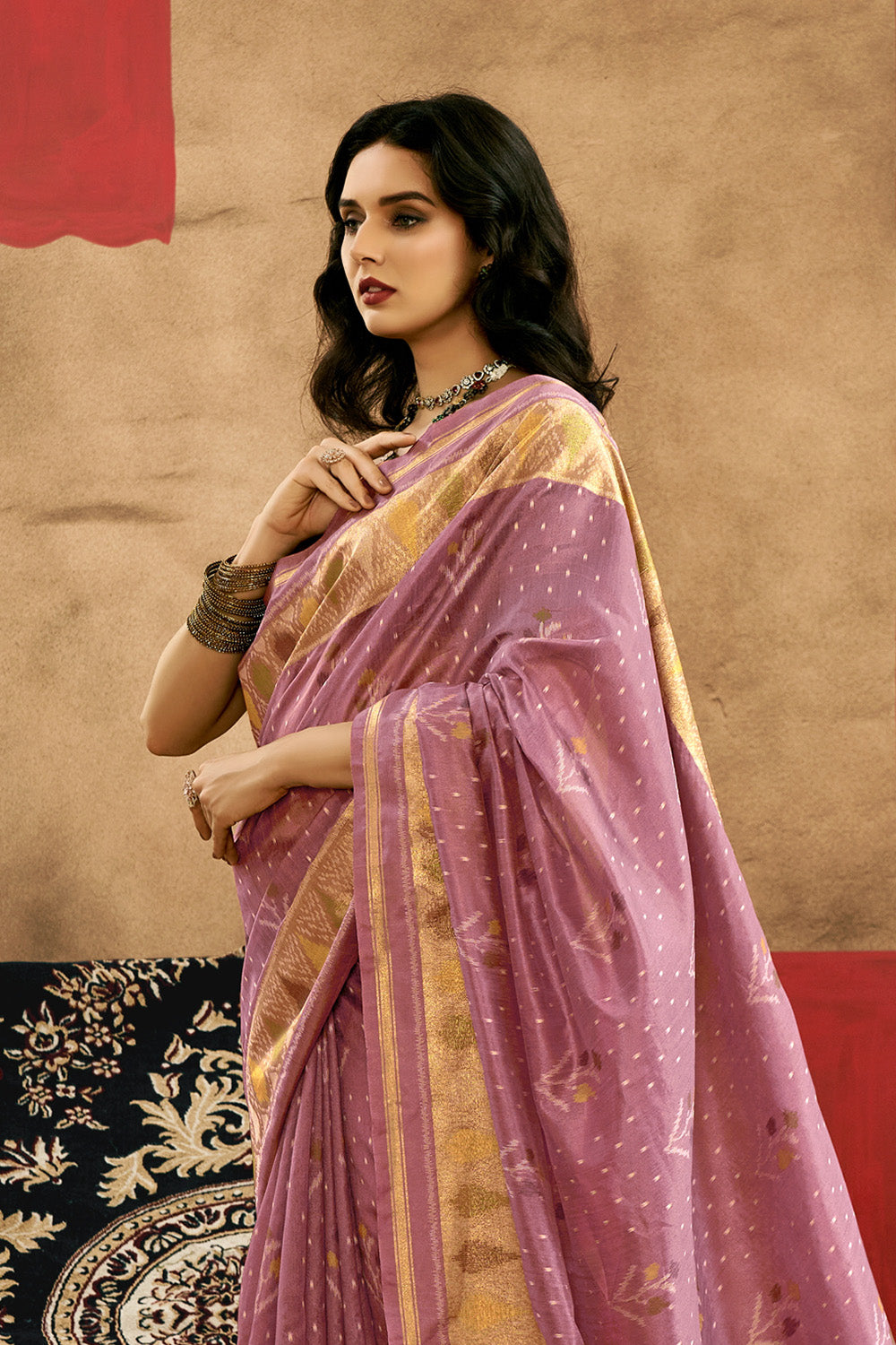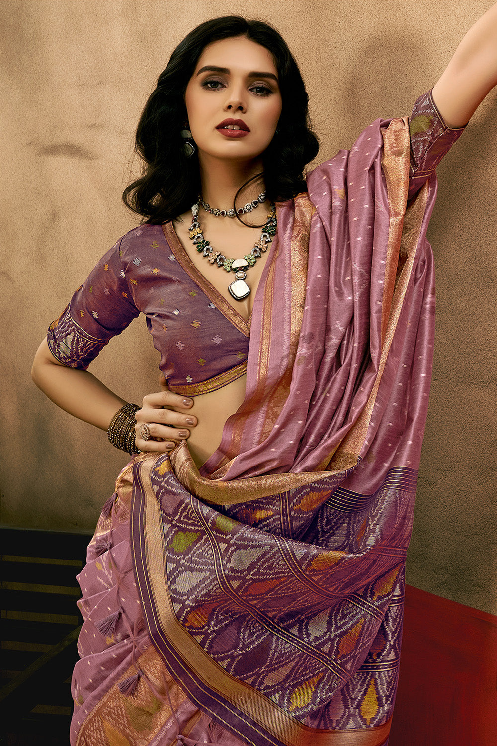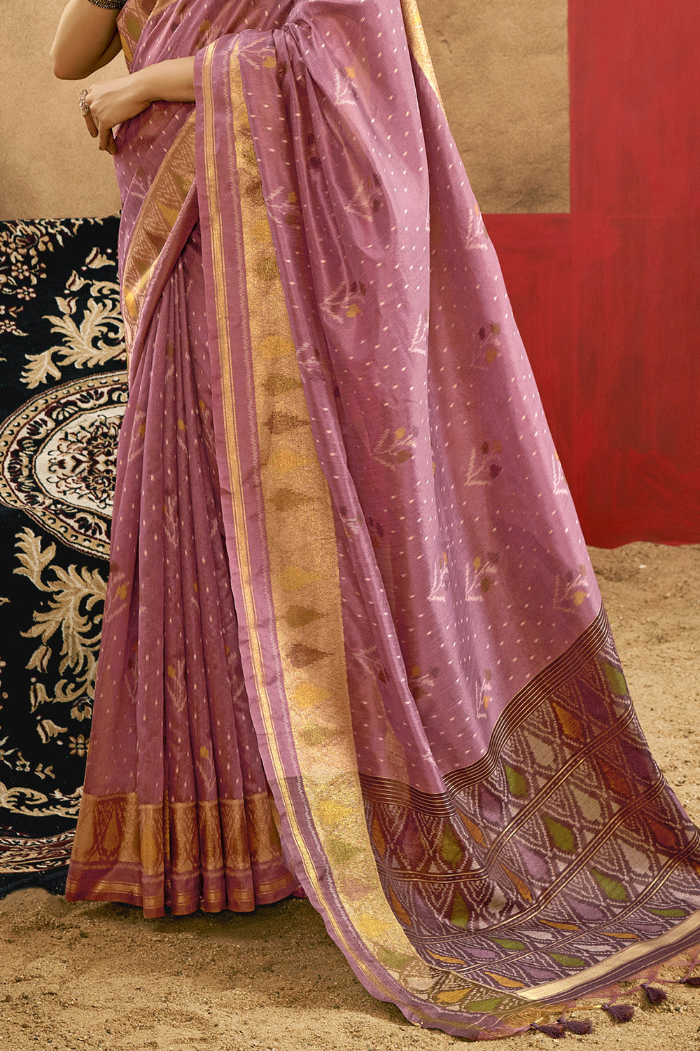Expertly crafted from high-quality materials, this Lilac Patola Saree is a must-have addition to any traditional wardrobe. Featuring a matching blouse, the intricate design and stunning lilac color will elevate any look. Experience the luxurious feel and timeless beauty of this Patola Saree.