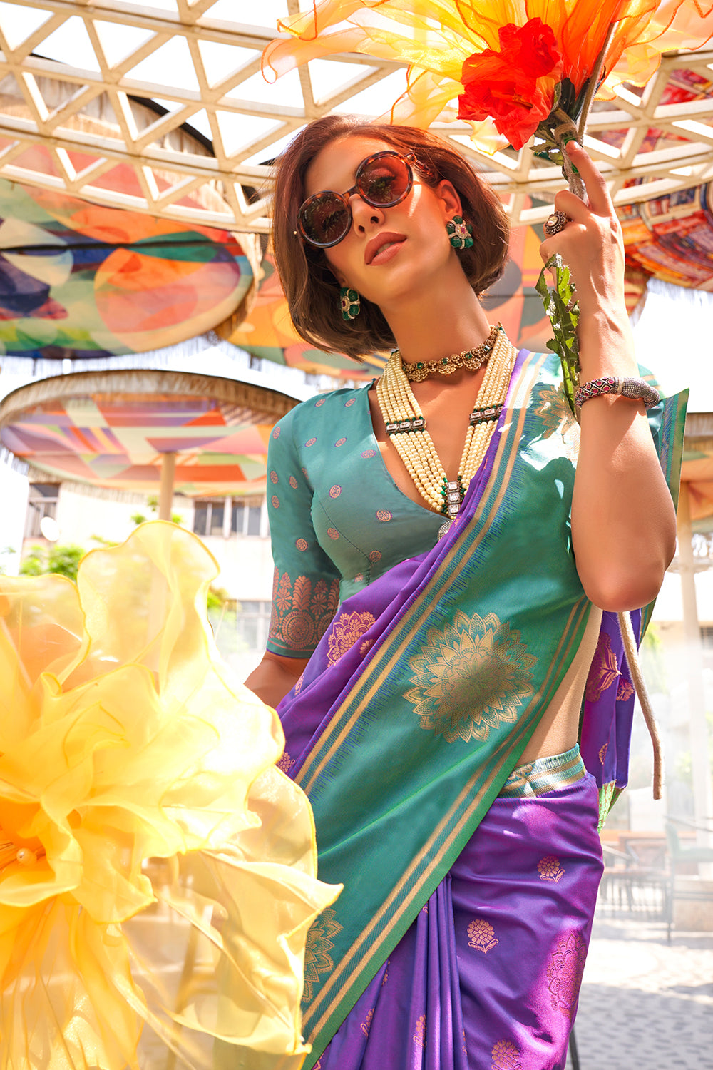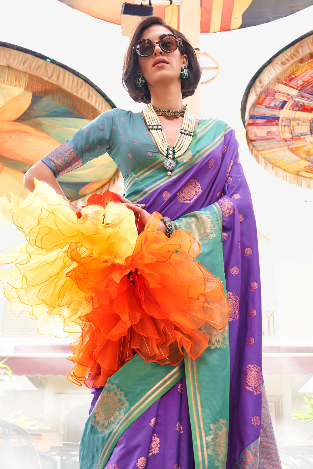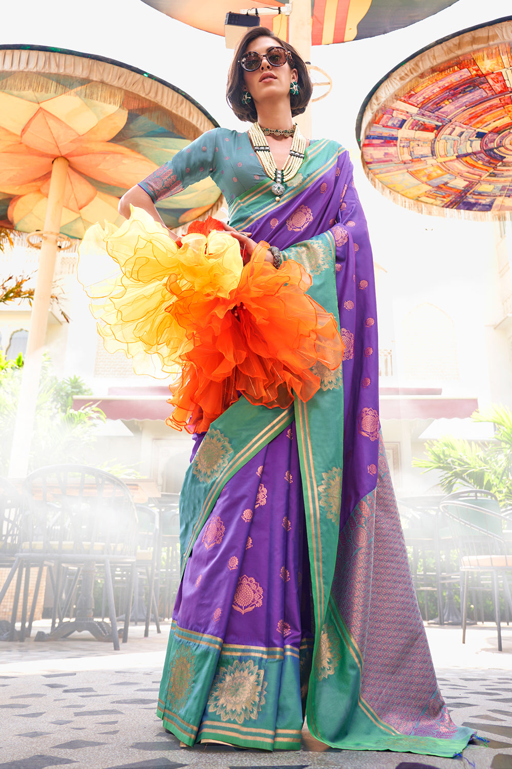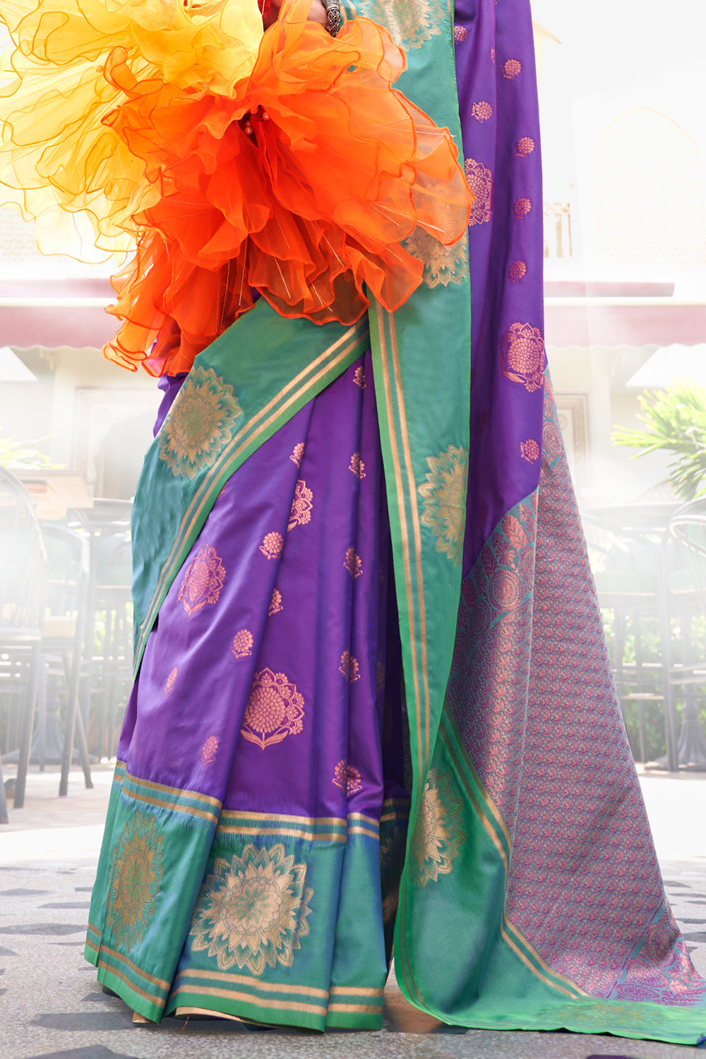 Expertly crafted from high-quality katan fabric, this lilac two-tone contrast saree adds an air of sophistication to any occasion. The subtle two-tone design and contrasting border elevate the traditional saree, while the included blouse completes the look. Make a statement and exude confidence with every graceful step.