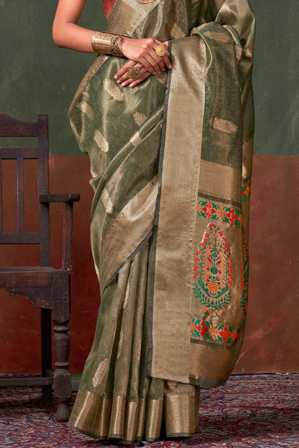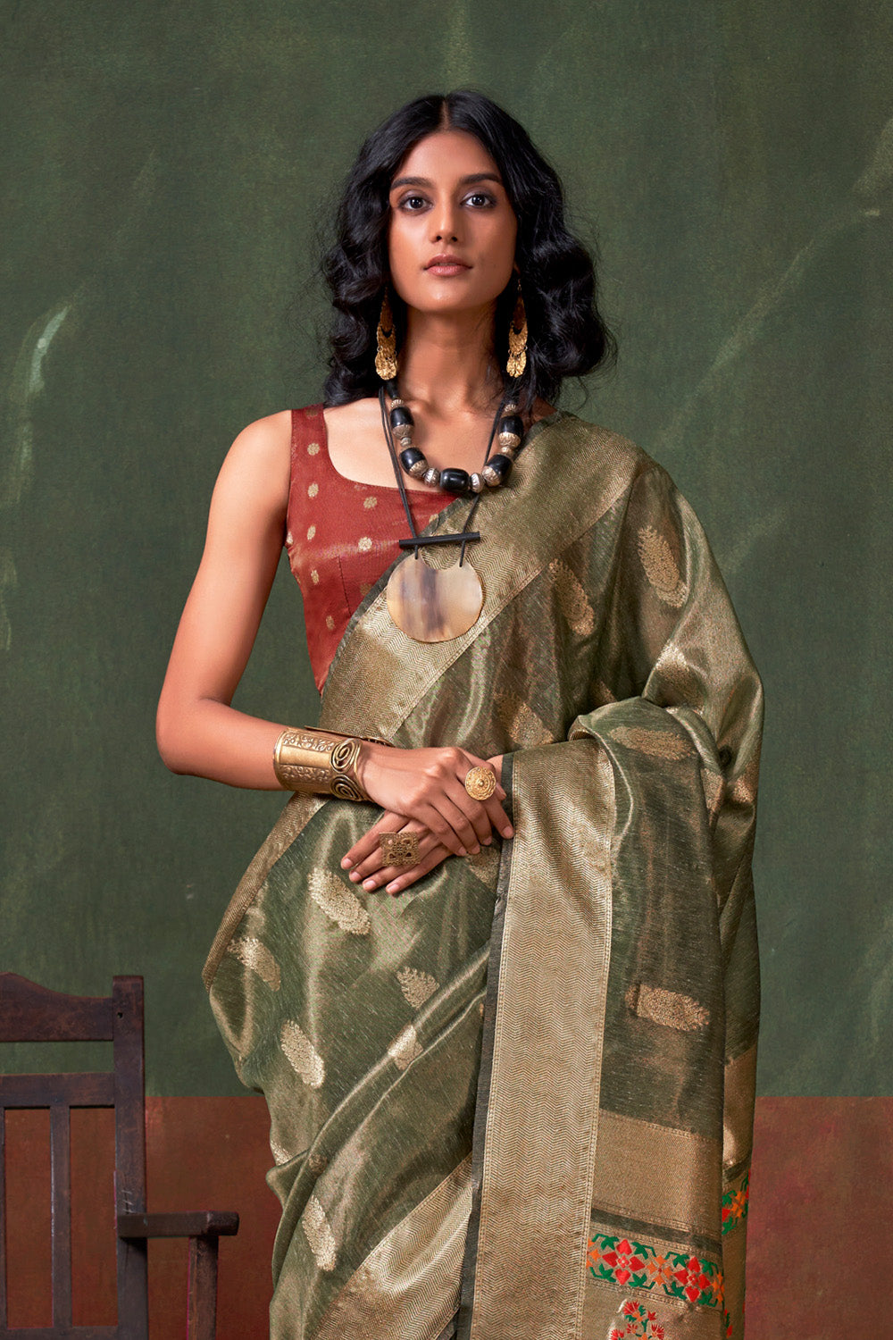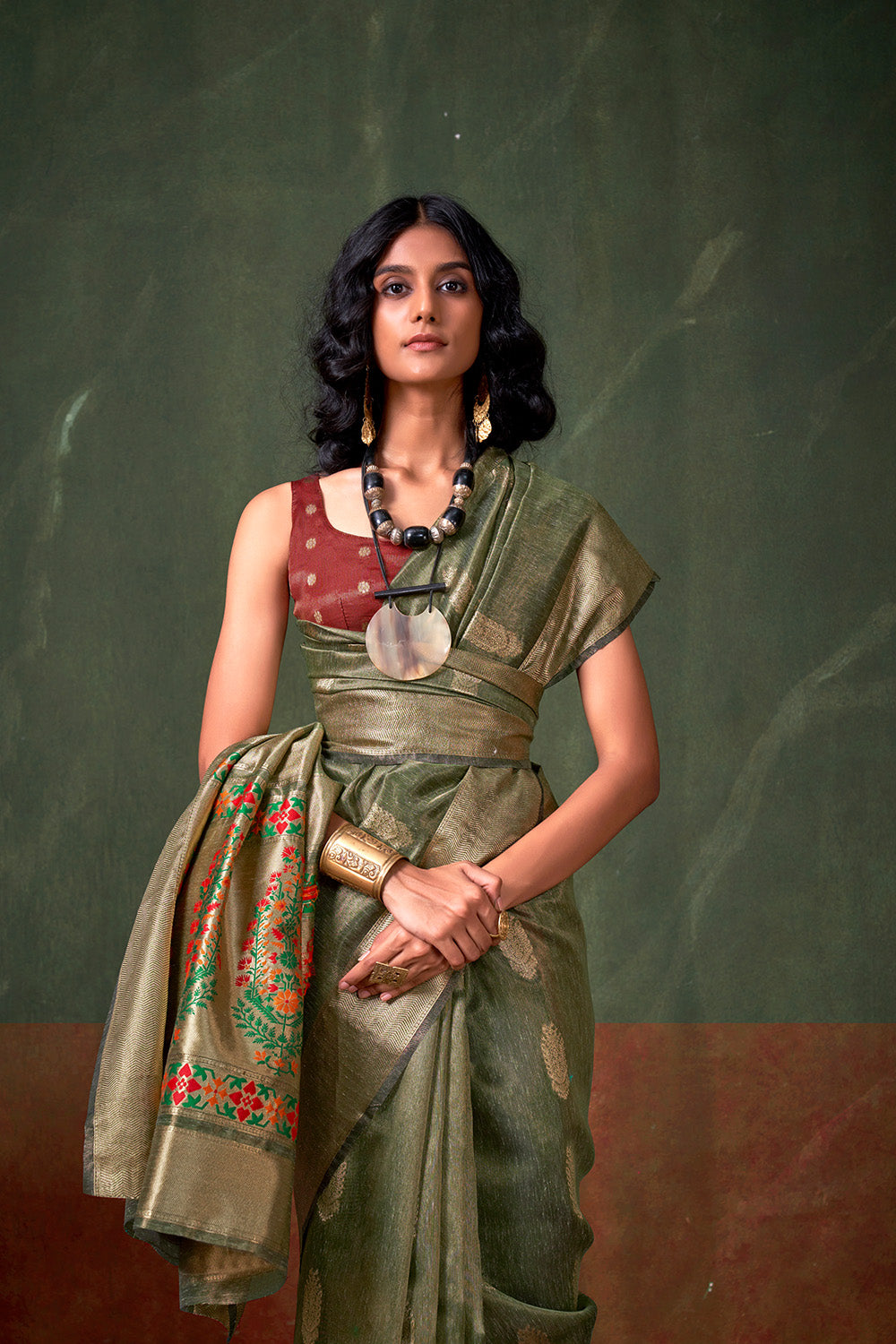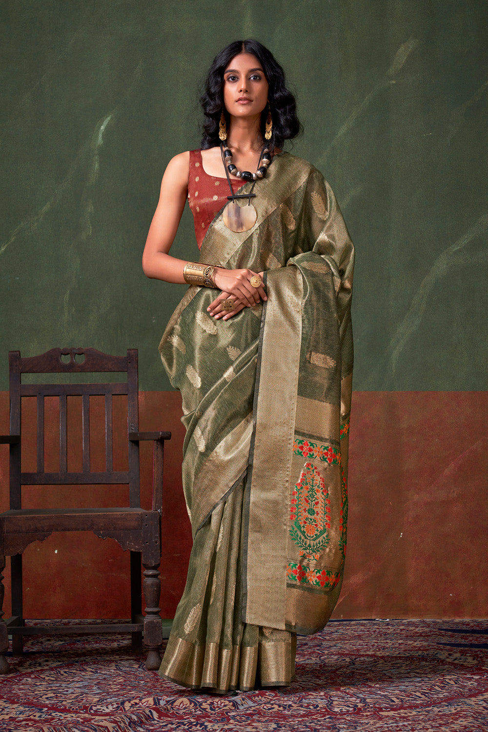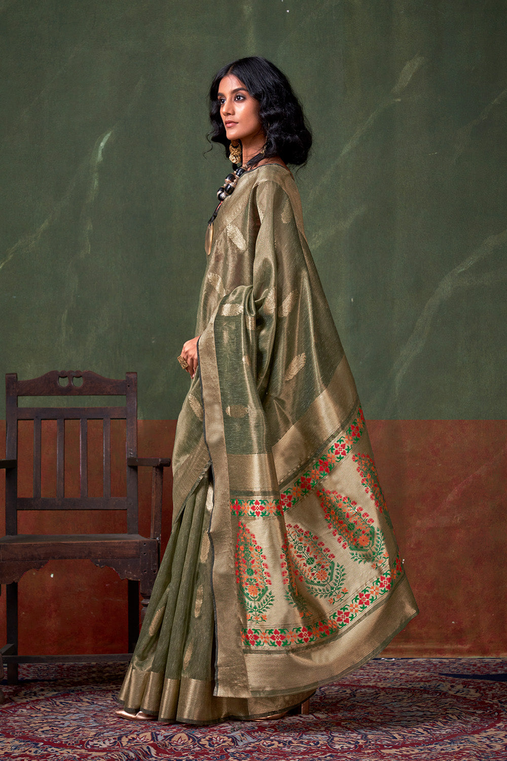 Moss Green Paithani Zari Tissue Saree With Blouse