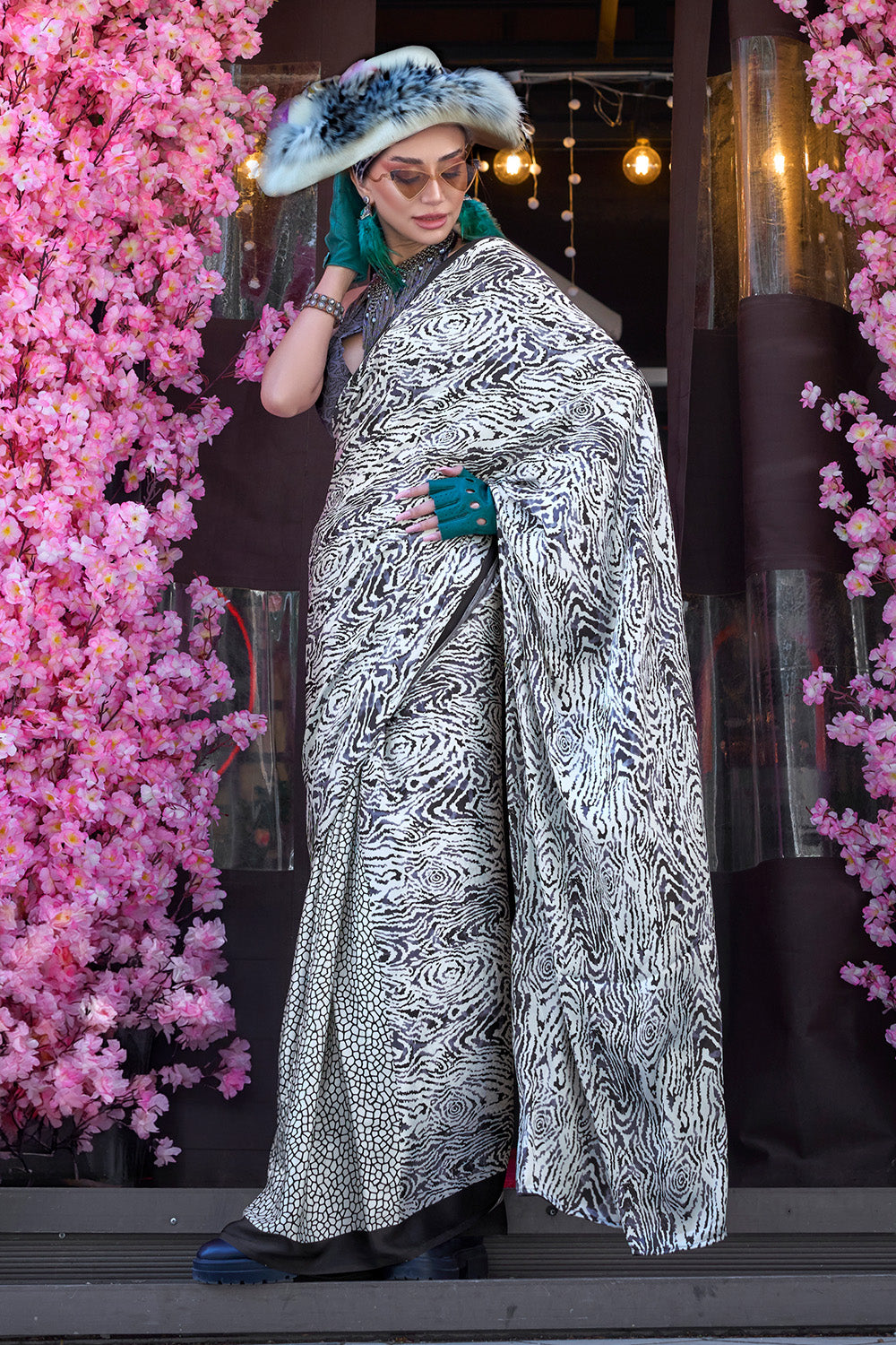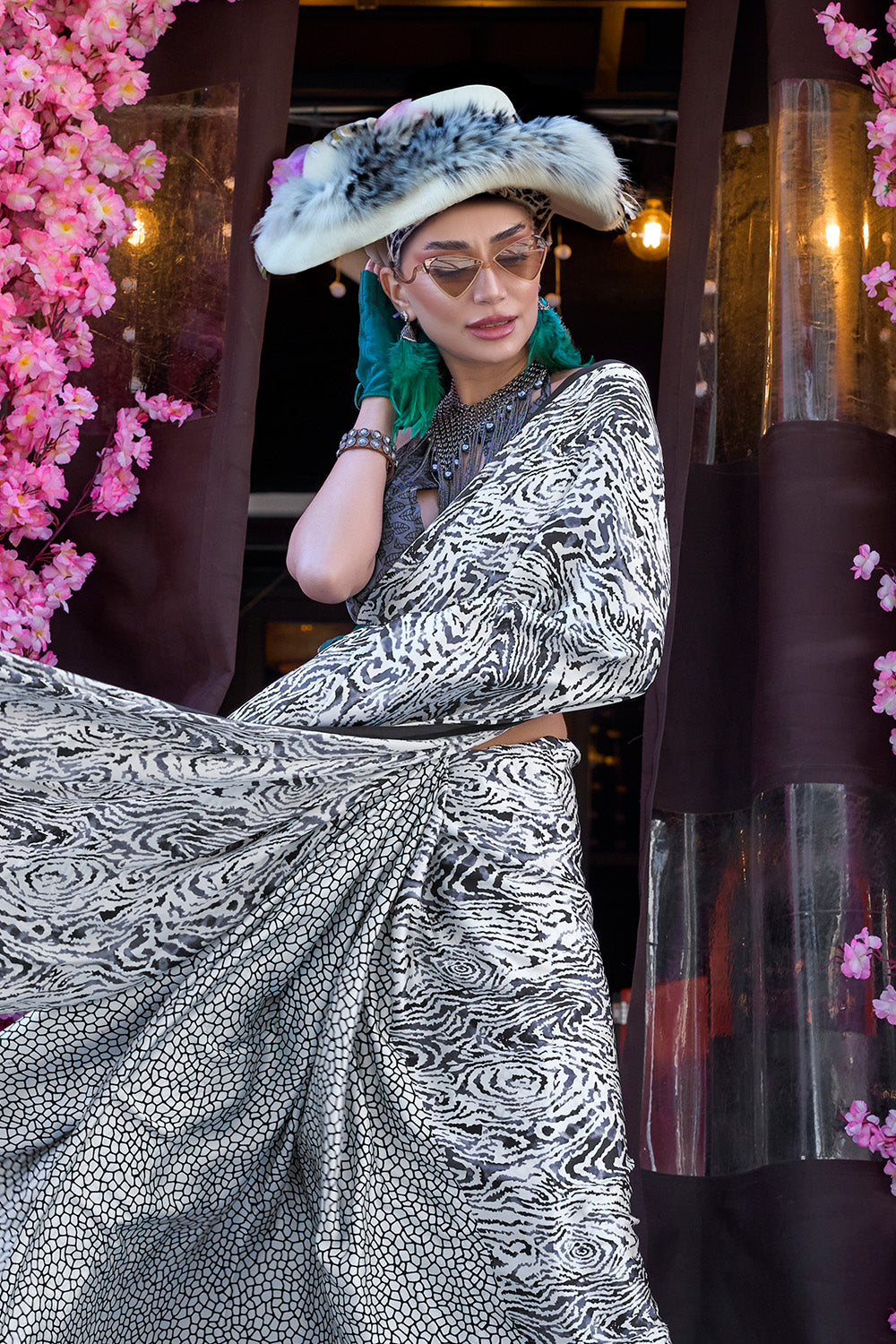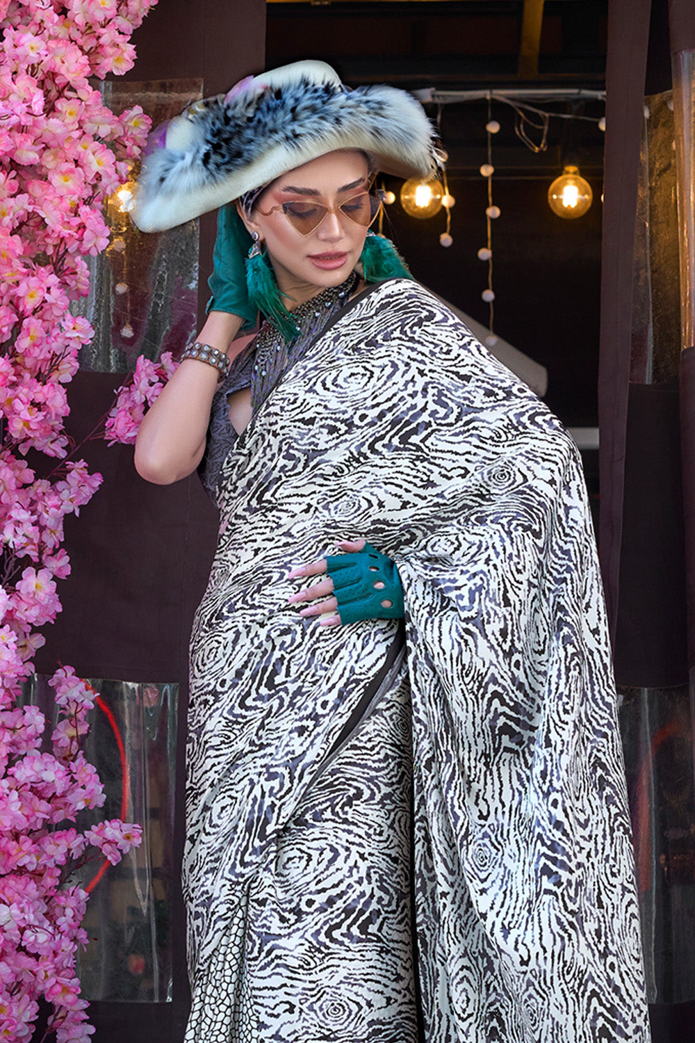 Discover the perfect blend of modern and traditional in our contemporary print satin crepe sarees. With stunning contemporary prints and luxurious satin crepe fabric, this saree is perfect for any occasion. Complete the look with the included grey blouse. Elevate your style with our contemporary print satin crepe sarees.