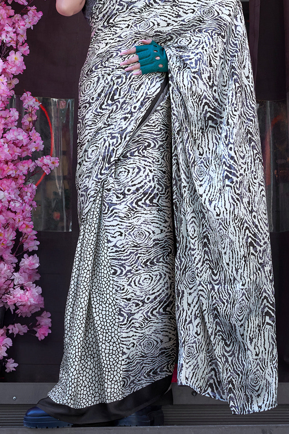 Multicolor Print Satin Crepe Sarees With Grey Blouse