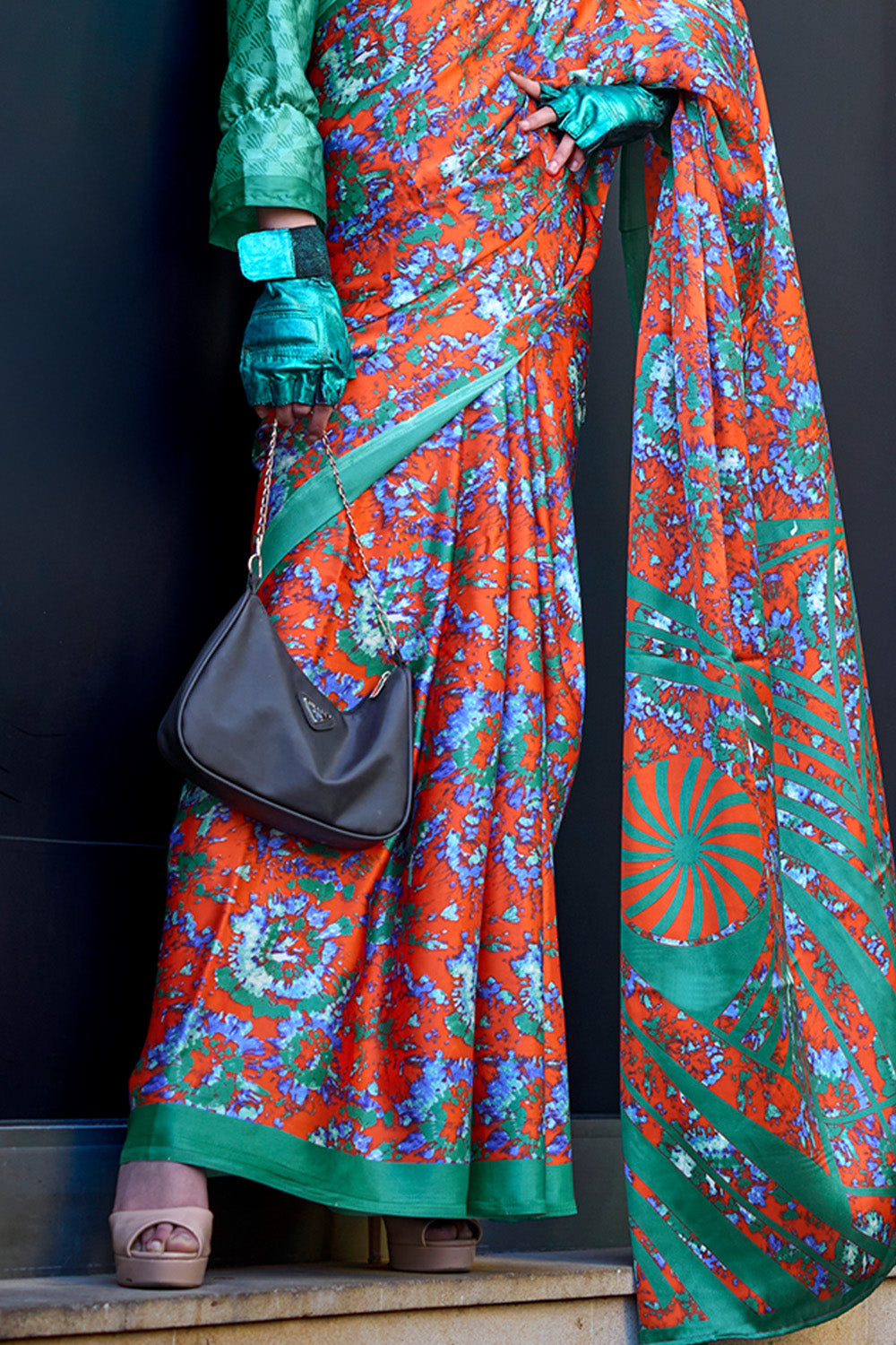 Multicolor Print Satin Crepe Sarees With Green Blouse