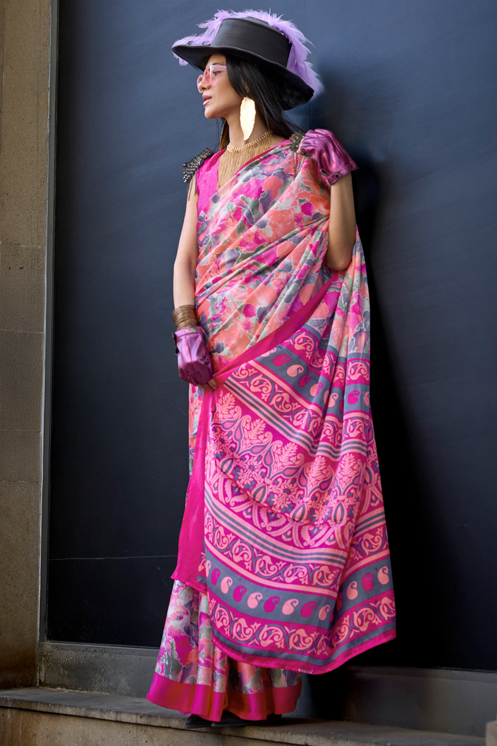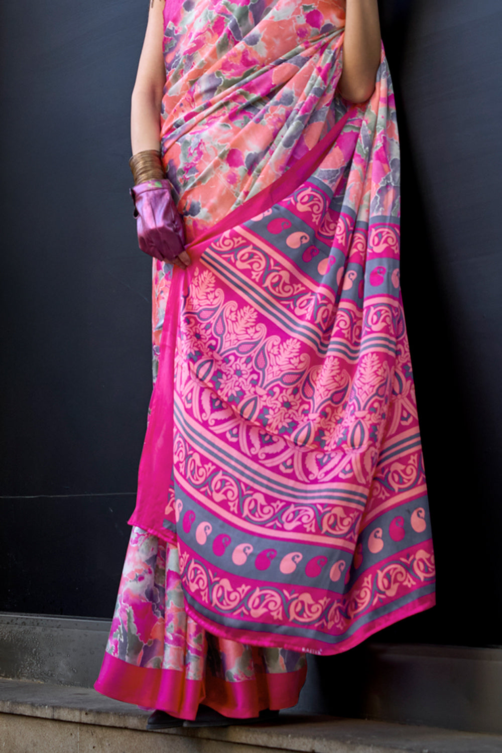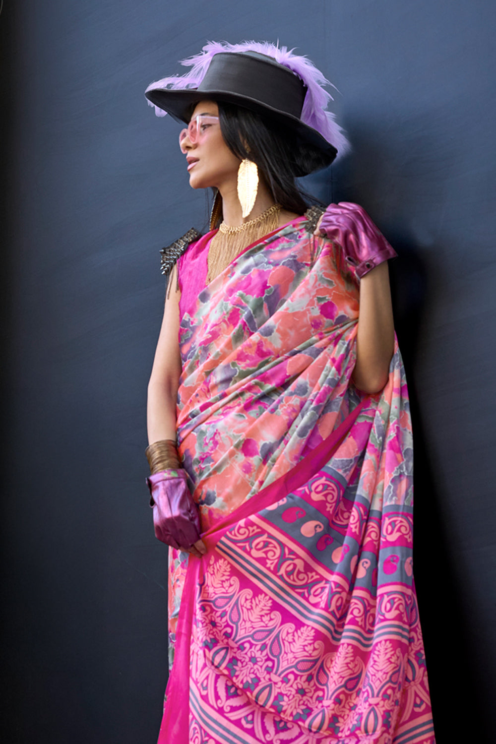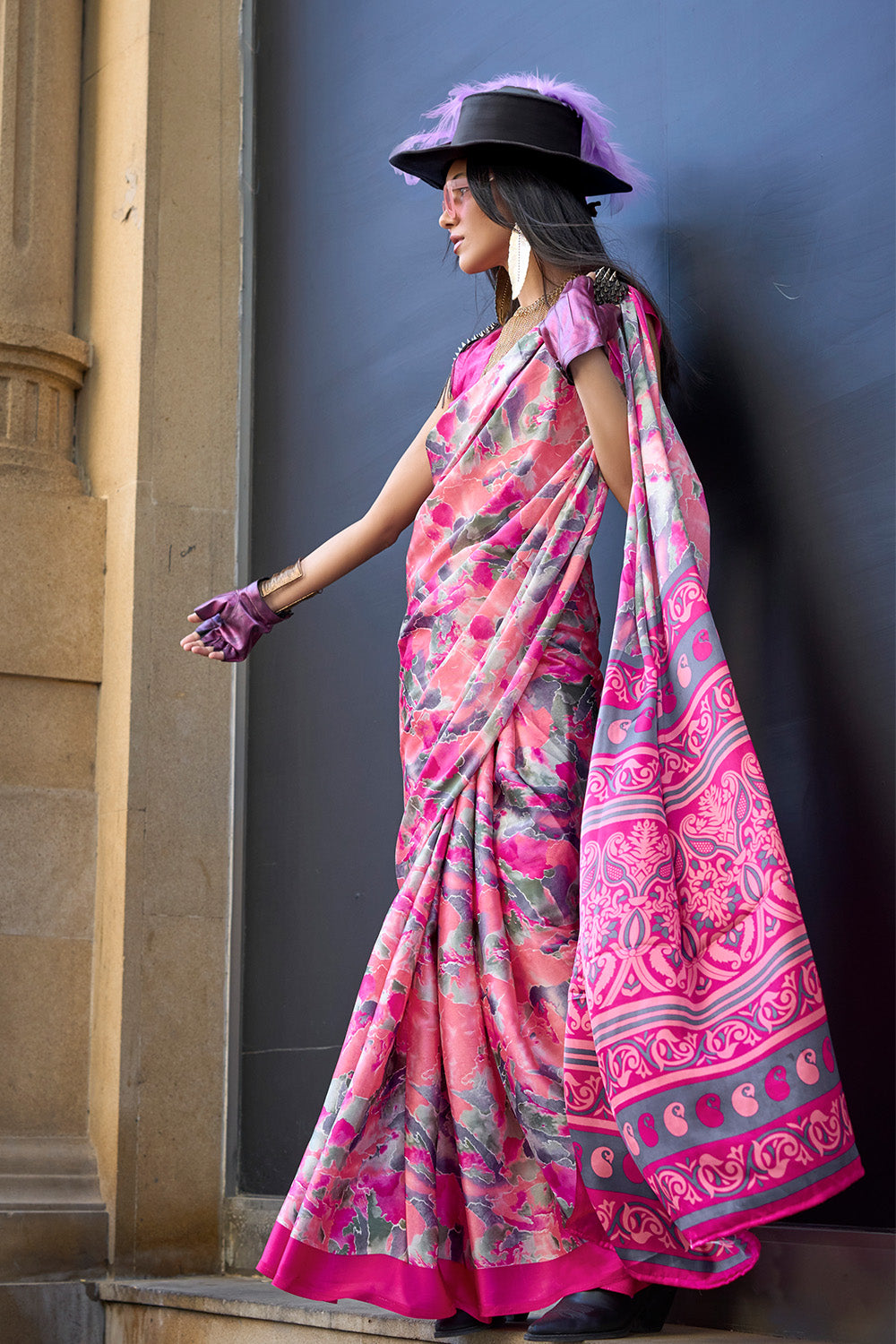 Multicolor Print Satin Crepe Sarees With Pink Blouse