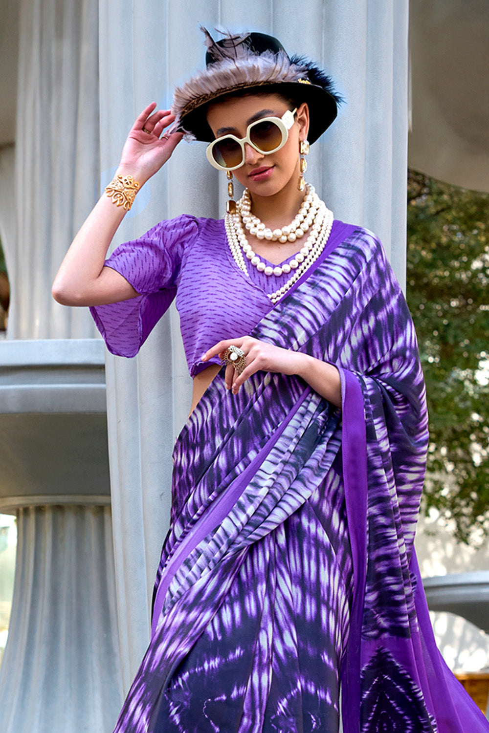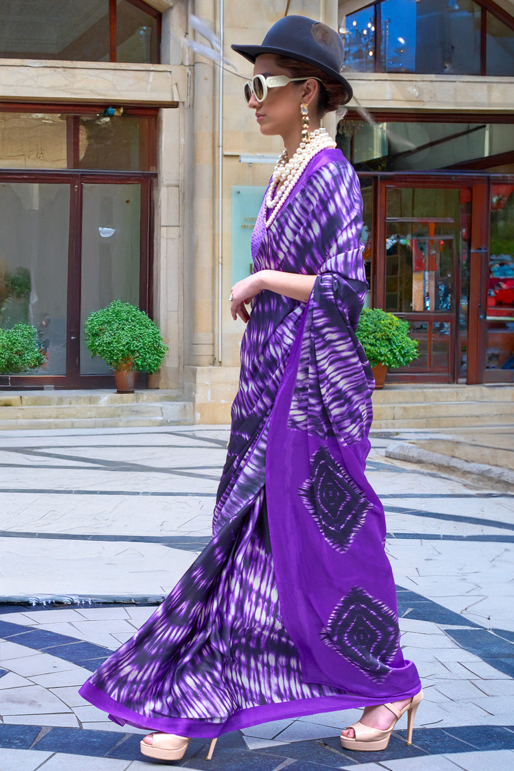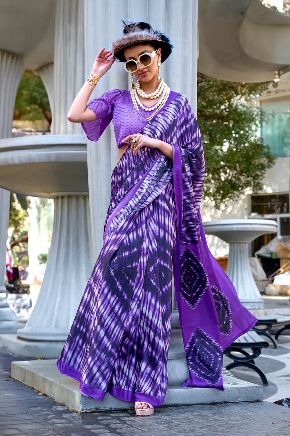 Multicolor Print Satin Crepe Sarees With Purple Blouse