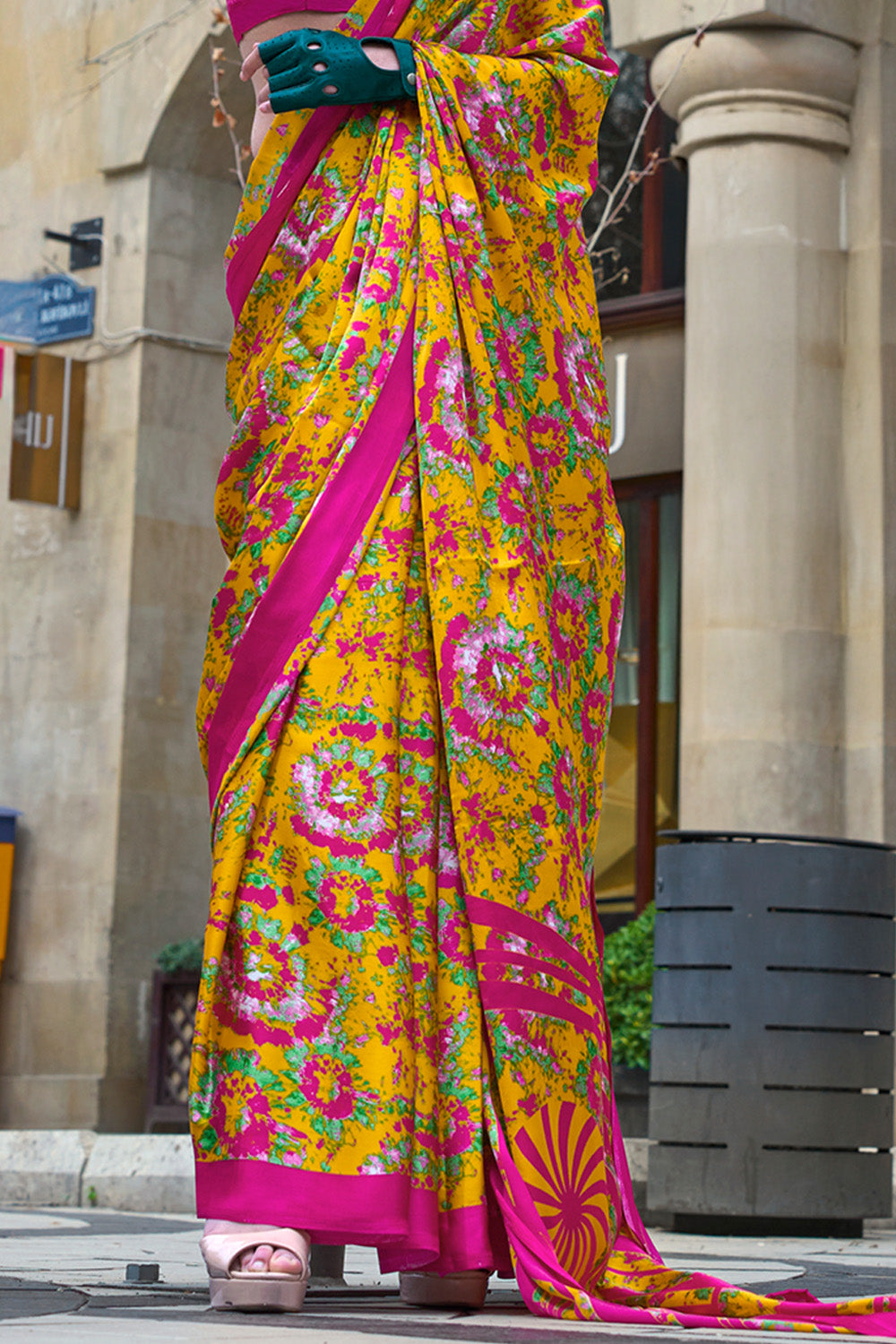 Multicolor Print Satin Crepe Sarees With Yellow Blouse