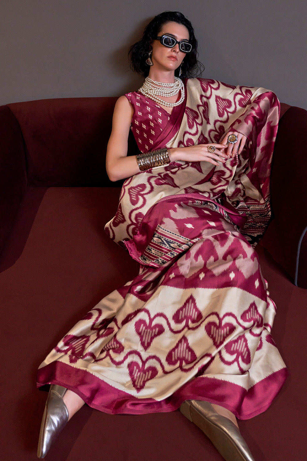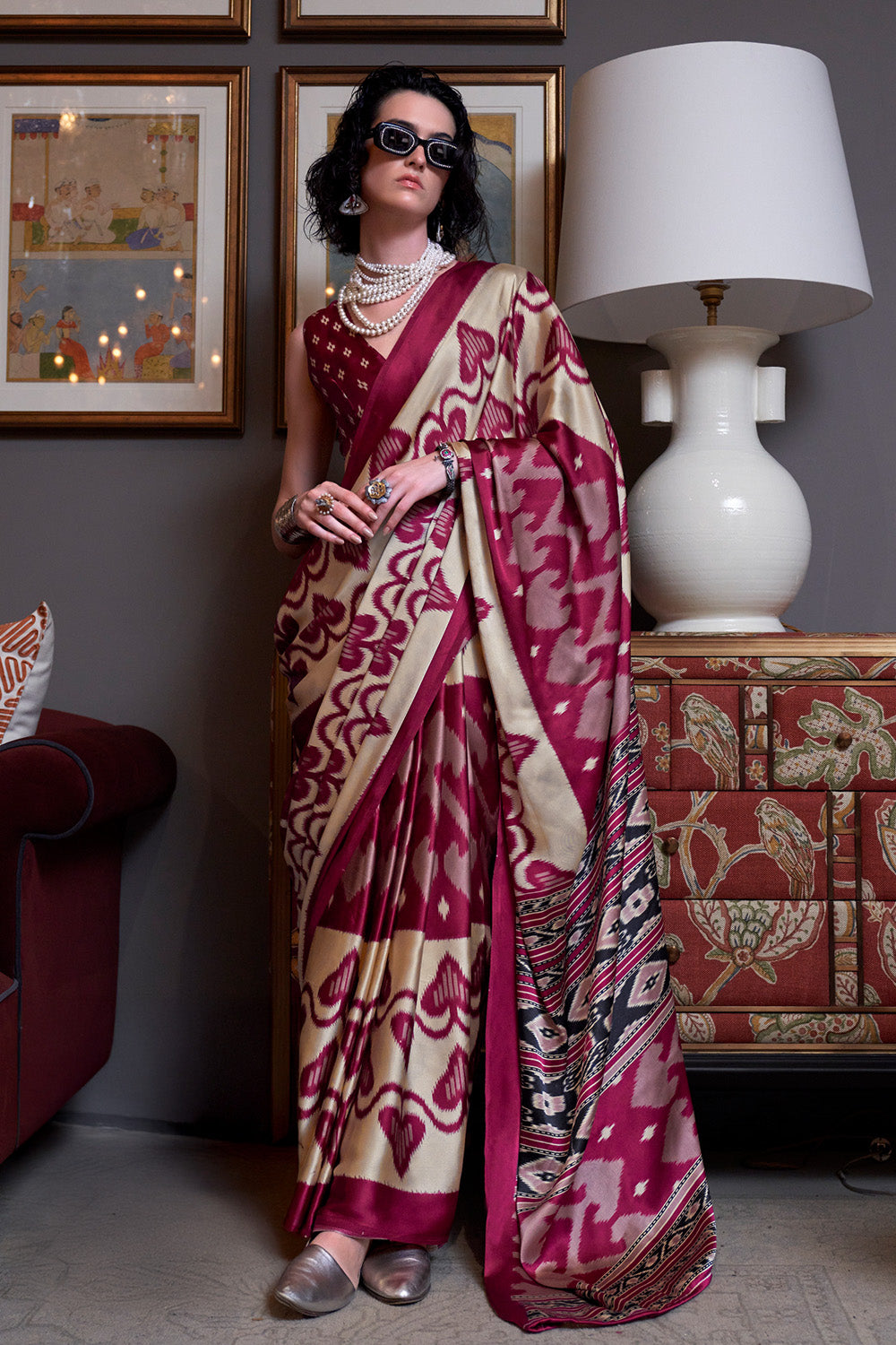 Multicolor Pocampalli Printed Satin Sarees Red Blouse