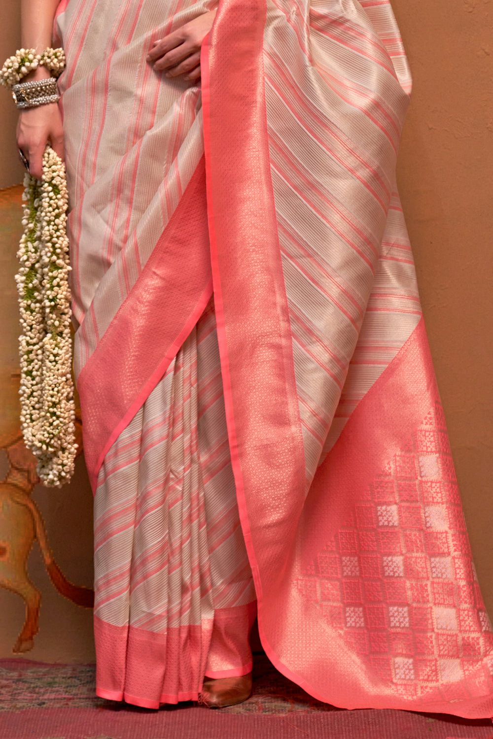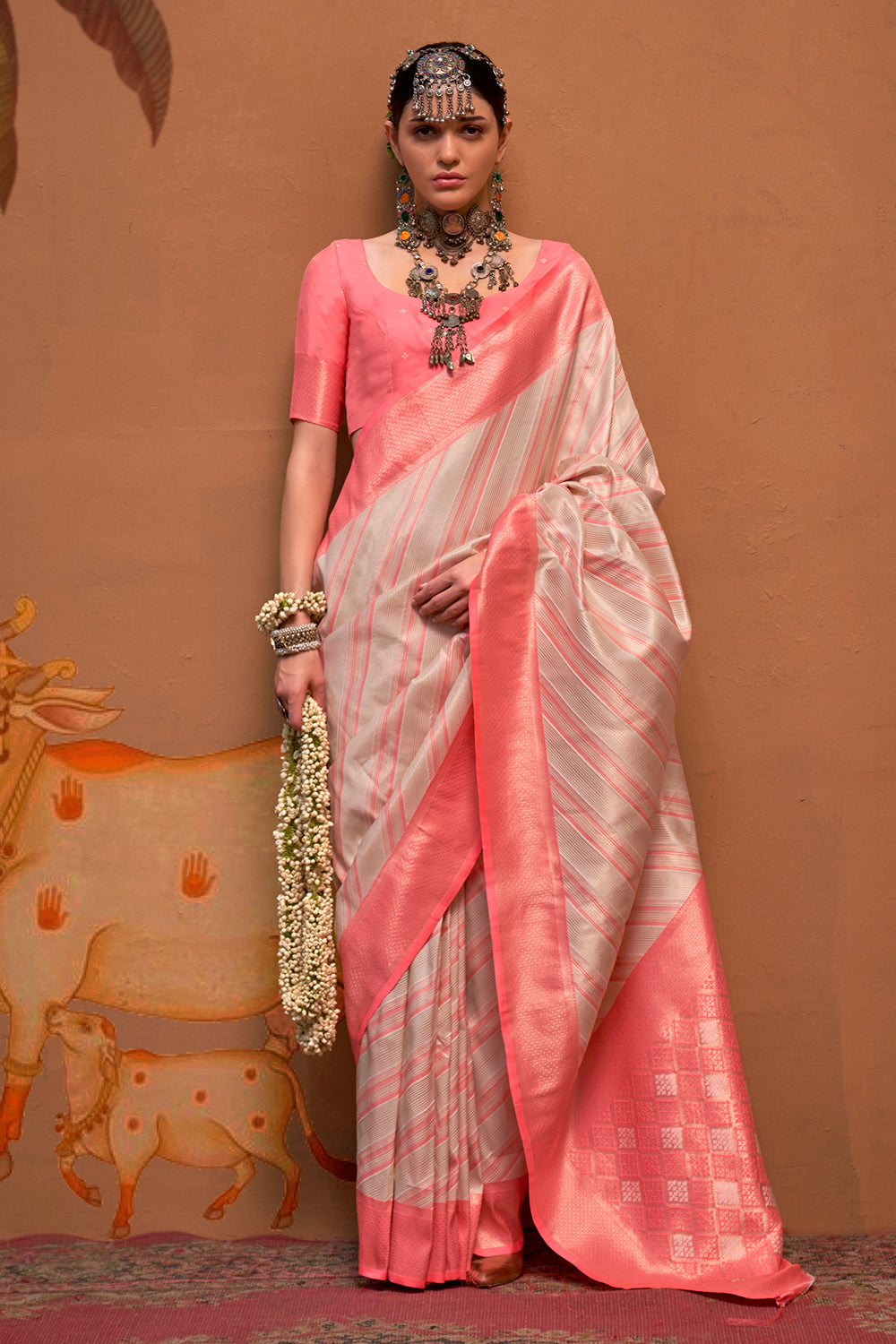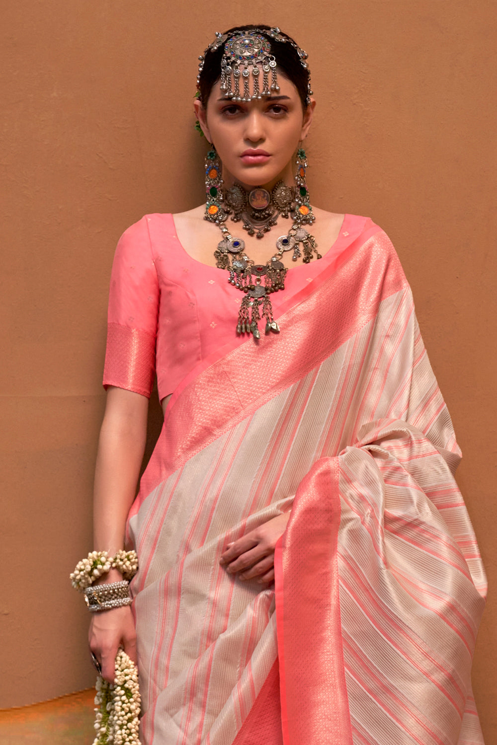 Multicolor Striped Woven Saree With Beige Blouse