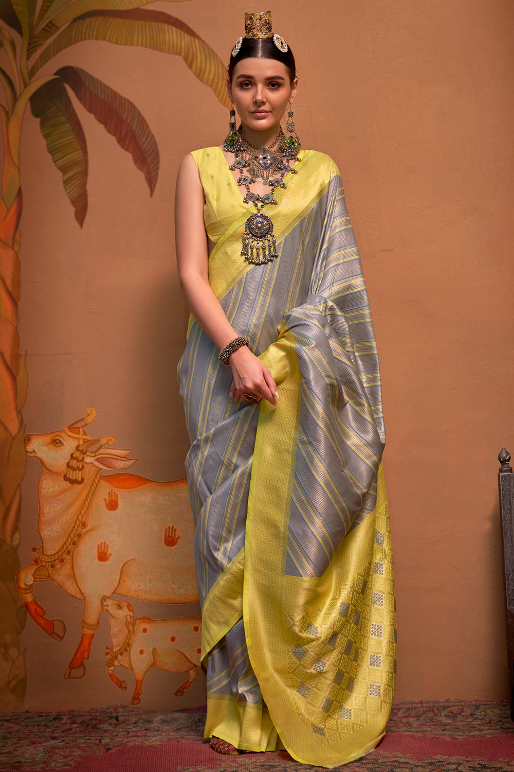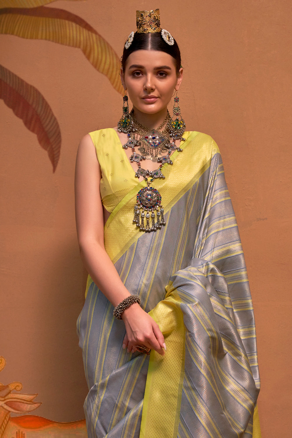 Multicolor Striped Woven Saree With Grey Blouse