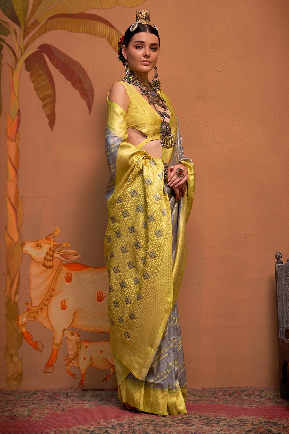 This multicolor striped woven saree features a vibrant and versatile design, perfect for any occasion. The yellow blouse adds a pop of color and complements the stripes beautifully. With its traditional yet modern look, this saree is a must-have for any wardrobe.