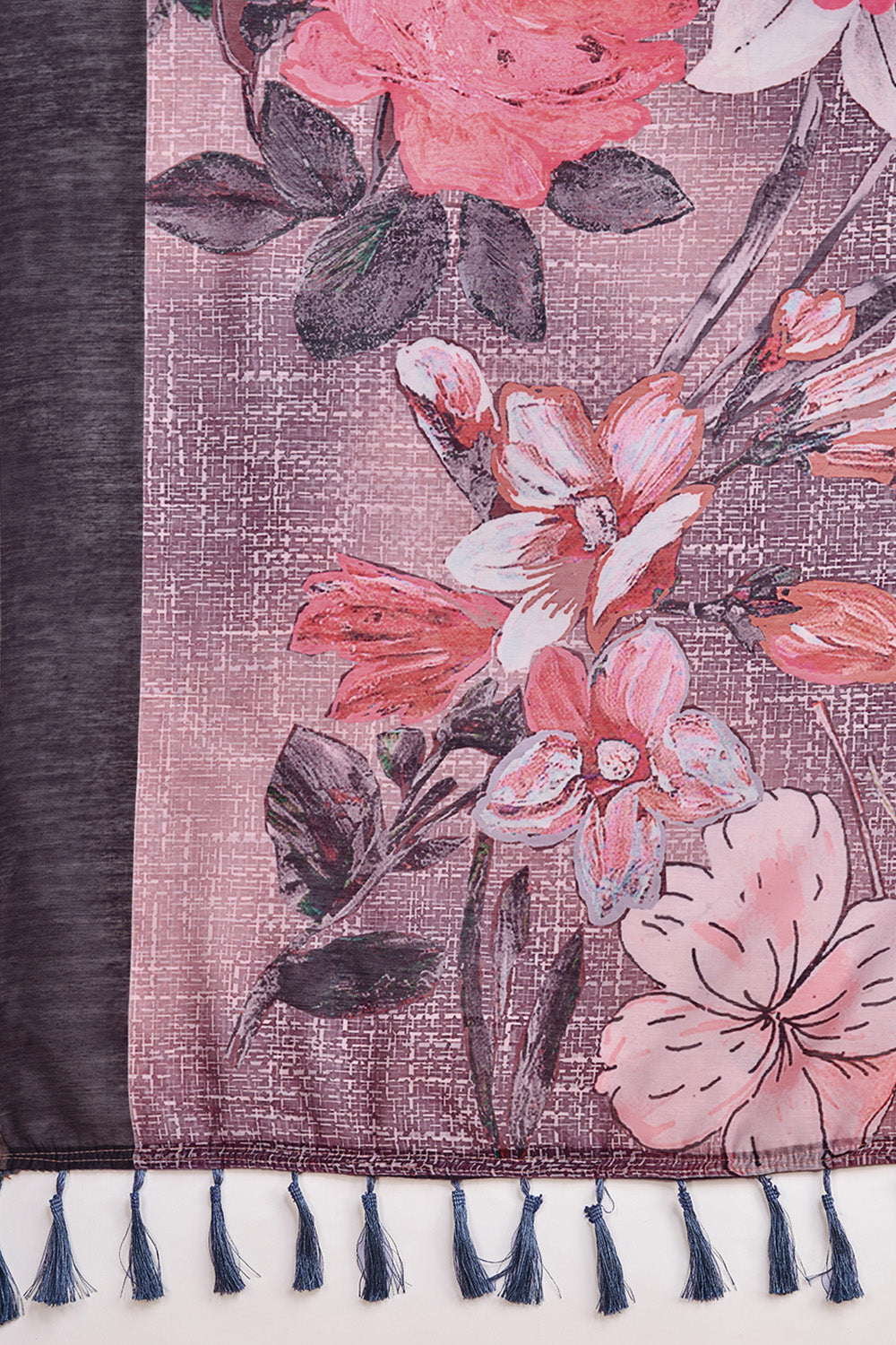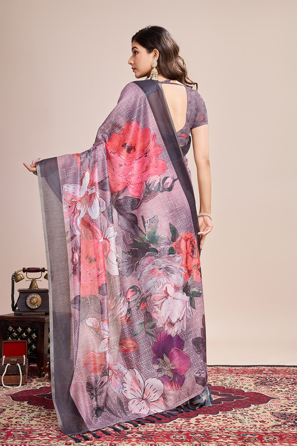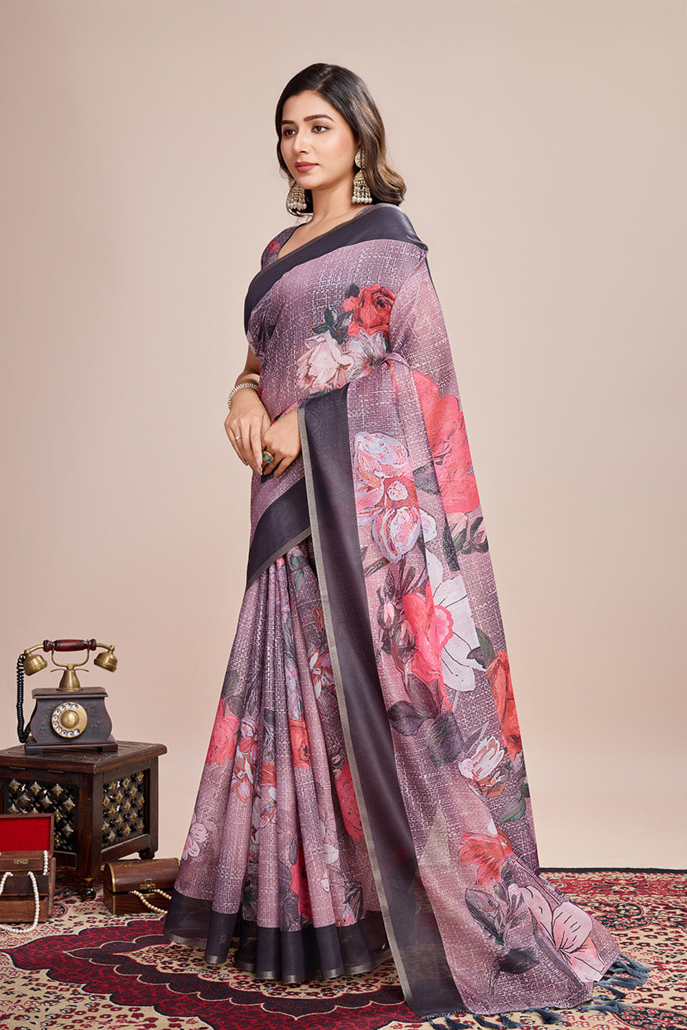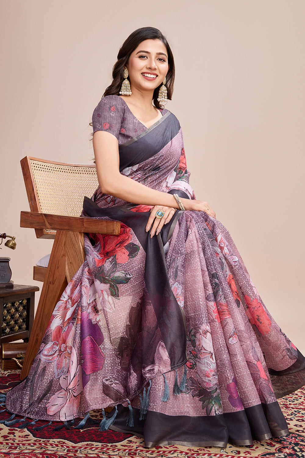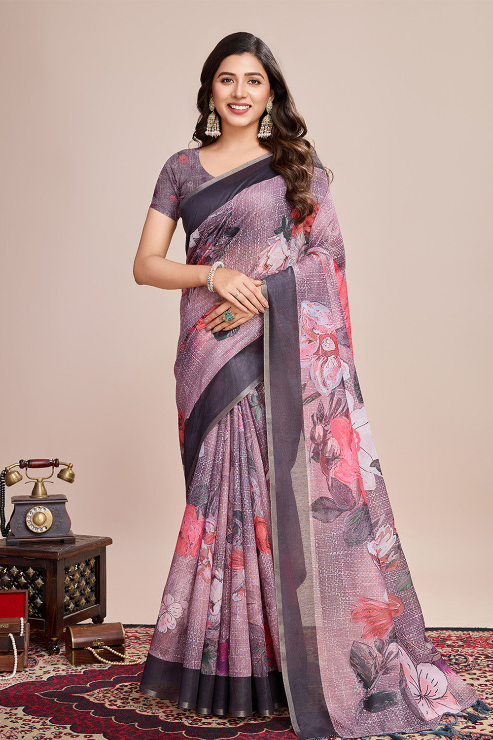 This multicolor saree features a stunning printed design and a delicate zari border, adding a touch of elegance. Paired with a matching blouse, it offers the perfect combination of traditional and modern style. Stand out in this versatile and vibrant piece.