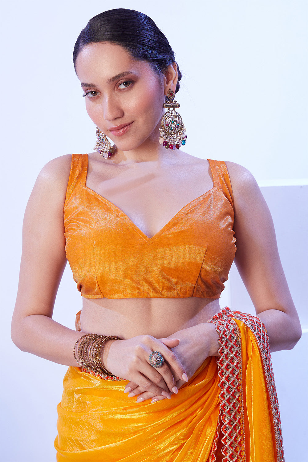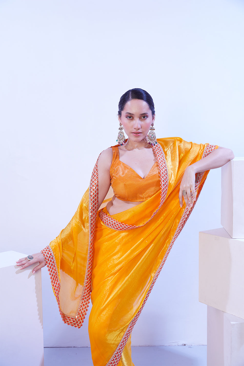 Expertly crafted from blooming satin, this Mustard Saree exudes elegance and grace. Its intricate lace detailing adds a touch of femininity, while the unstitched blouse allows for a customizable fit. Elevate your style with this luxurious and versatile piece.