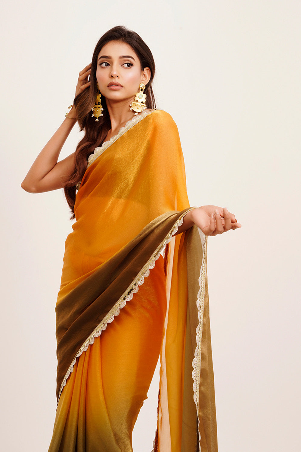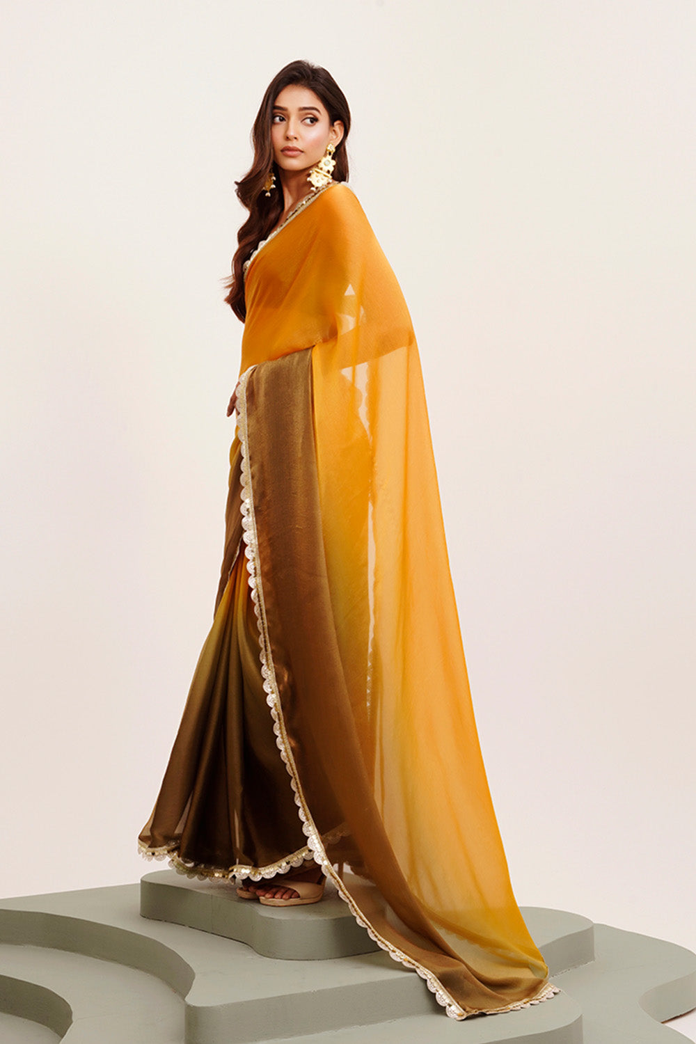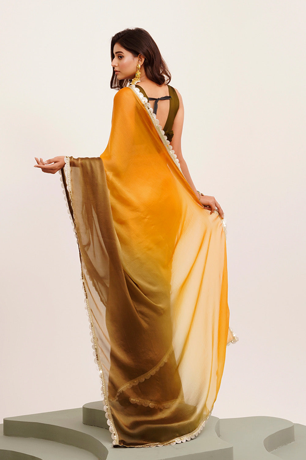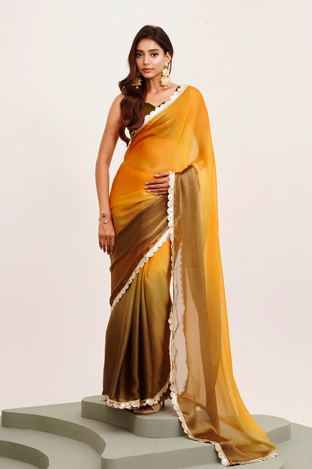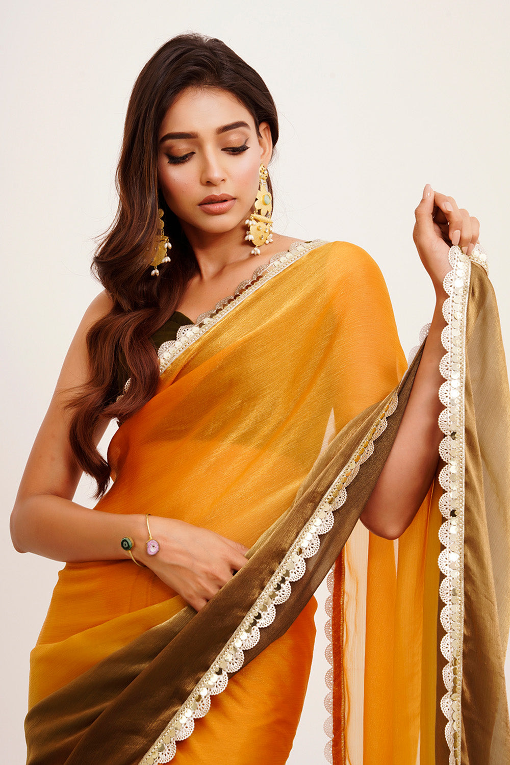 Elevate your ethnic wardrobe with this Mustard Sequinned Chiffon Saree, paired with a matching blouse. Crafted from lightweight chiffon, it offers graceful draping and comfort for extended wear. The intricate sequinned work adds a subtle shimmer, perfect for festive occasions and evening events. This saree balances elegance and ease, making it a refined choice for those seeking sophisticated traditional attire.