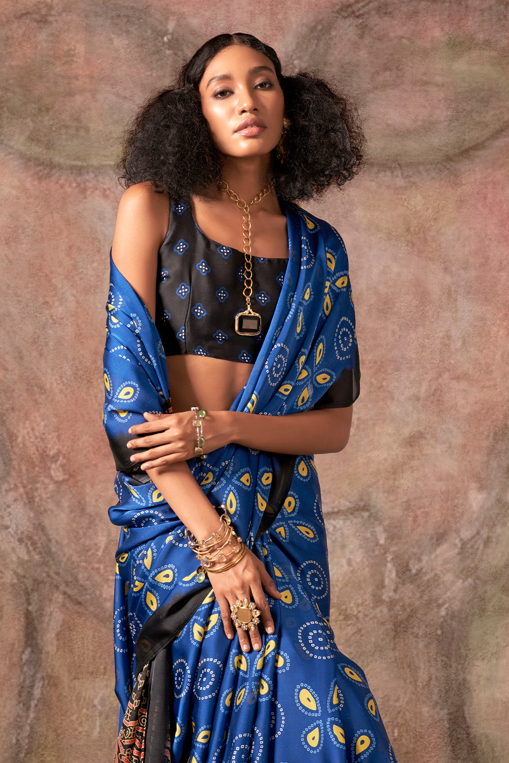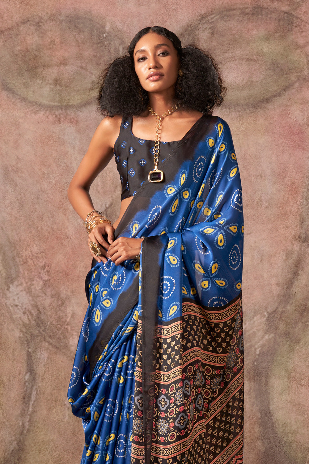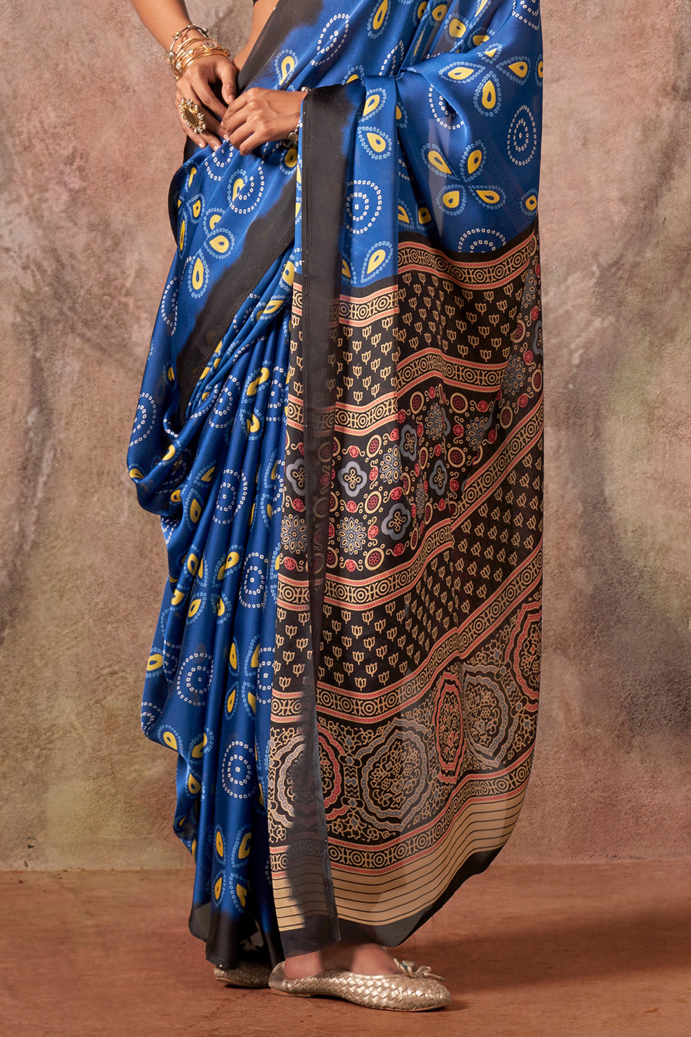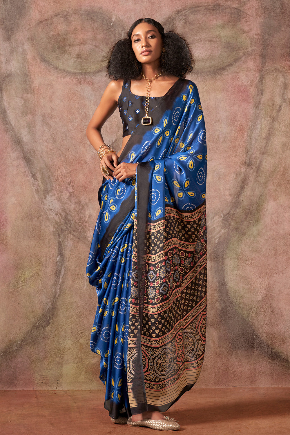 Navy Blue Ajrakh Print Satin Georgette Saree With Blouse