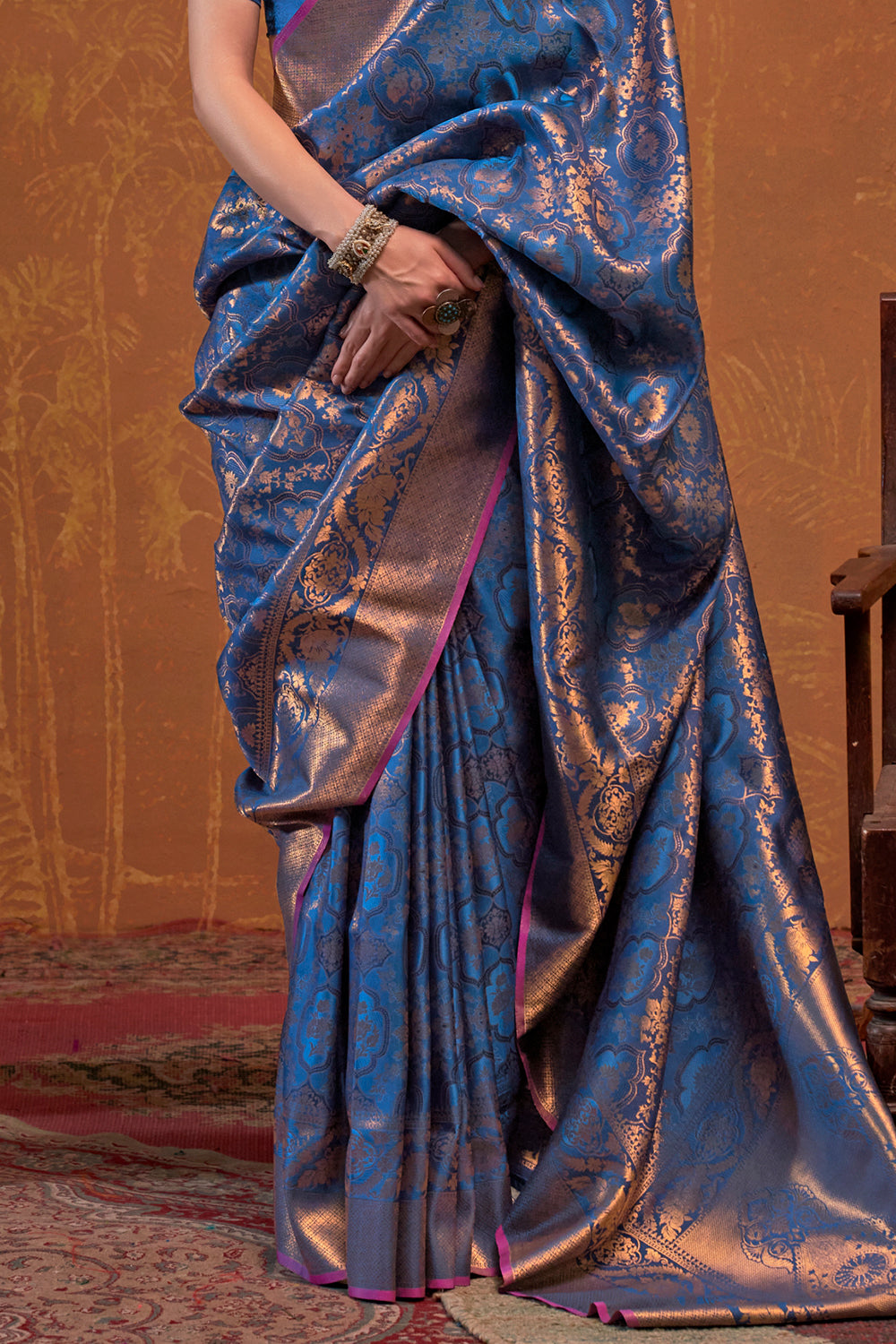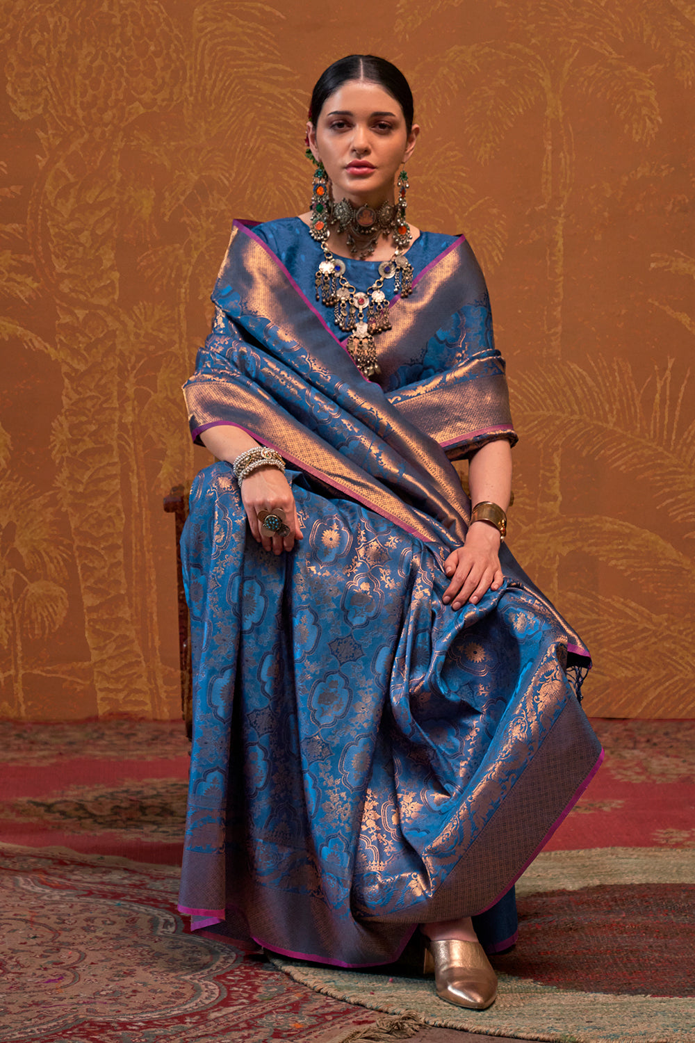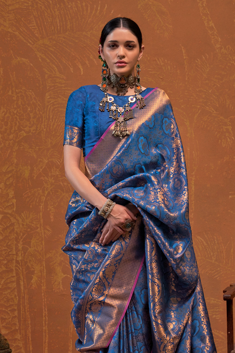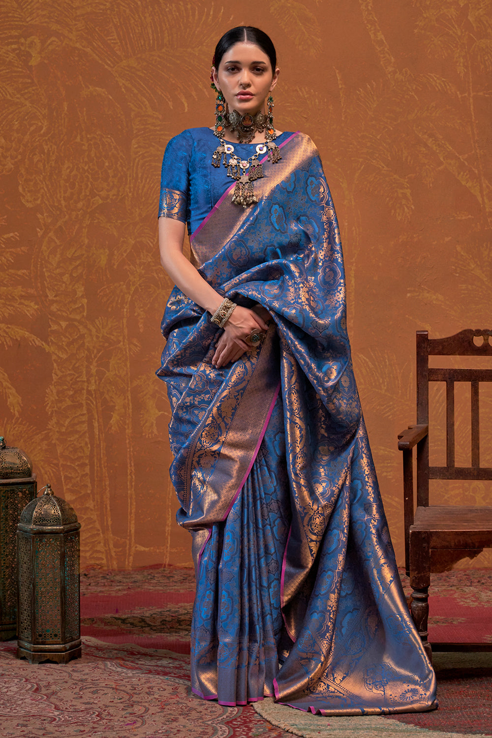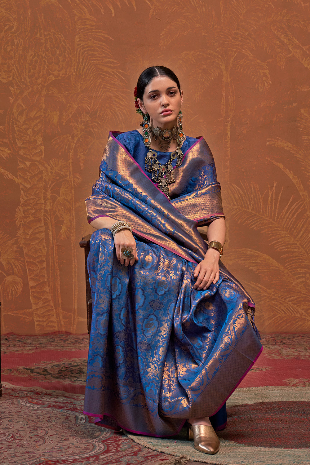 This navy blue banarasi motif saree with blouse is a stunning addition to your wardrobe. Made with traditional banarasi motifs and a rich, deep navy blue color, this saree exudes elegance and sophistication. Its lightweight and comfortable fabric makes it perfect for any occasion, while the included blouse completes the look. Elevate your style with this timeless saree.