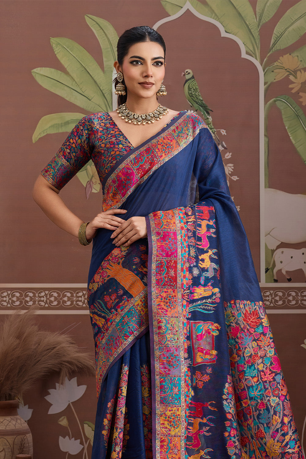 Experience elegance with this Navy Blue Pashmani Design Saree, expertly crafted to showcase intricate patterns that blend tradition with style. Paired with a matching blouse, this saree offers a refined look perfect for formal occasions or festive events. The rich navy hue enhances the delicate design, providing a timeless appeal while ensuring comfort and grace throughout wear. Ideal for those who appreciate classic craftsmanship combined with contemporary charm.
