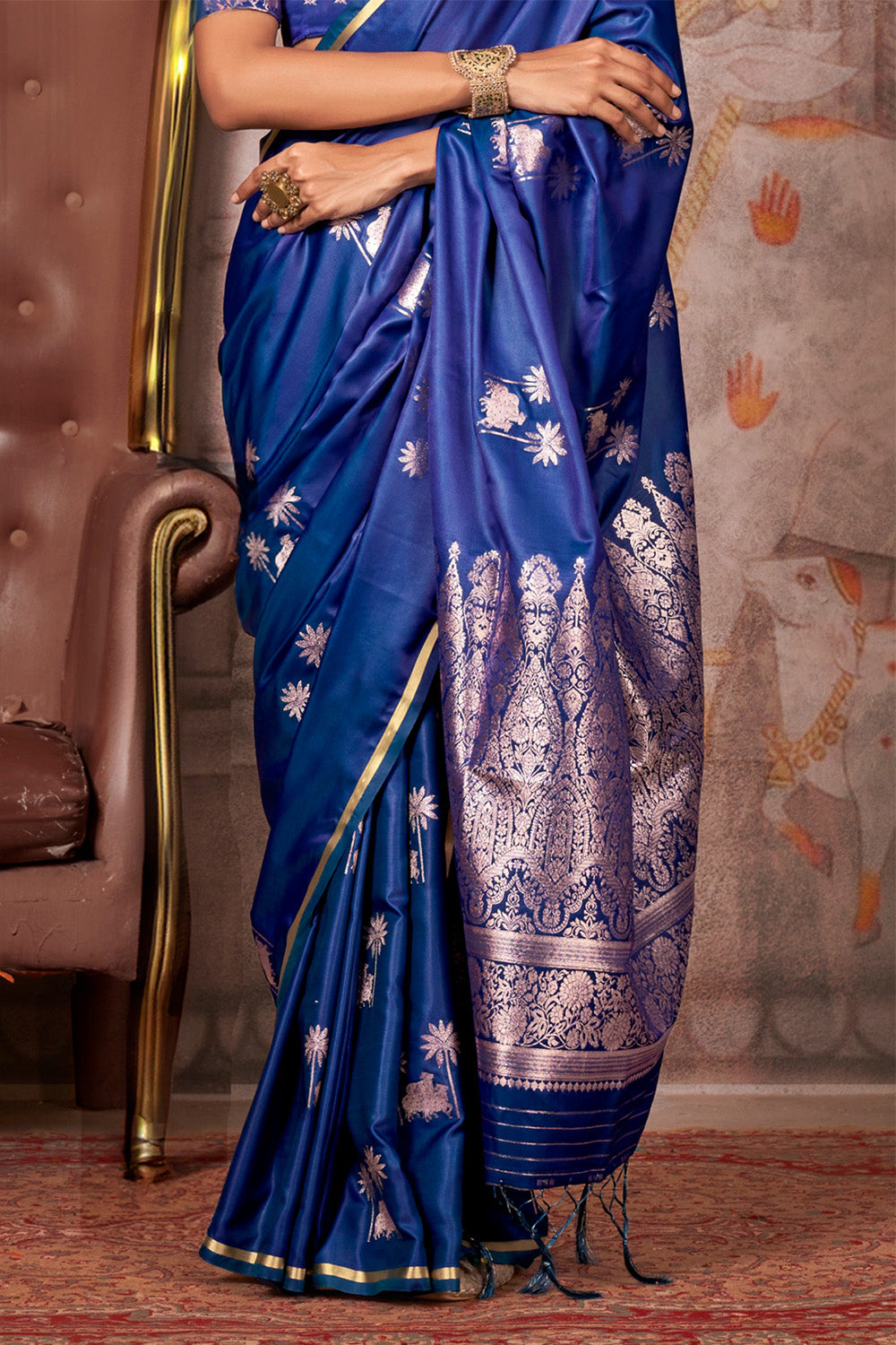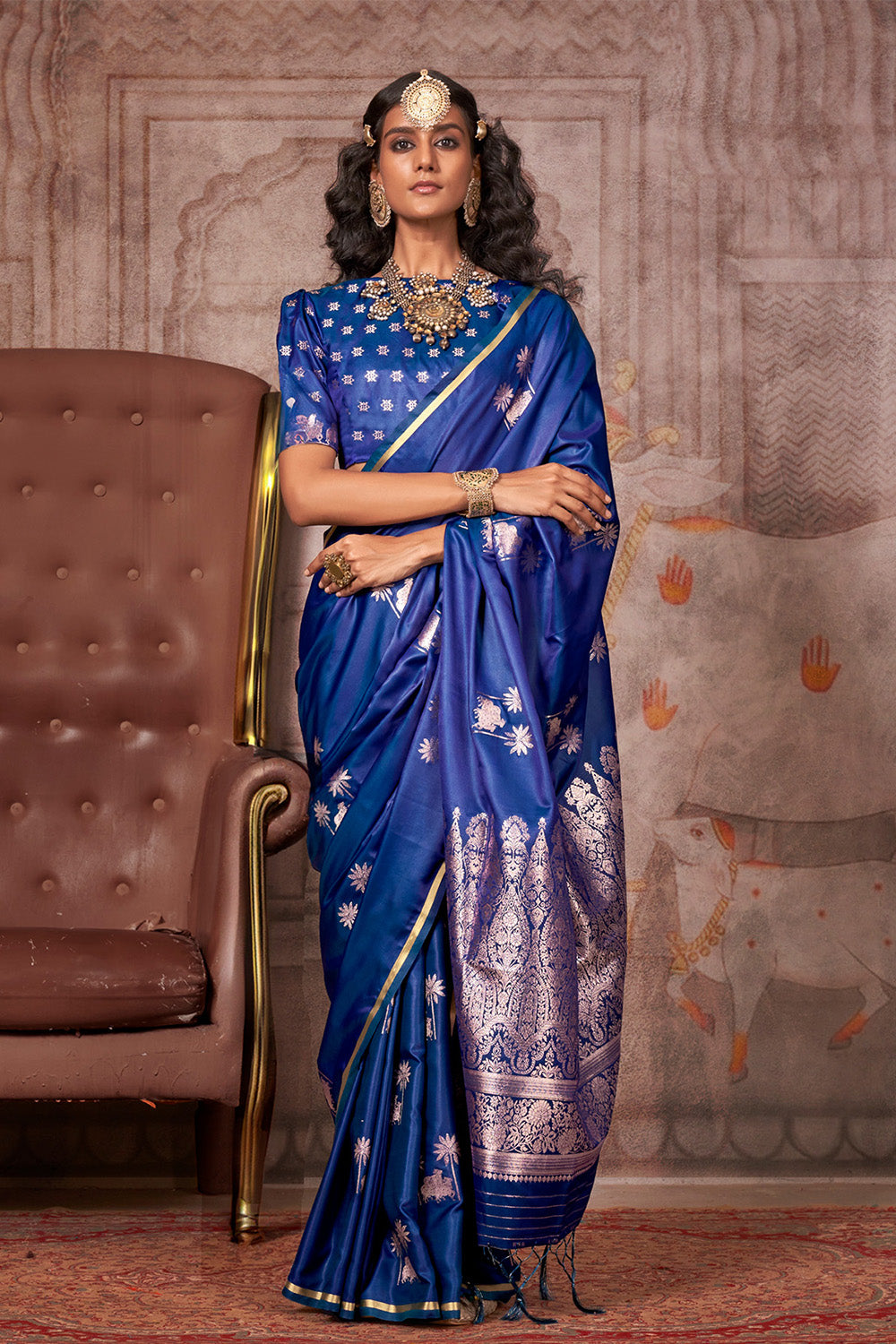 Navy Blue Satin Pichwai Zari Saree With Brocade Blouse