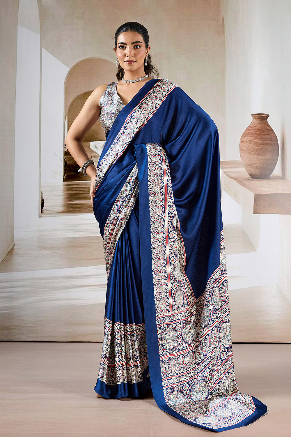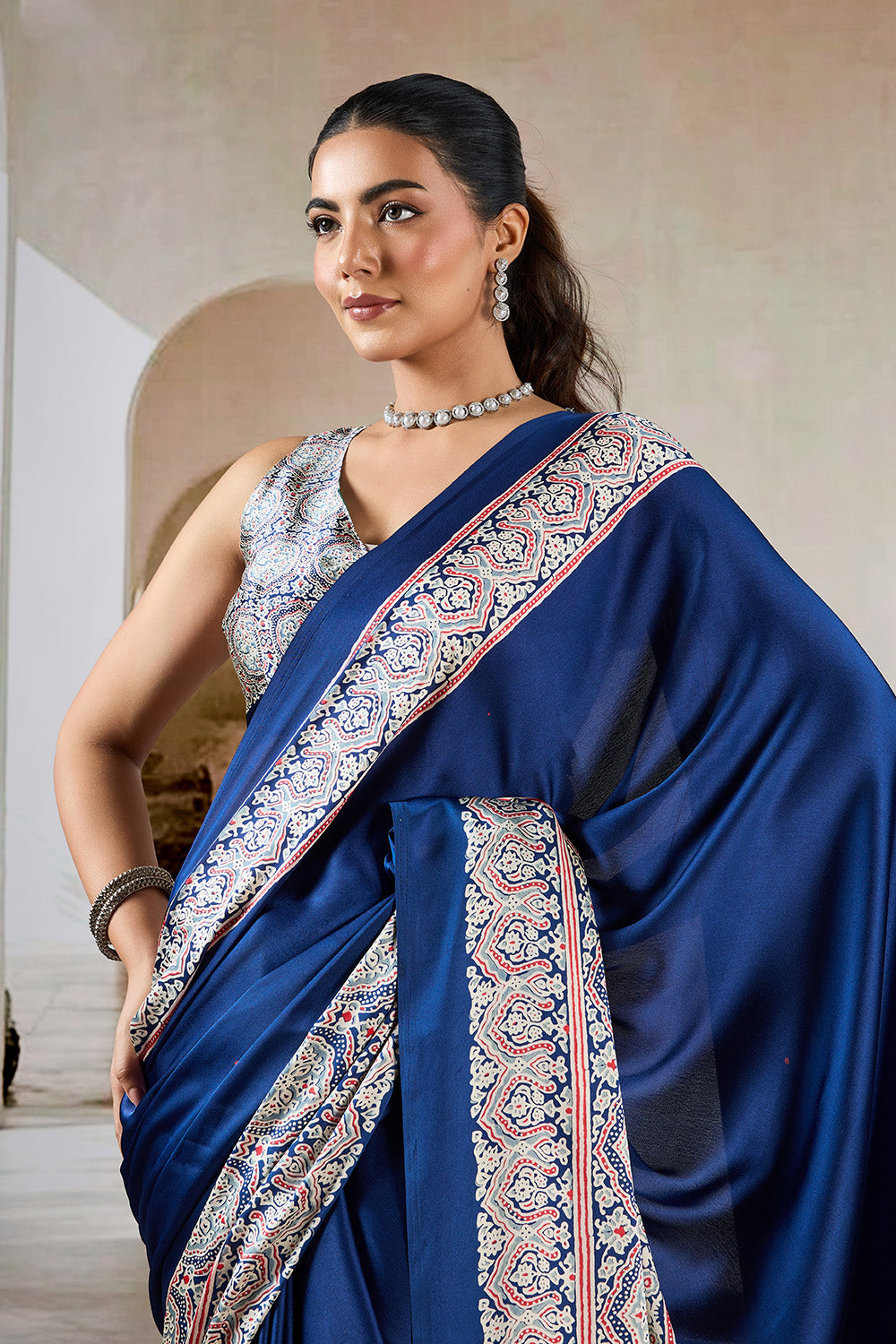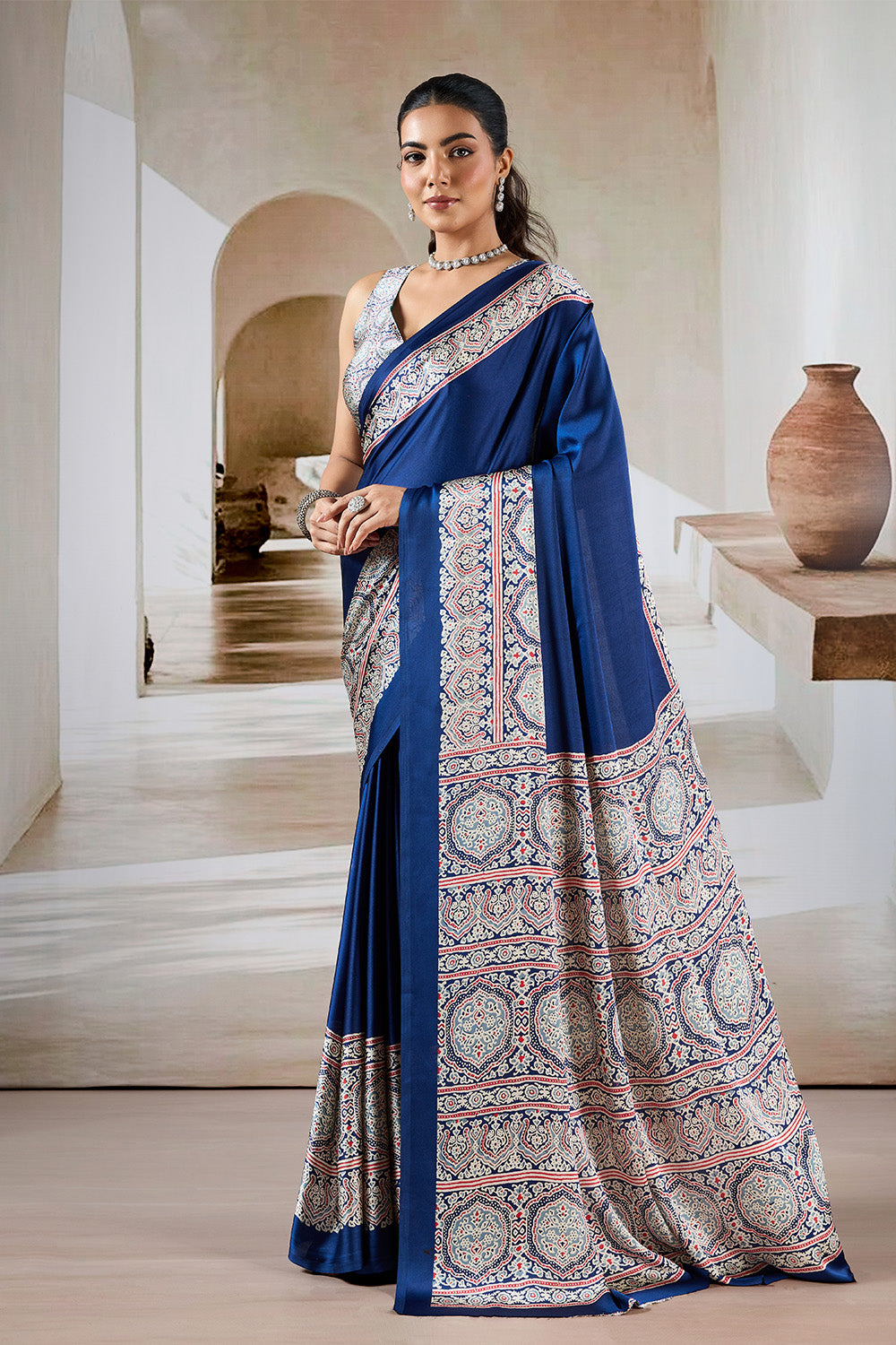 This Navy Printed Ajarakh Satin Crepe Saree exemplifies refined craftsmanship with its traditional Ajarakh motifs printed on a luxurious satin crepe fabric. The deep navy hue enhances the intricate patterns, while the smooth texture ensures an elegant drape and comfortable wear. Ideal for formal occasions, this saree combines heritage design with contemporary fabric quality, offering a sophisticated and timeless addition to your wardrobe.