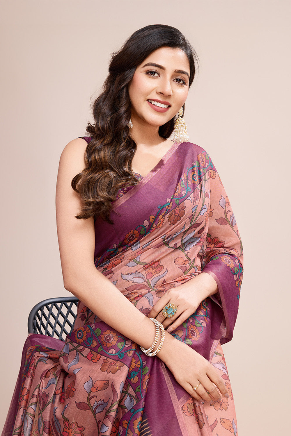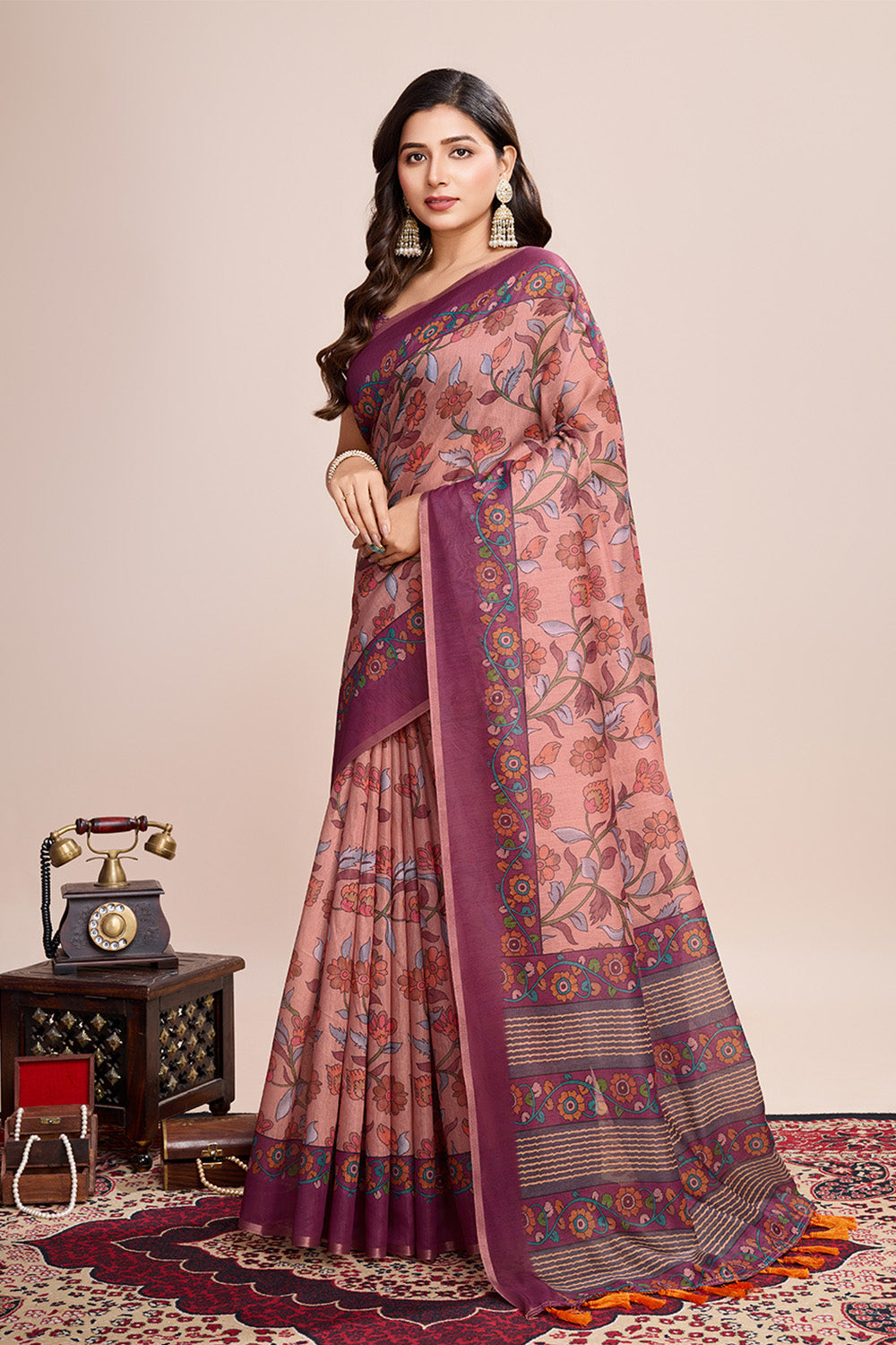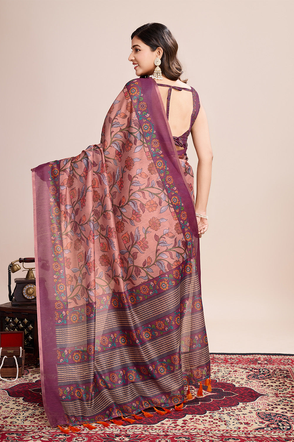 Effortlessly elevate your style with our off orange printed saree. Made with a beautiful zari border, this saree exudes elegance. The vibrant color and intricate print are sure to turn heads. Complete with a matching blouse, this saree is perfect for both casual and special occasions.