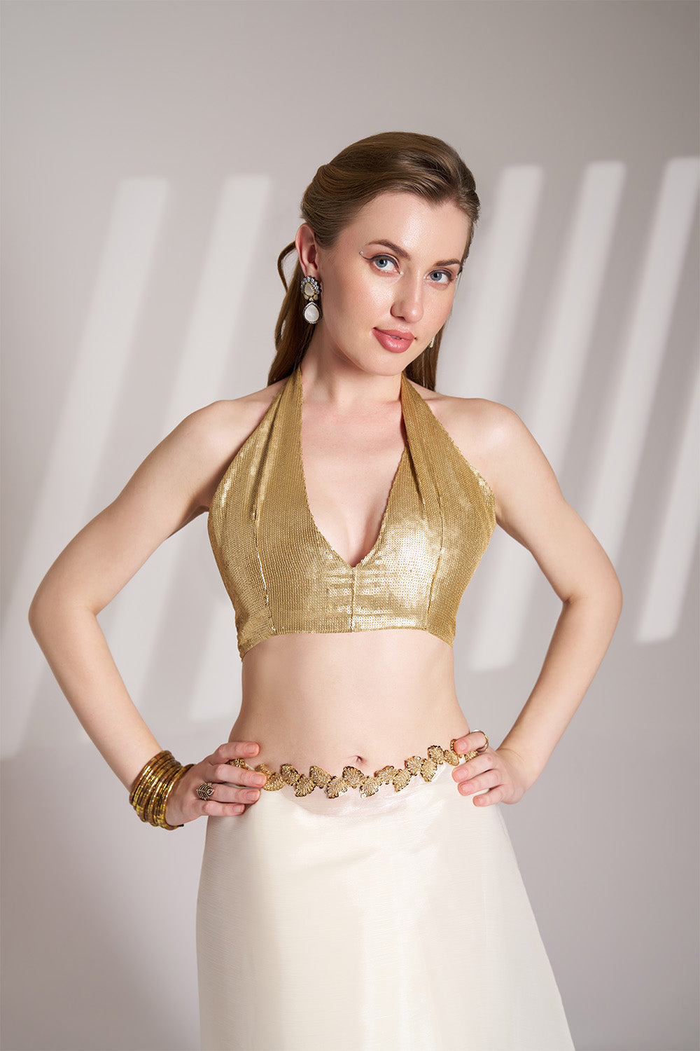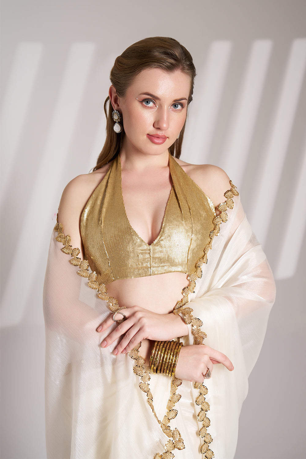 This Off White Organza Saree features a delicate lace design and comes with an unstitched blouse. Made from premium quality fabric, this saree is perfect for any special occasion. Elevate your style with this elegant and versatile saree that offers both comfort and fashion.