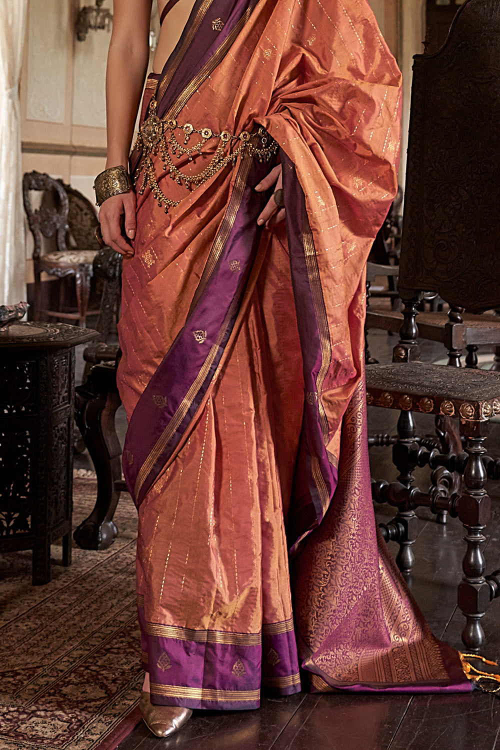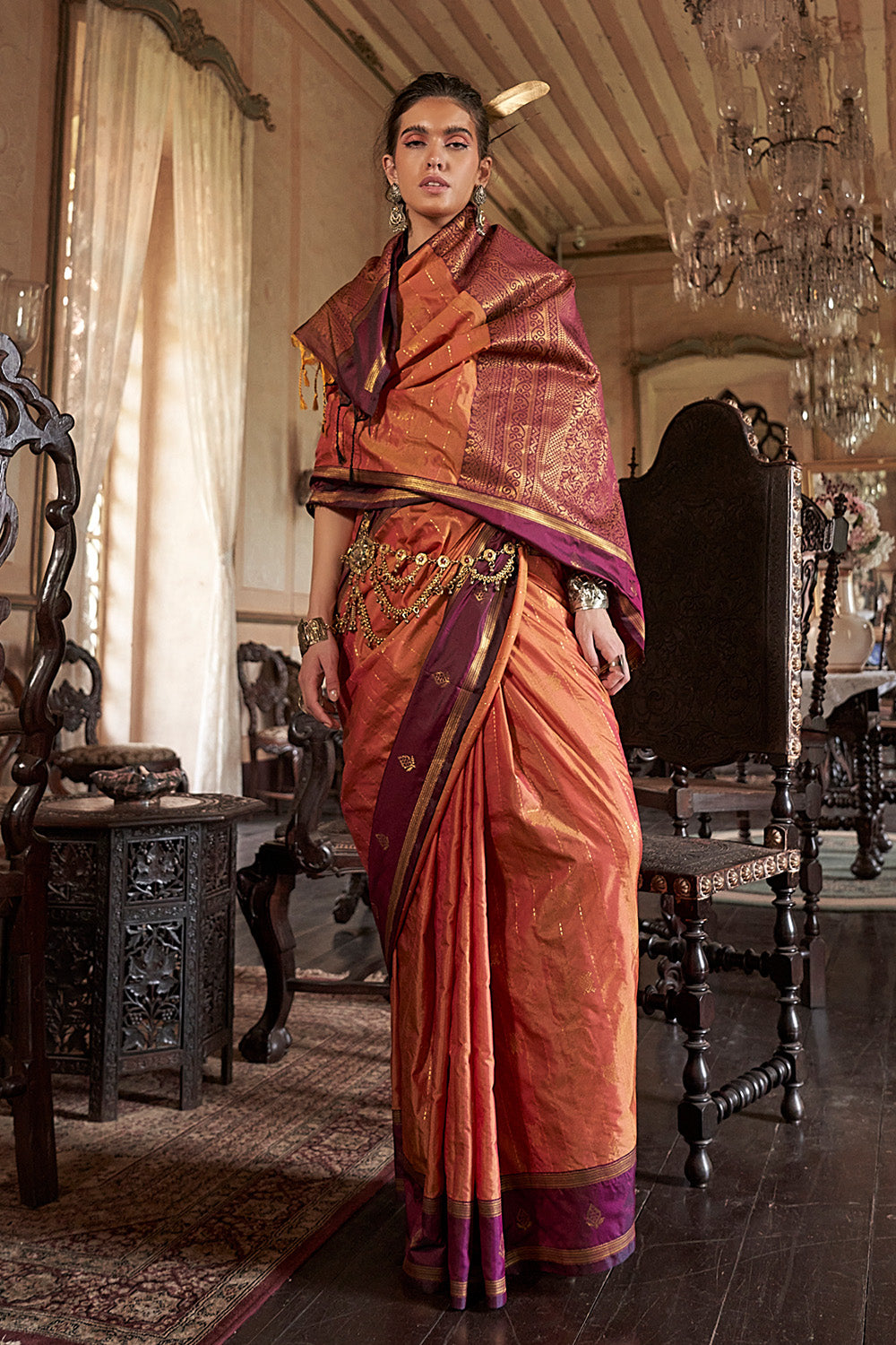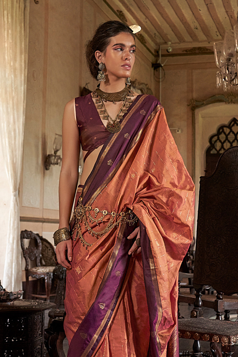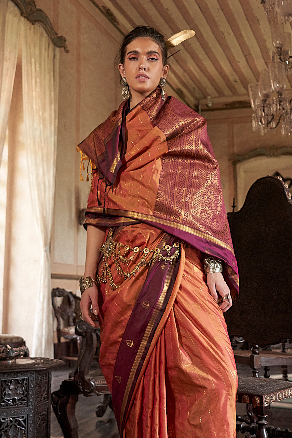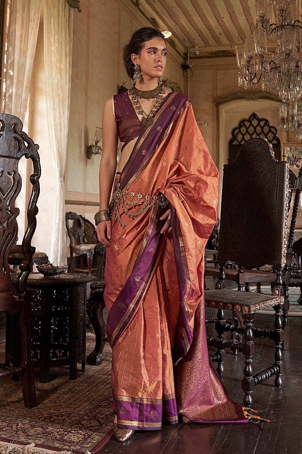 This Orange Leheriya Stripes Saree, paired with a matching blouse, showcases the vibrant artistry of traditional Leheriya dyeing with dynamic striped patterns in bright orange tones. The saree’s lightweight fabric offers a fluid drape and comfortable wear, making it ideal for festive occasions and cultural events. Combining rich heritage craftsmanship with a modern aesthetic, this ensemble delivers an elegant and lively ethnic style.