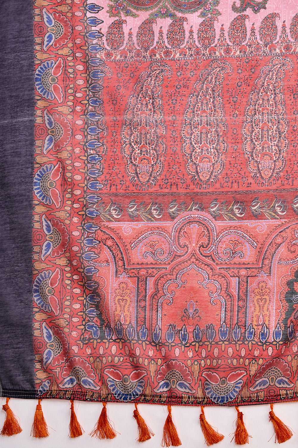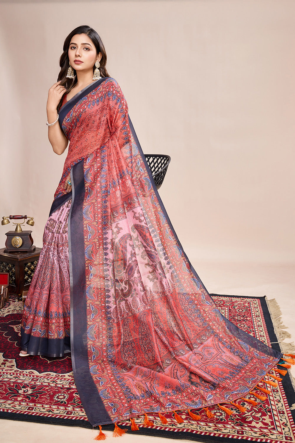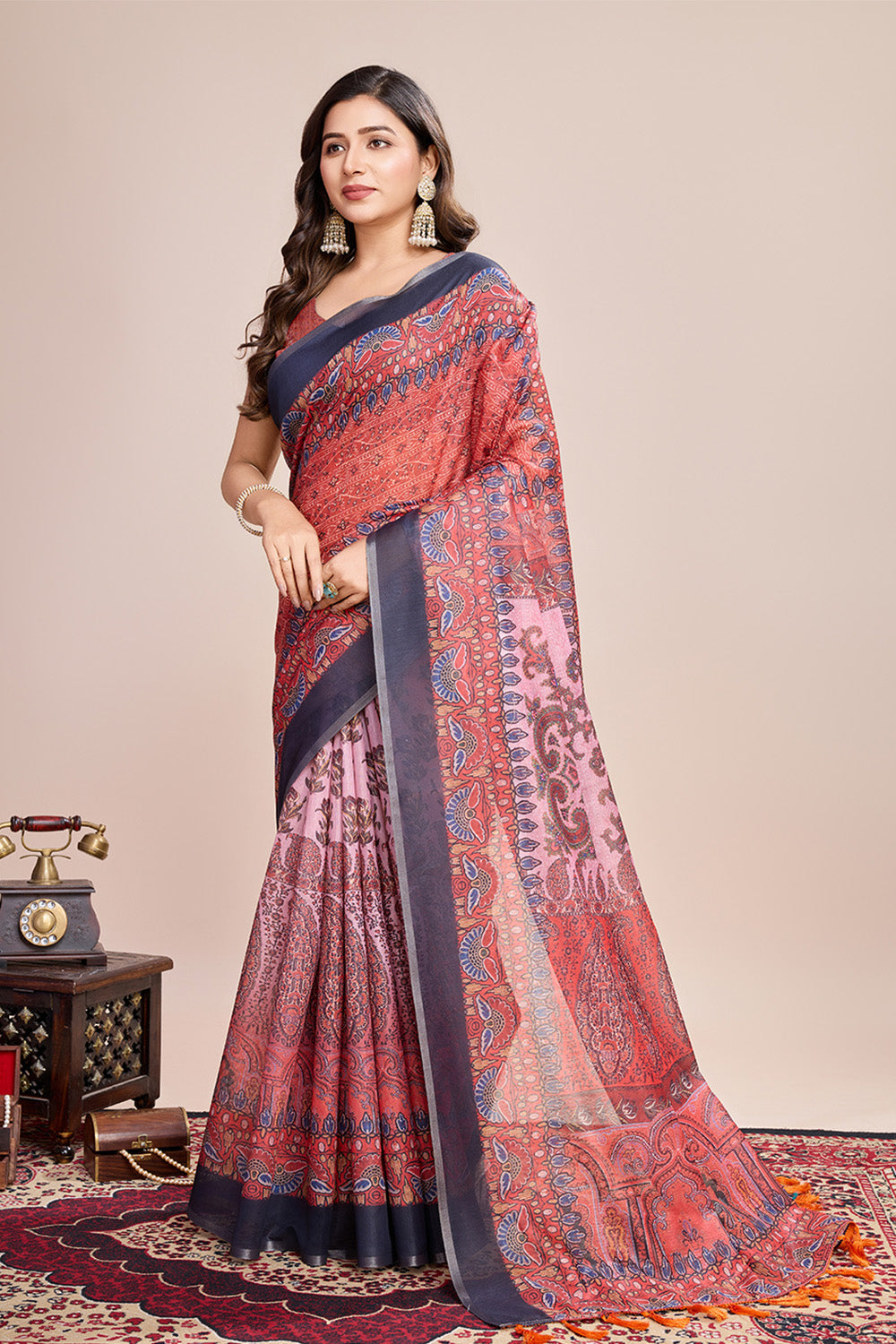 Expertly crafted with a beautiful printed design and accented by a stunning zari border, this orange printed Saree is a perfect addition to any wardrobe. Made from high-quality materials, it offers both comfort and style. The matching blouse completes the look, making it a versatile and elegant choice for any occasion.
