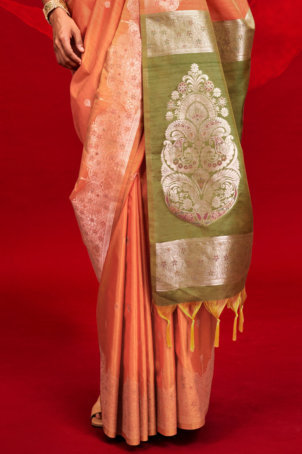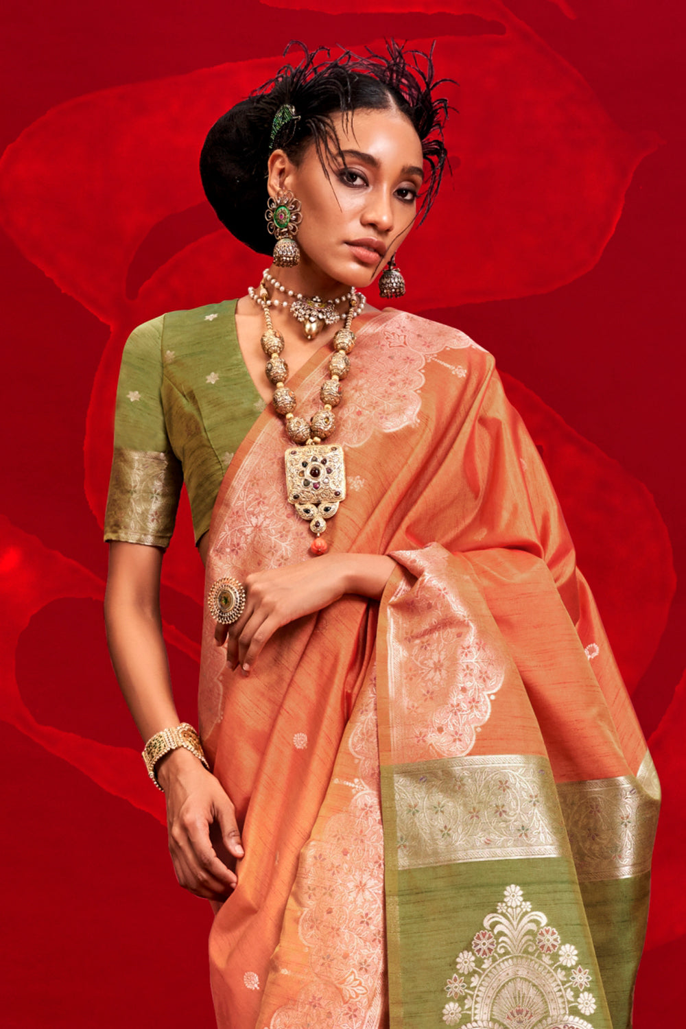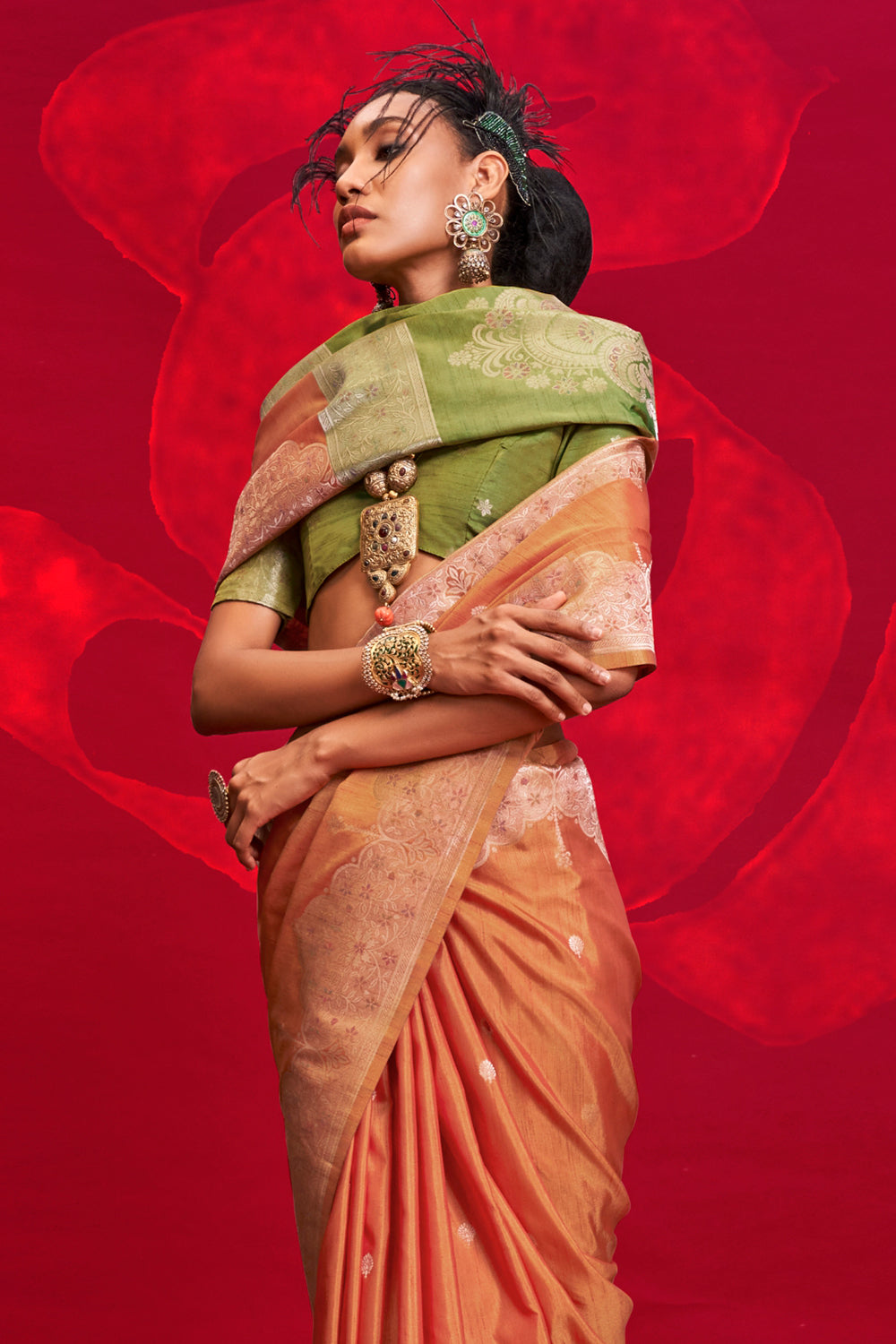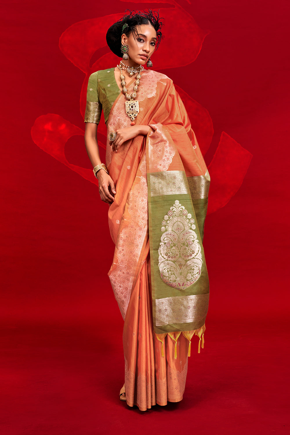 This exquisite Orange Saree is crafted with a contrasting Pallu and Blouse for a stunning contrast. Made with high-quality fabric, this saree is not only elegant but also comfortable to wear. Perfect for any occasion, this saree will surely make you stand out in the crowd.