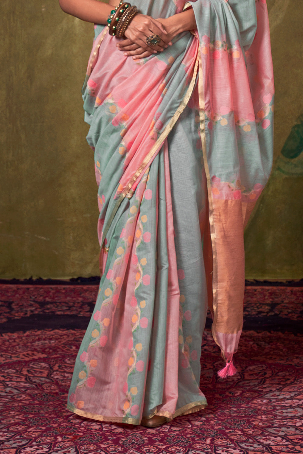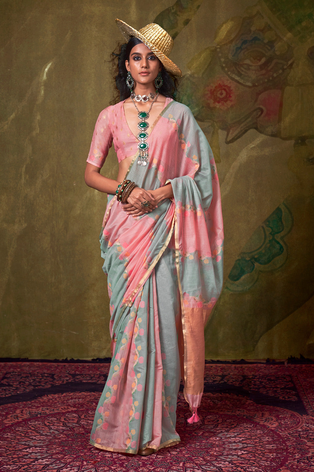 Step up your style with our Pink And Grey Rangkaat Saree. This elegant saree boasts a heavy pallu and blouse, adding a touch of sophistication to any occasion. Made with quality materials, this saree is both comfortable and stylish. Elevate your wardrobe with this versatile piece.