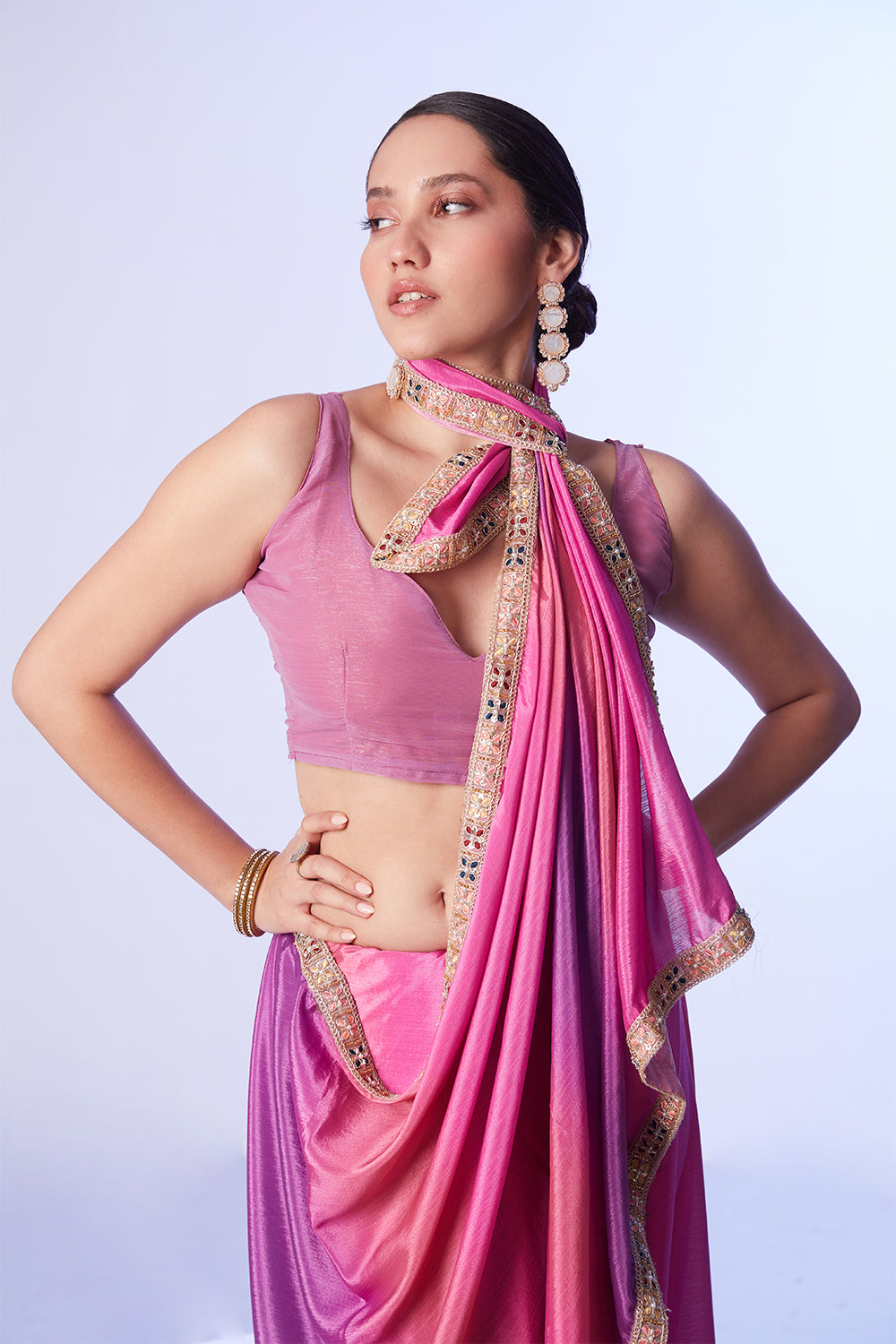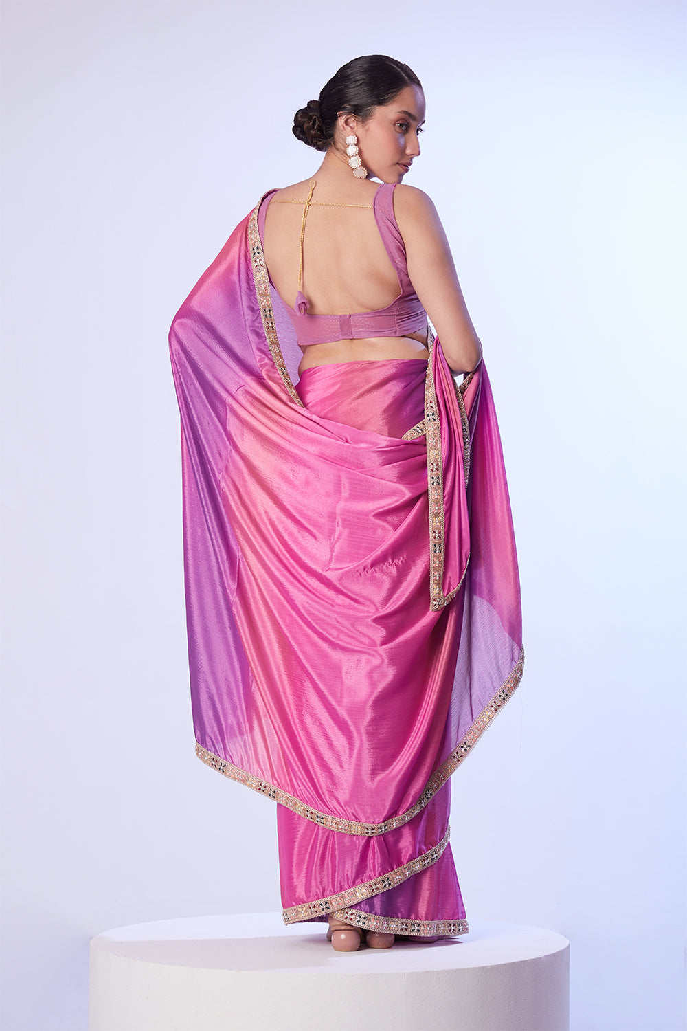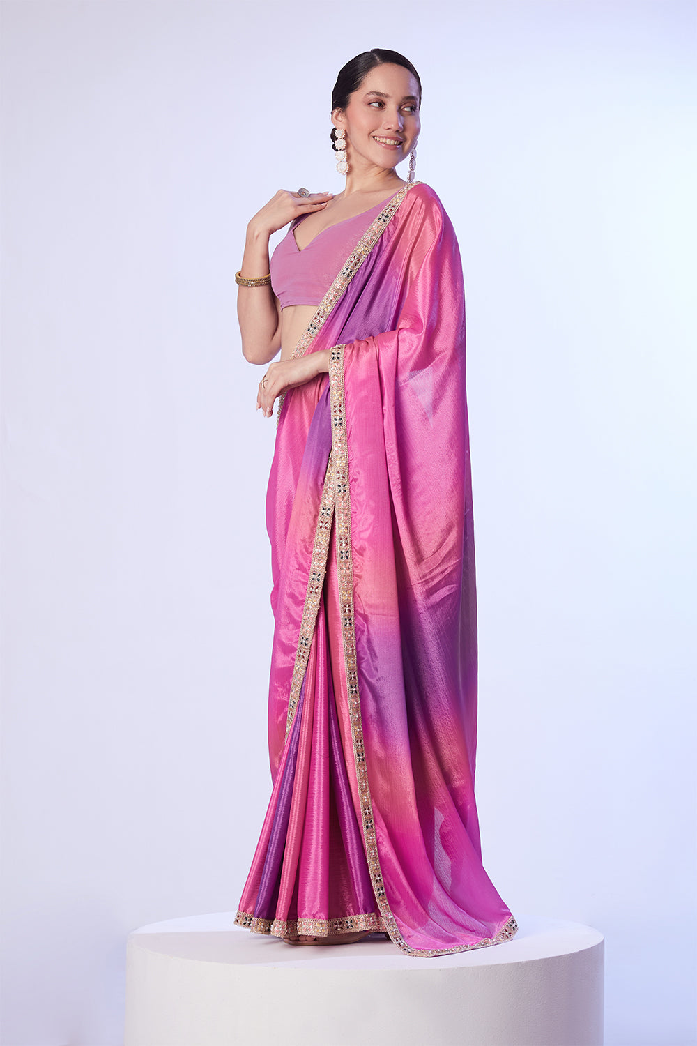 Multi Chinon Saree With Lace And Unstitched Blouse