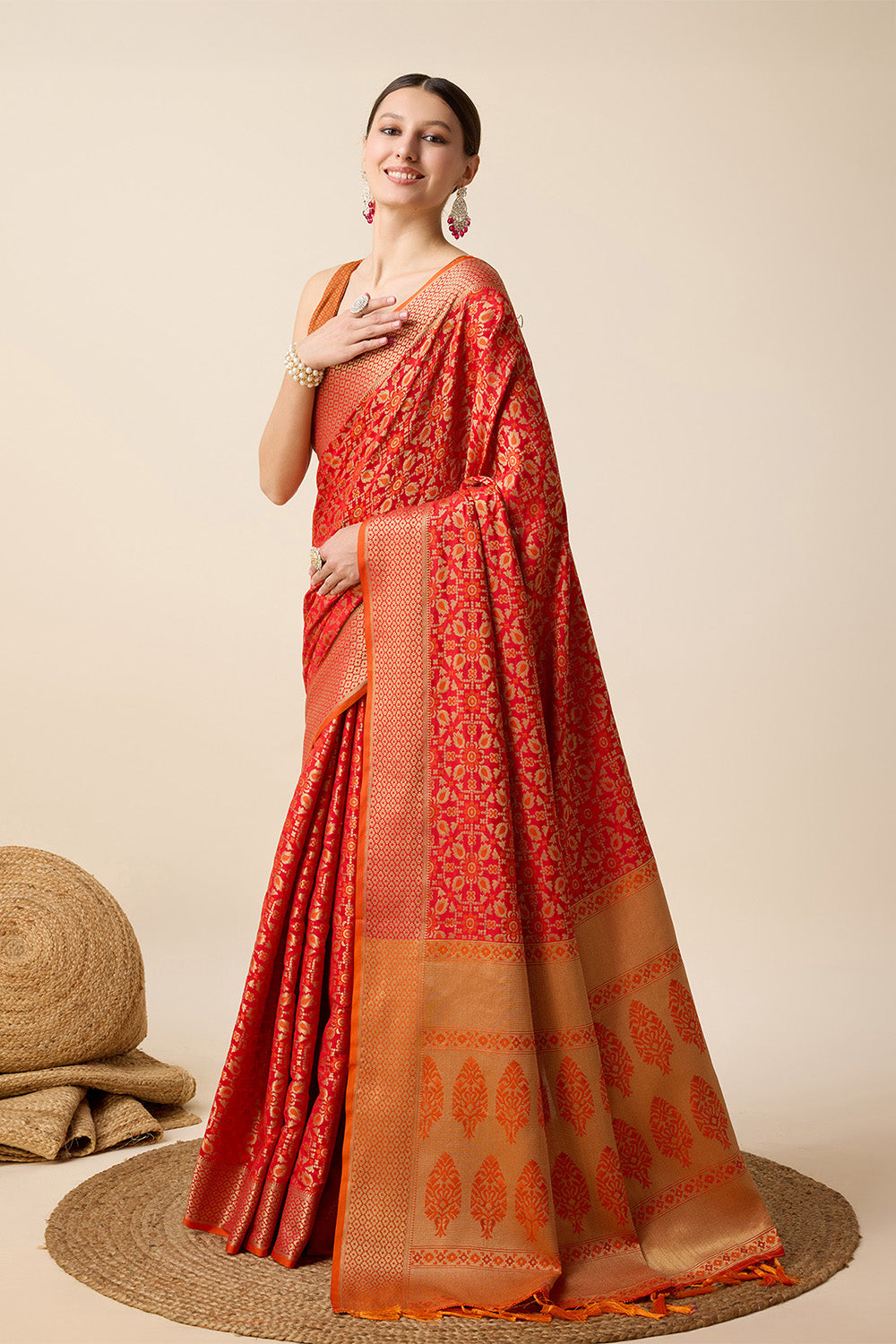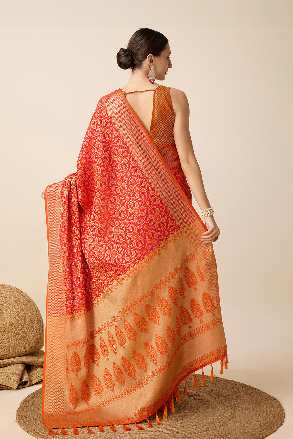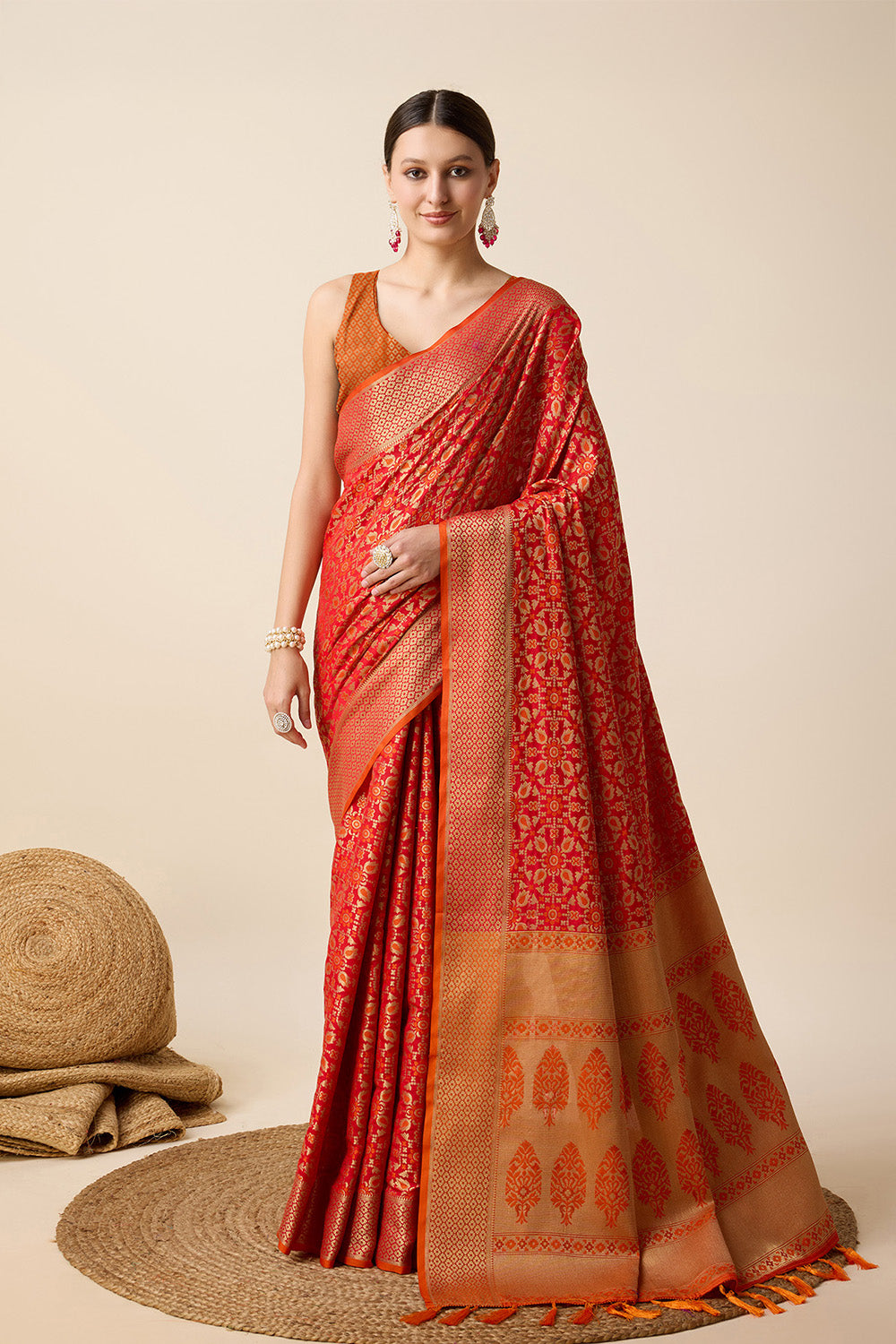 This Red Patola Saree is handwoven with intricate tassels, adding a touch of elegance and sophistication to any occasion. Made from high-quality materials, it offers comfort and durability. Perfect for weddings, festivals, and formal events, this saree is a must-have in any wardrobe.
