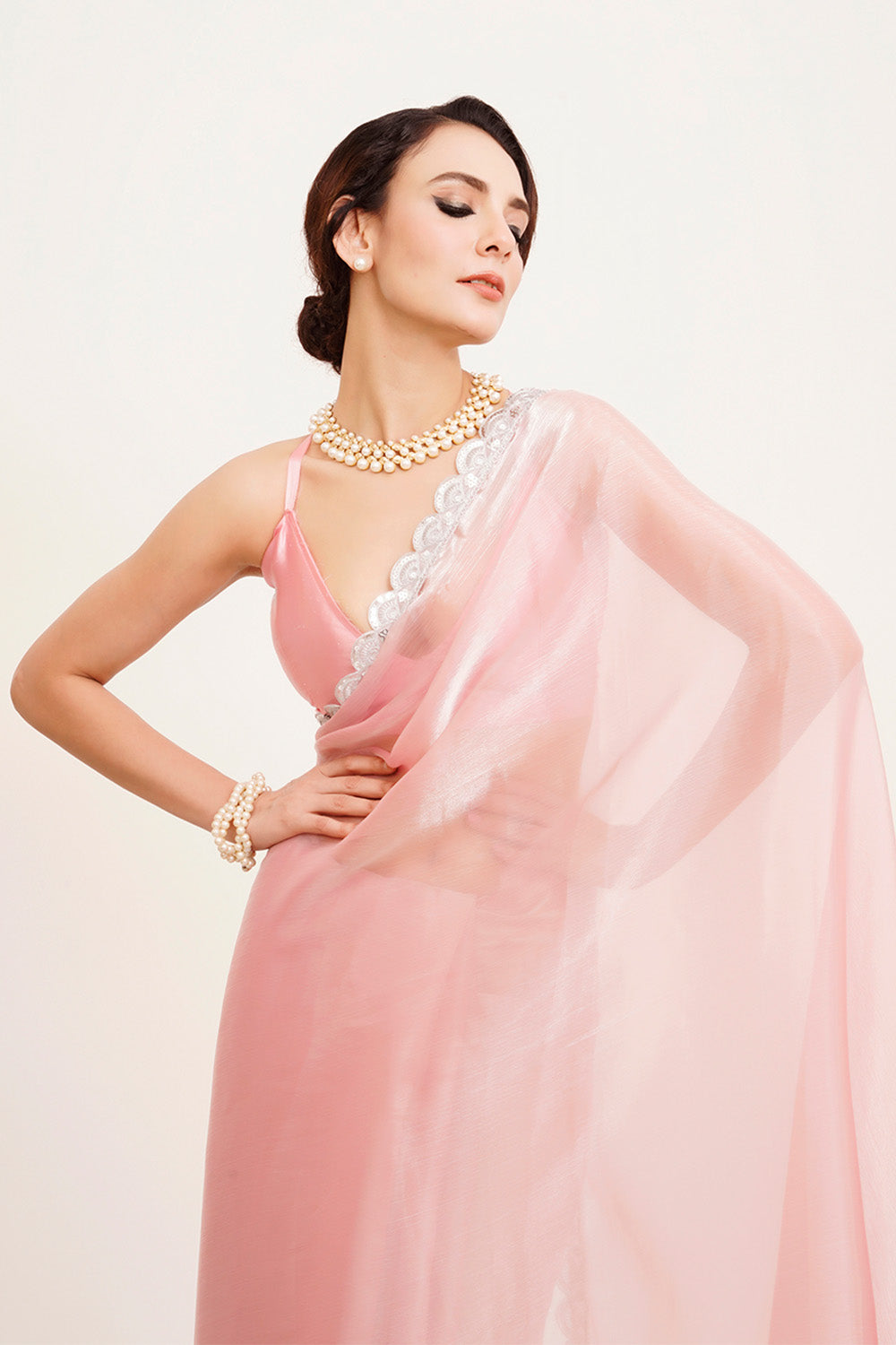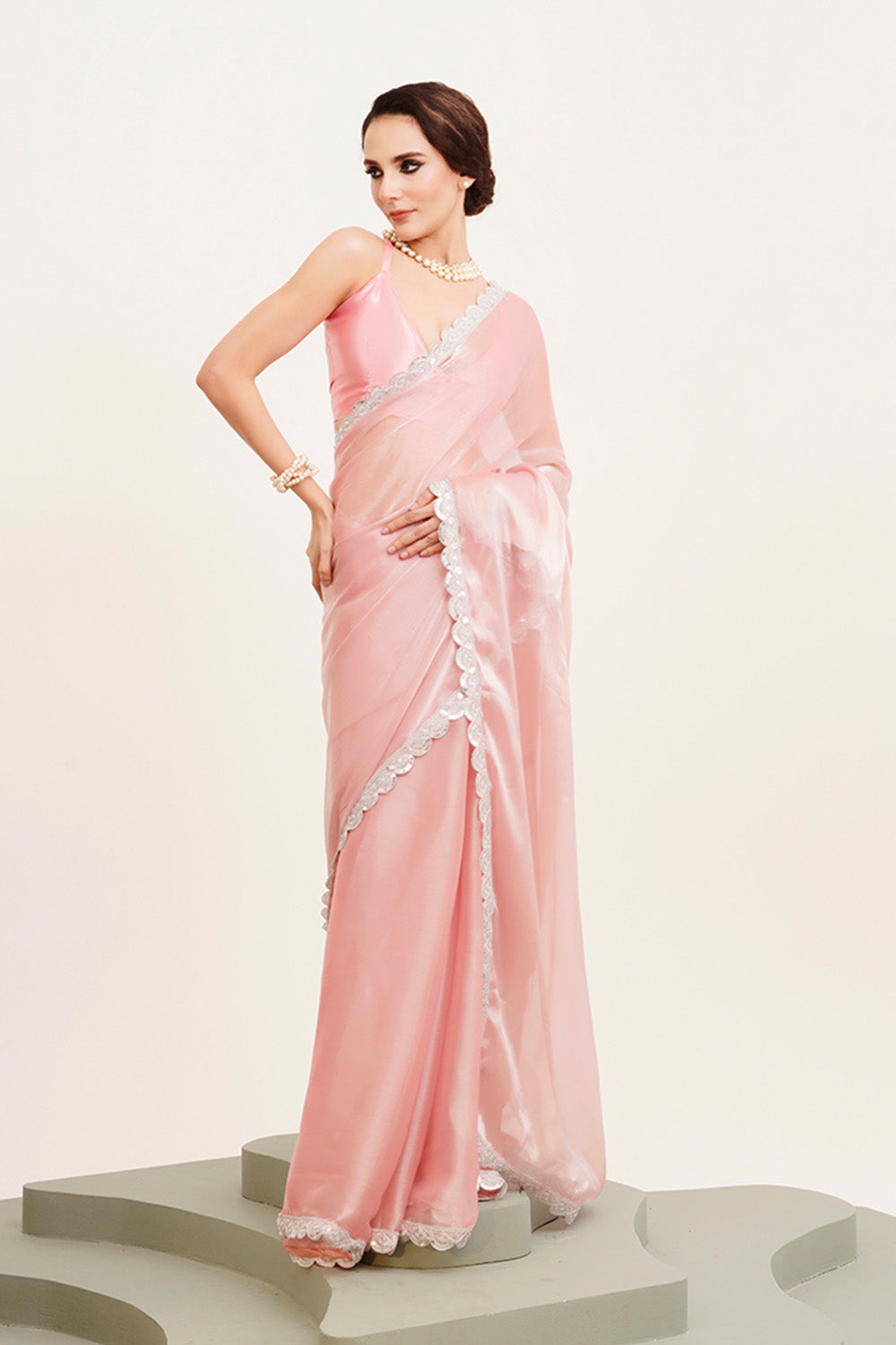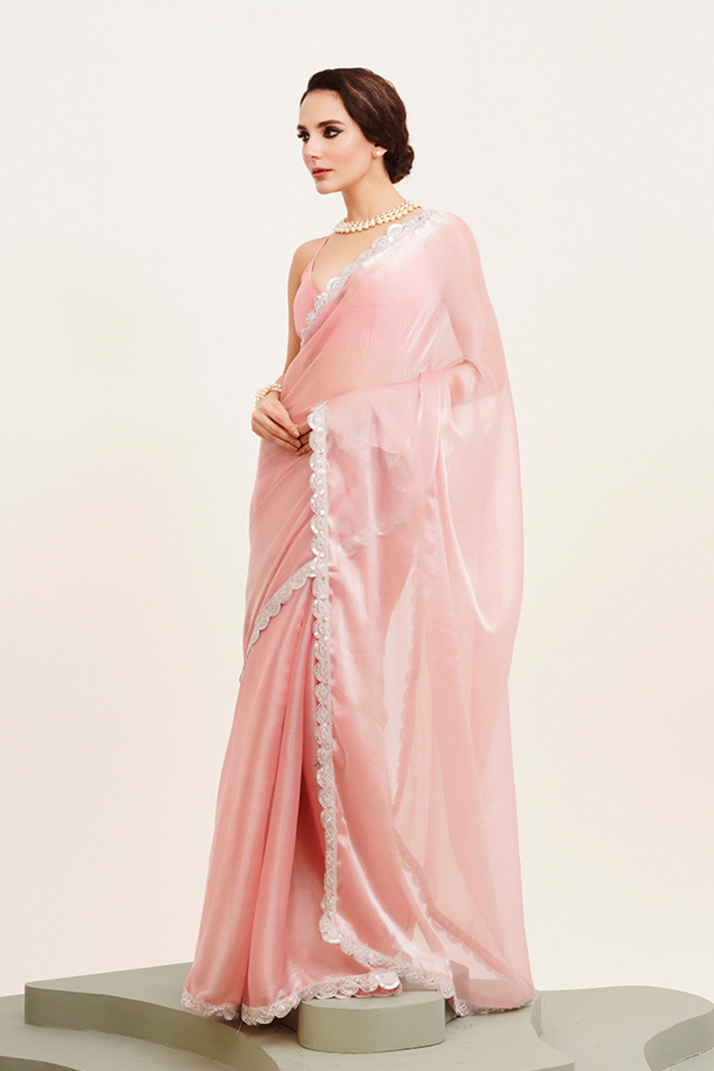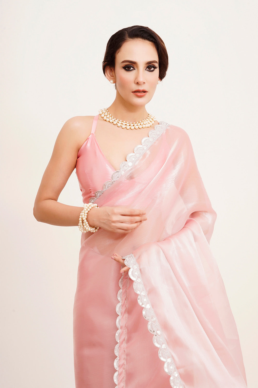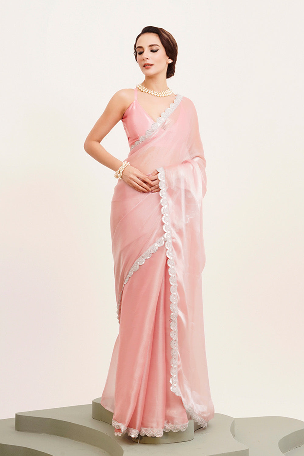 Elevate your traditional wardrobe with this Pink Sequinned Organza Saree, paired with a matching blouse. Crafted from lightweight organza fabric, it offers a graceful drape and subtle sheen. The intricate sequinned detailing adds a refined sparkle, perfect for festive occasions and celebrations. Designed for comfort and elegance, this saree enhances your silhouette while ensuring ease of movement. Ideal for those seeking a sophisticated blend of classic charm and contemporary style.
