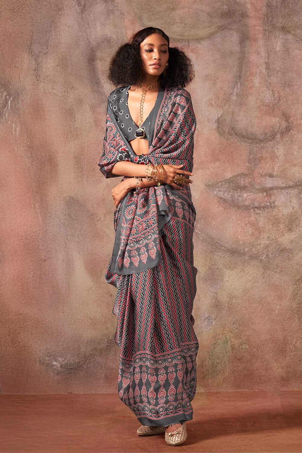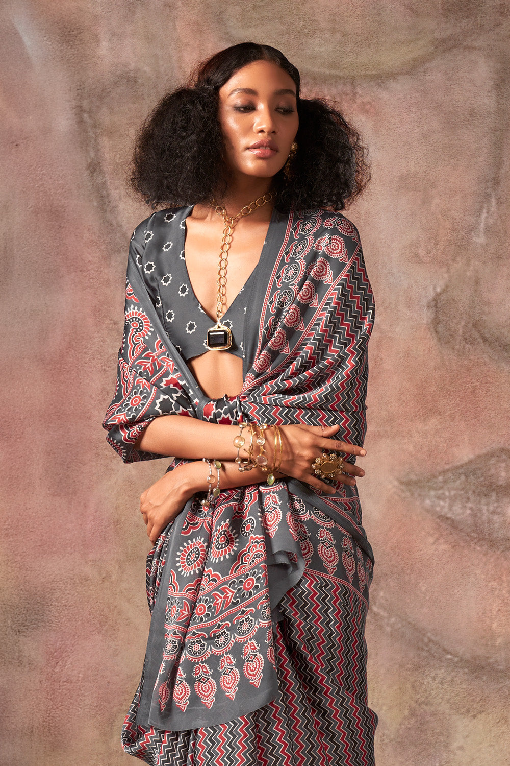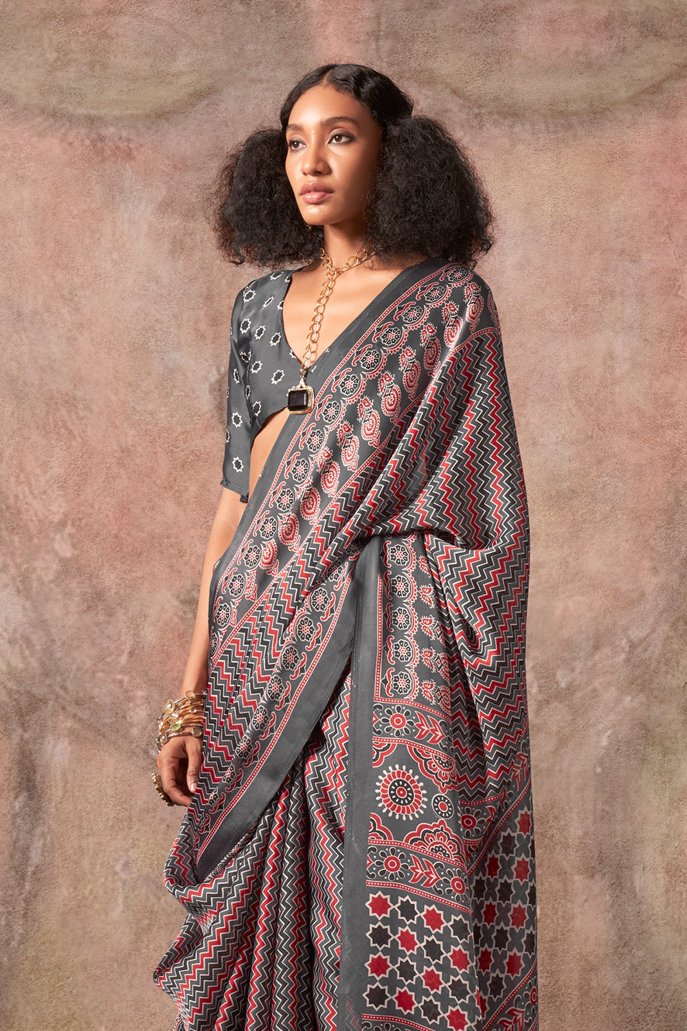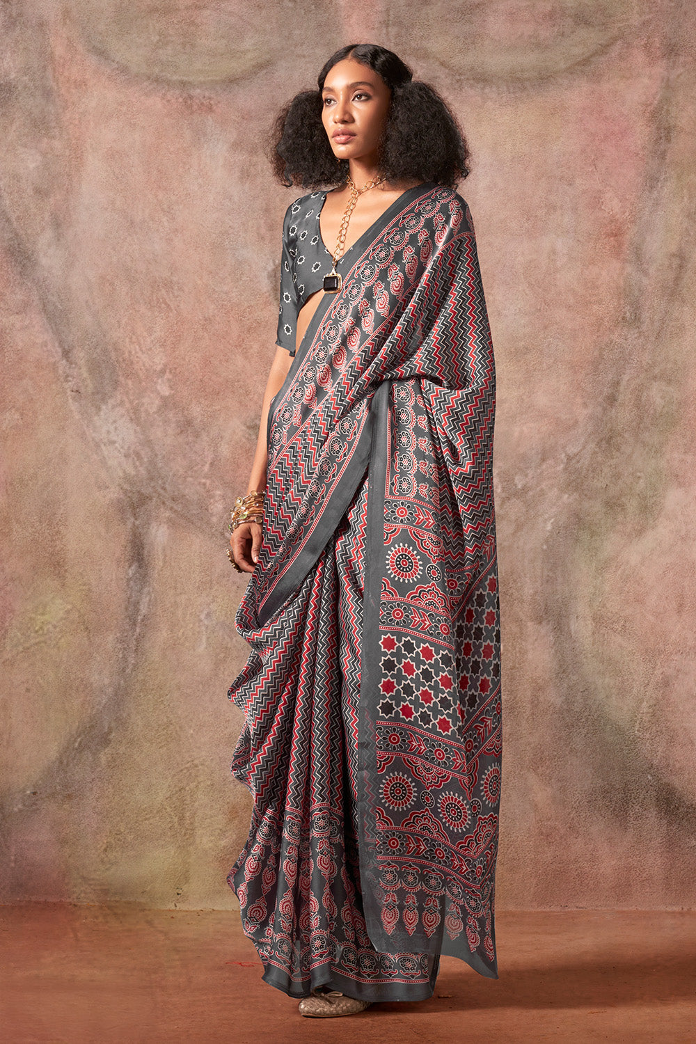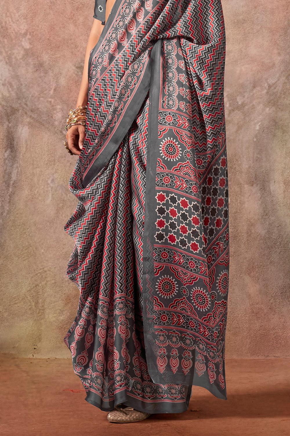 Multicolor Ajrakh Print Satin Georgette Saree With Blouse