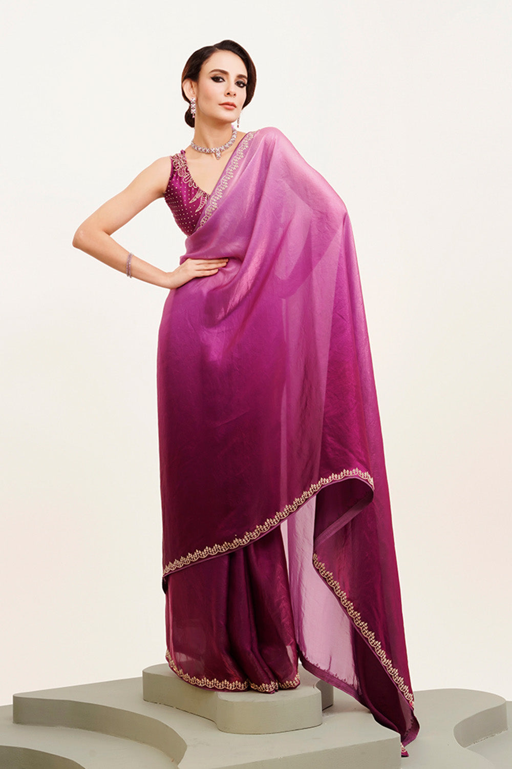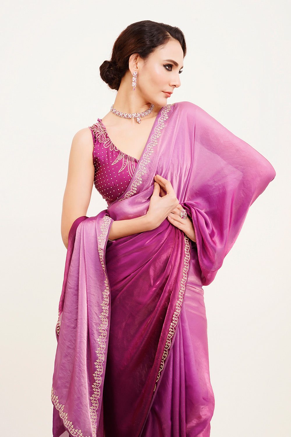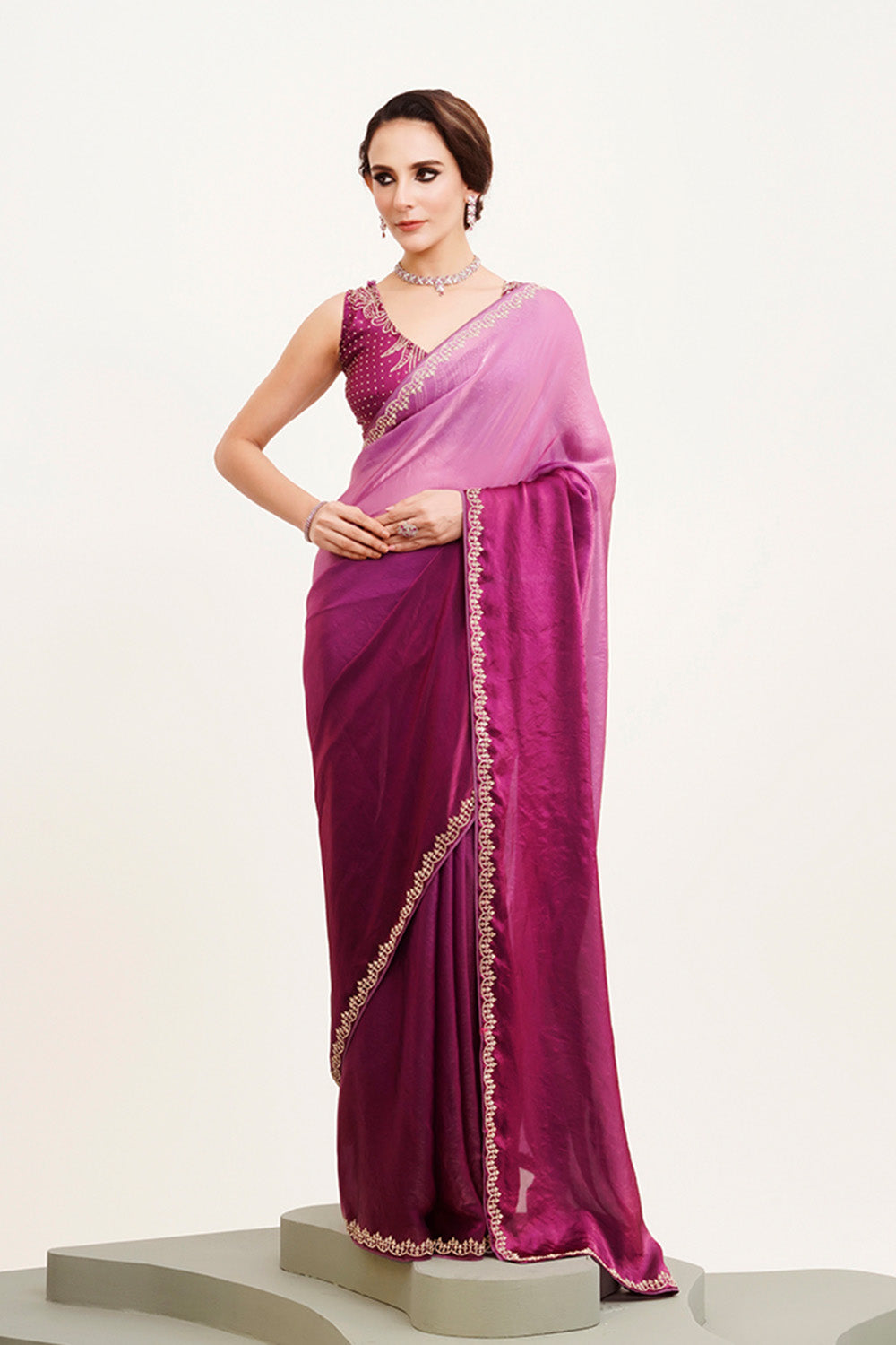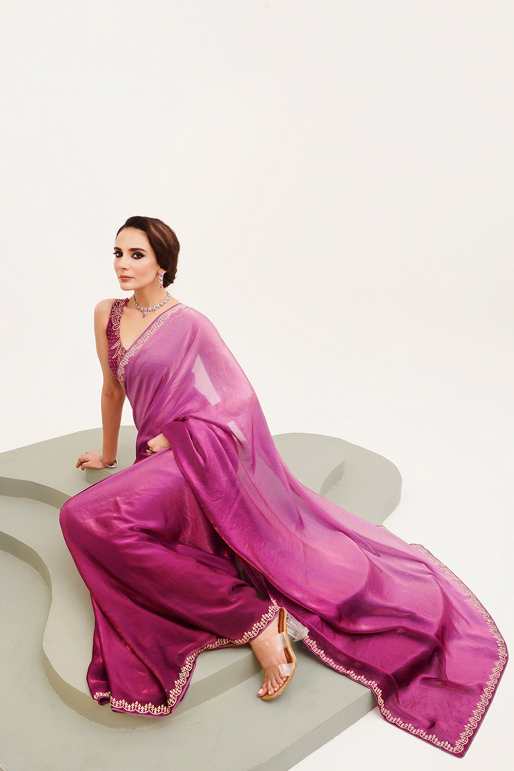 Elevate your ethnic wardrobe with this exquisite purple satin saree, adorned with delicate beads and stones that add a refined sparkle. The smooth satin fabric offers a luxurious drape and comfortable feel, while the coordinating blouse completes the ensemble for a polished look. Ideal for festive occasions and celebrations, this saree blends elegance with subtle embellishment for a sophisticated statement.