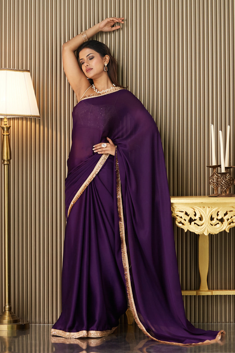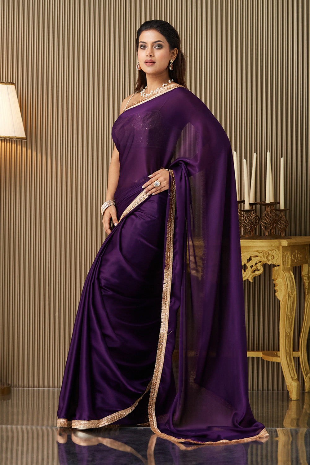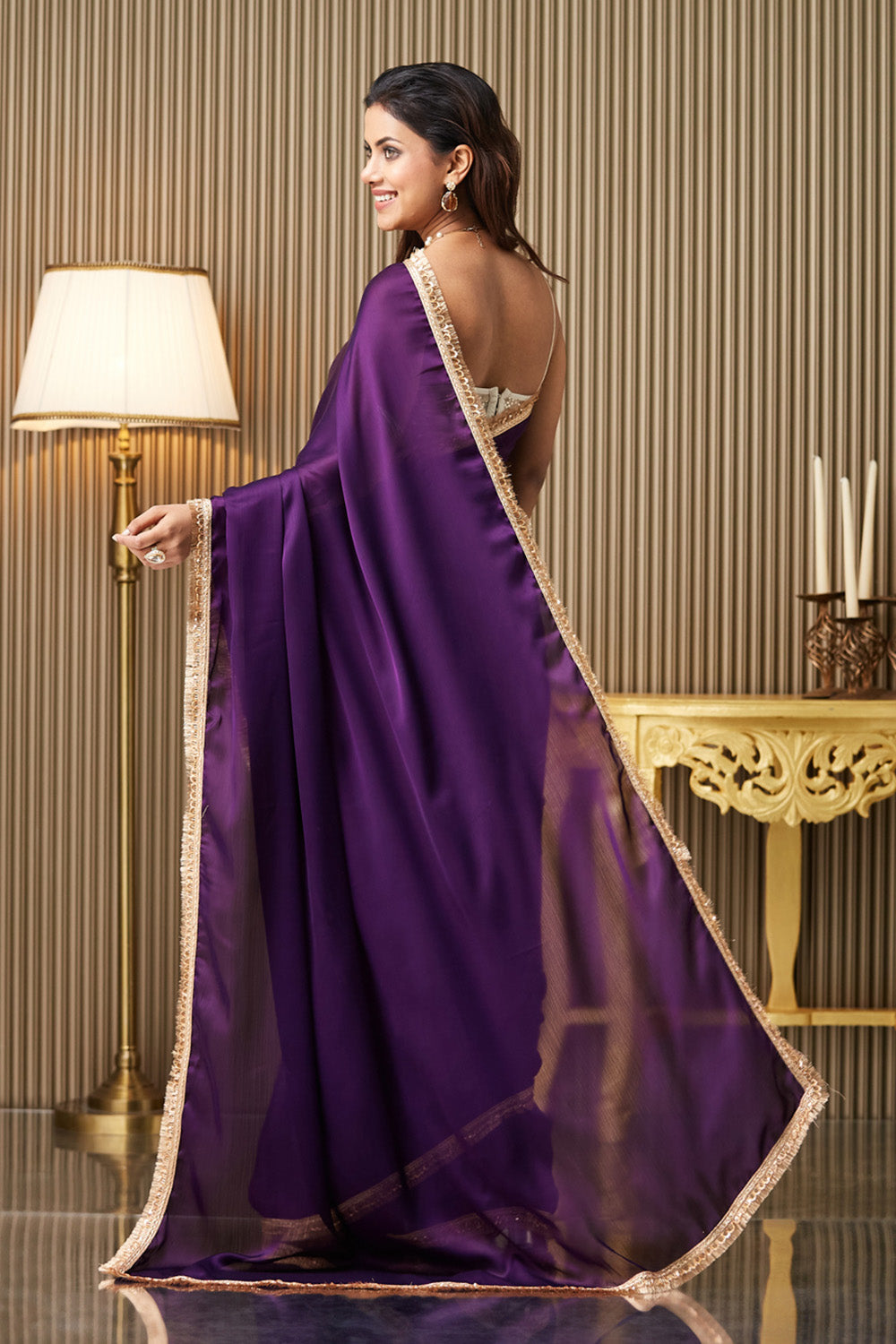 Elevate your ethnic wardrobe with this Purple Solid Satin Saree, featuring a luxurious satin finish that drapes elegantly. The designer lace detailing adds a refined touch, perfectly complemented by a matching blouse crafted for a tailored fit. Ideal for festive occasions and formal events, this saree combines comfort with sophisticated style.