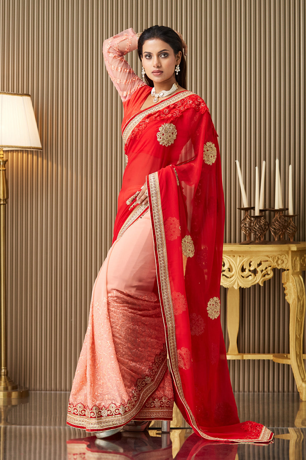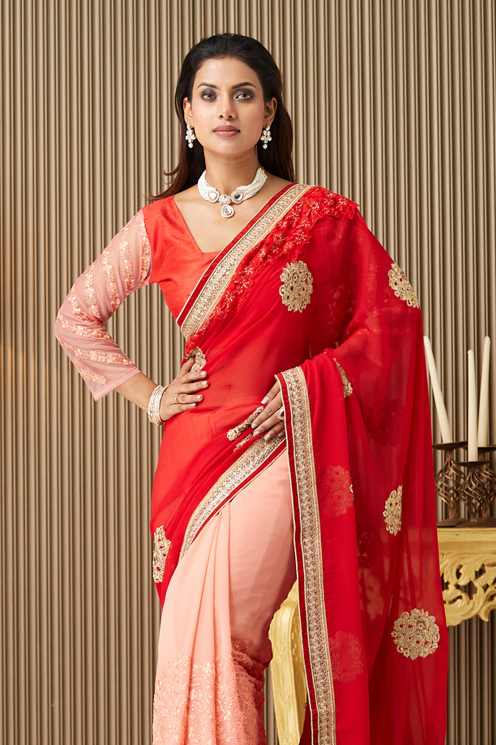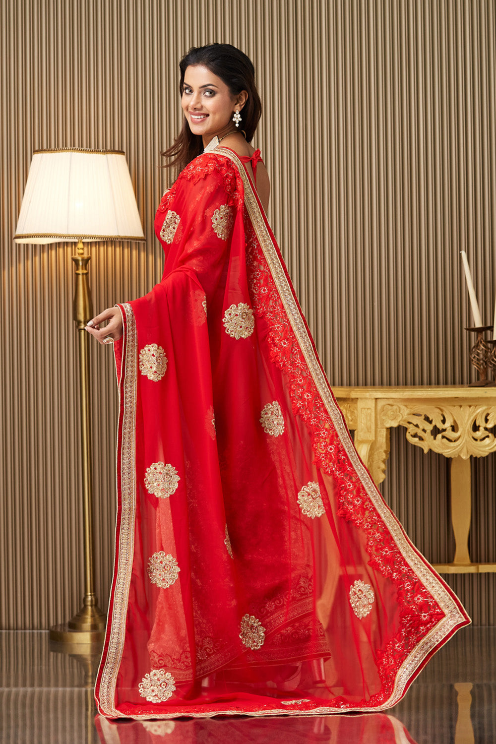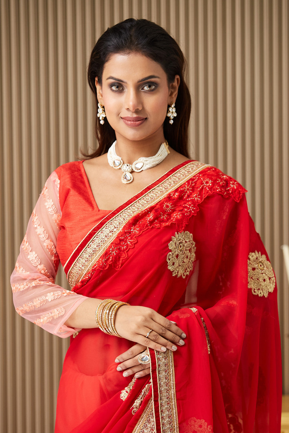 Elevate your traditional wardrobe with this exquisite red chiffon saree, featuring intricate embroidery that adds a refined touch of elegance. Lightweight and breathable, the chiffon fabric ensures comfort throughout the day, while the included matching blouse completes the ensemble for a polished look. Perfect for festive occasions and formal events, this saree combines classic craftsmanship with contemporary style.