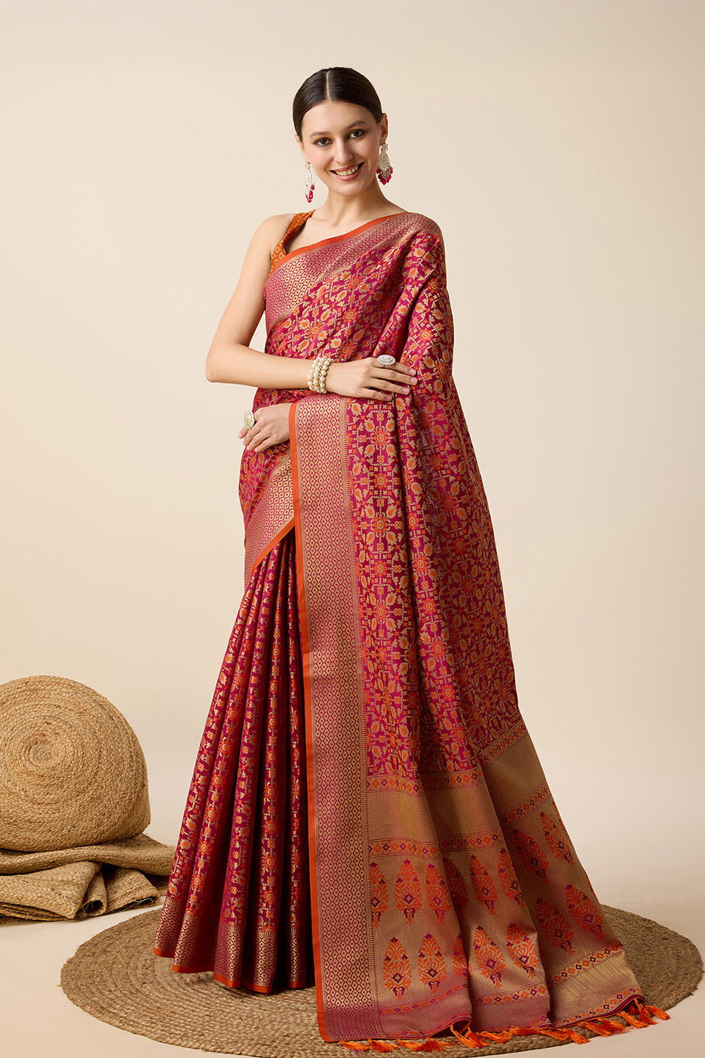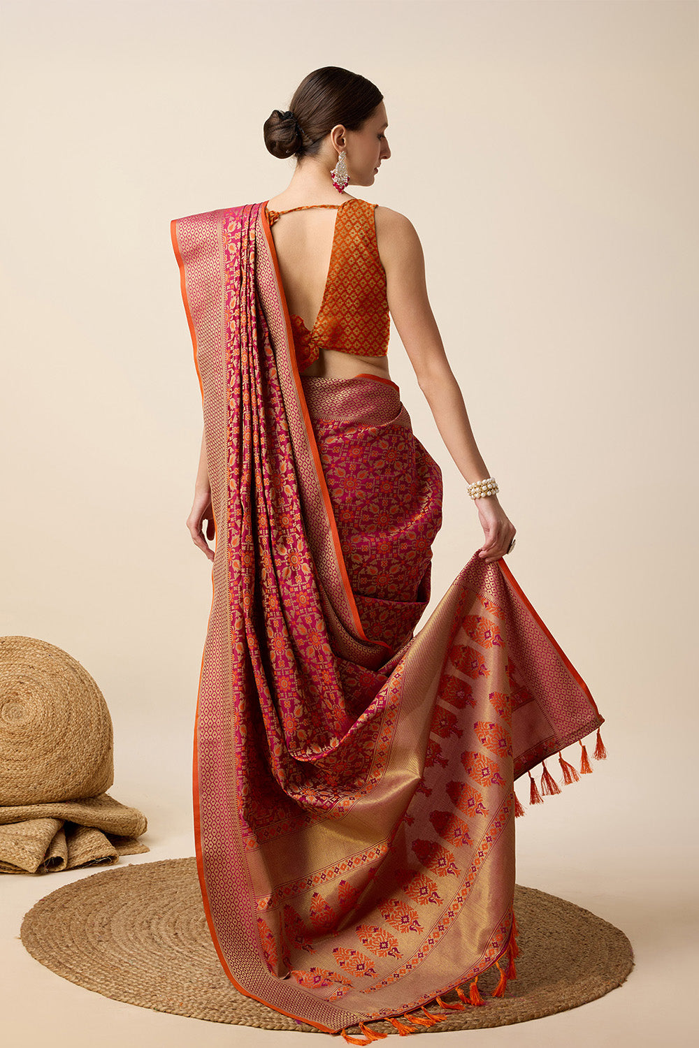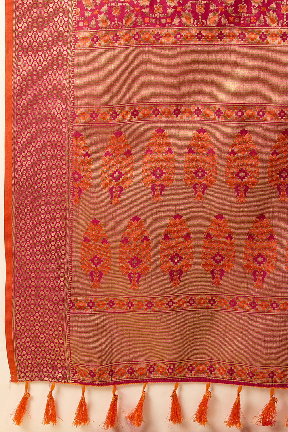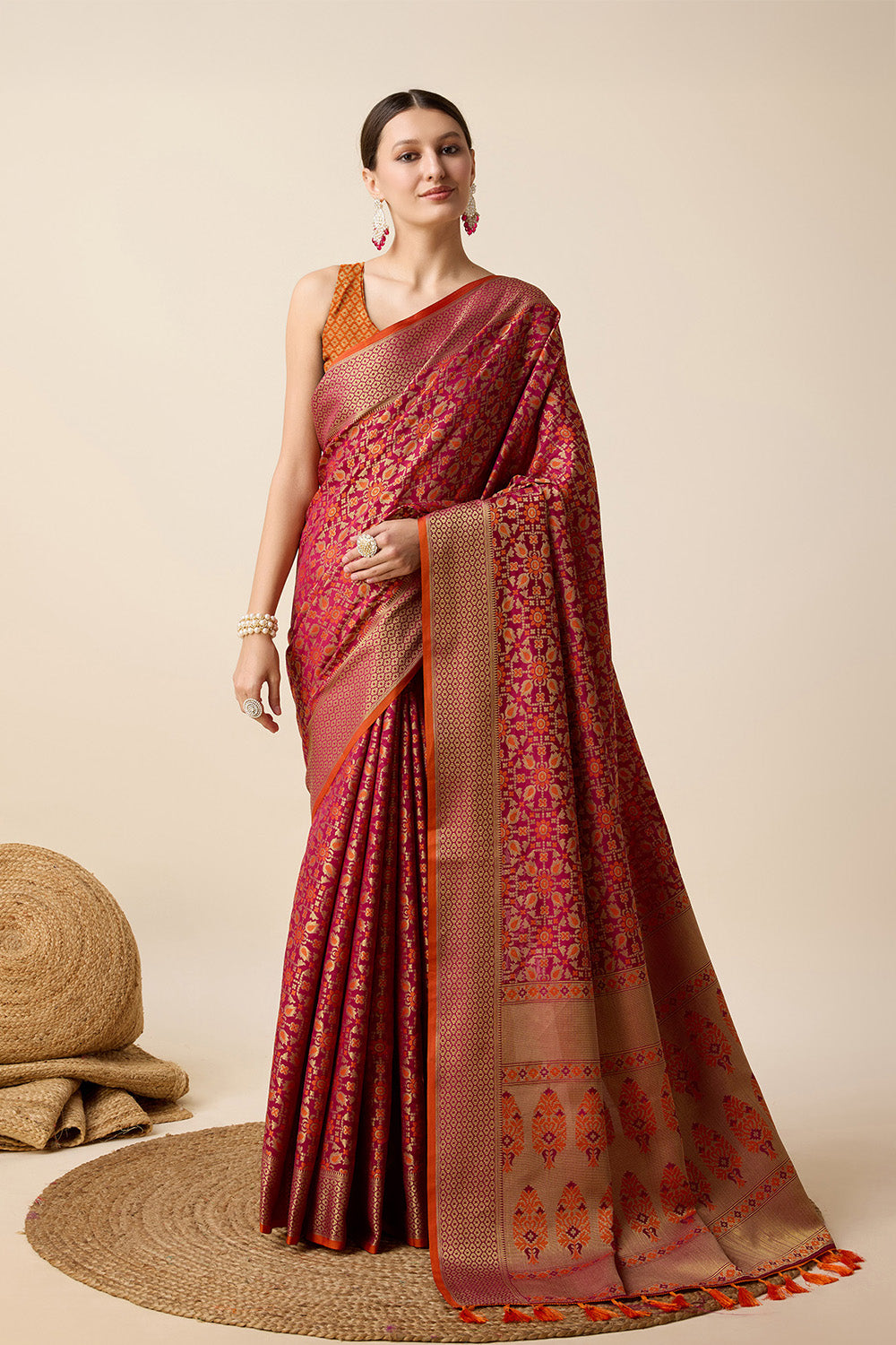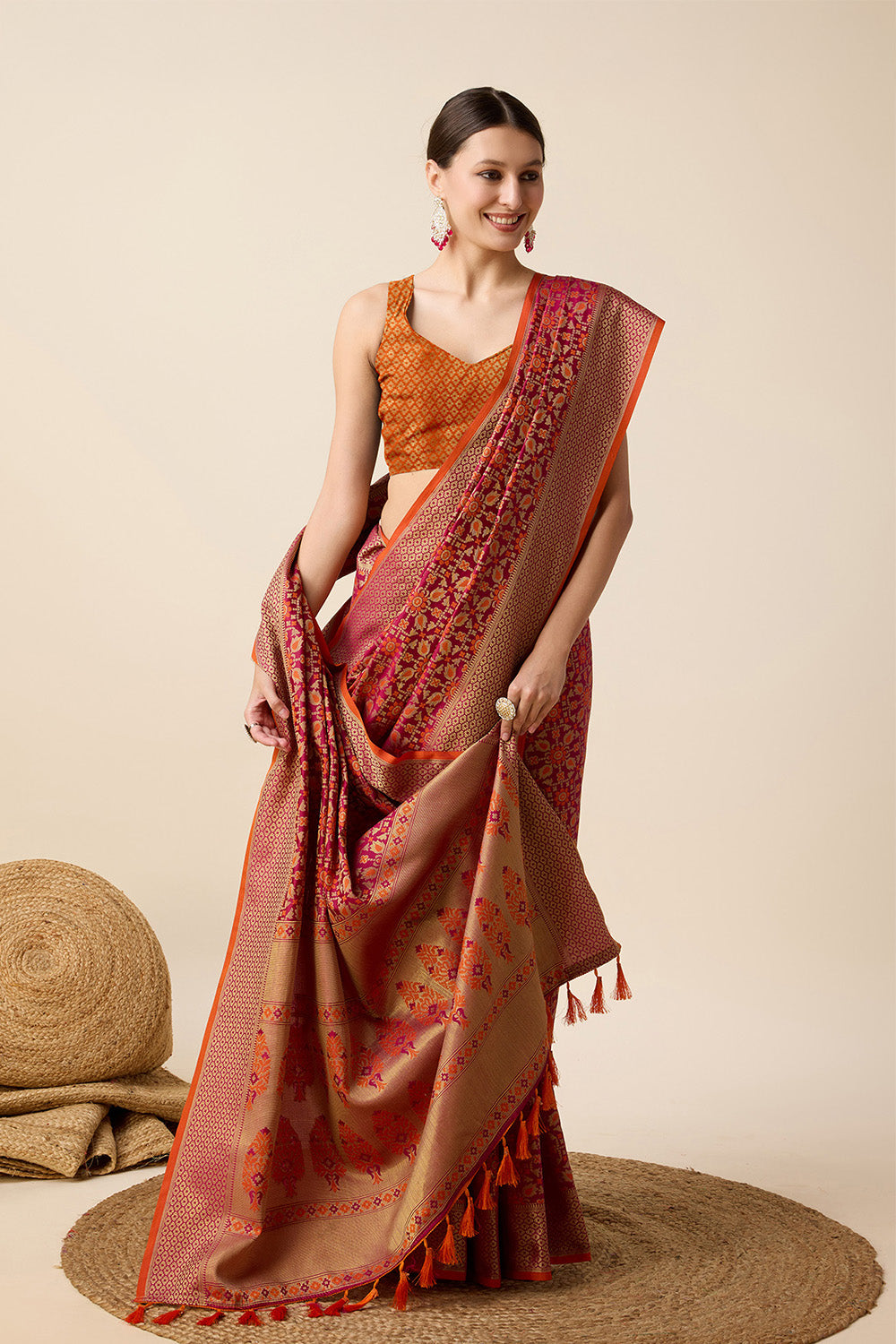 This beautifully crafted Red Patola Saree is intricately woven with tassels, showcasing traditional Indian design. Made with high-quality material, this saree is perfect for special occasions and adds a touch of elegance to any outfit. Elevate your style with this timeless piece.