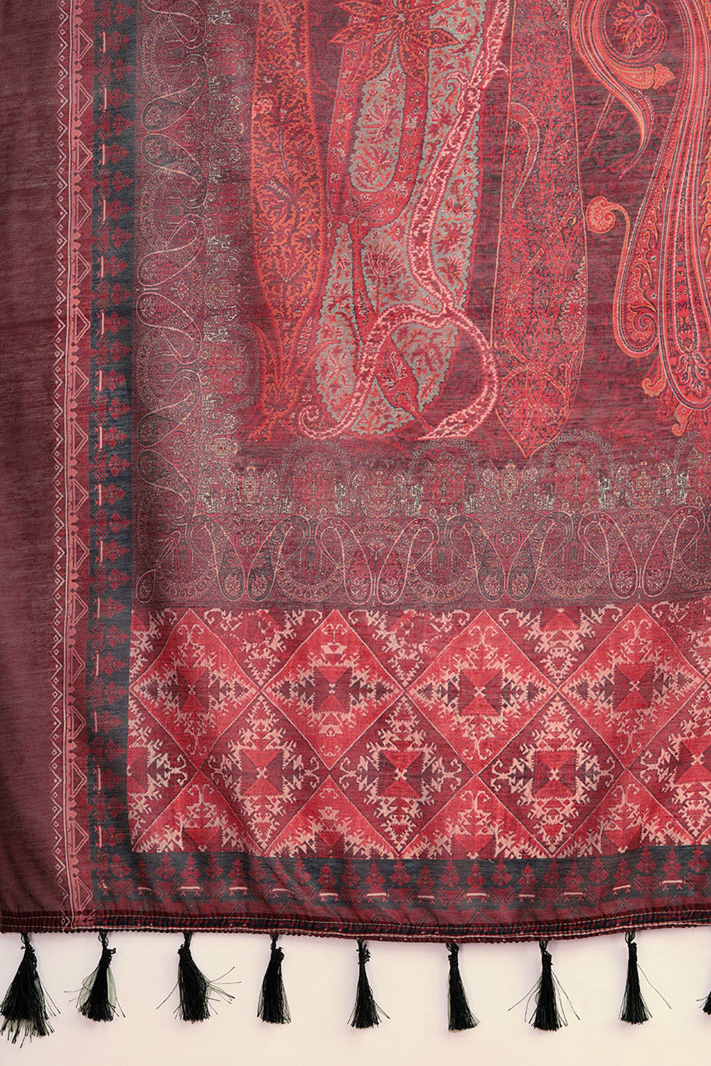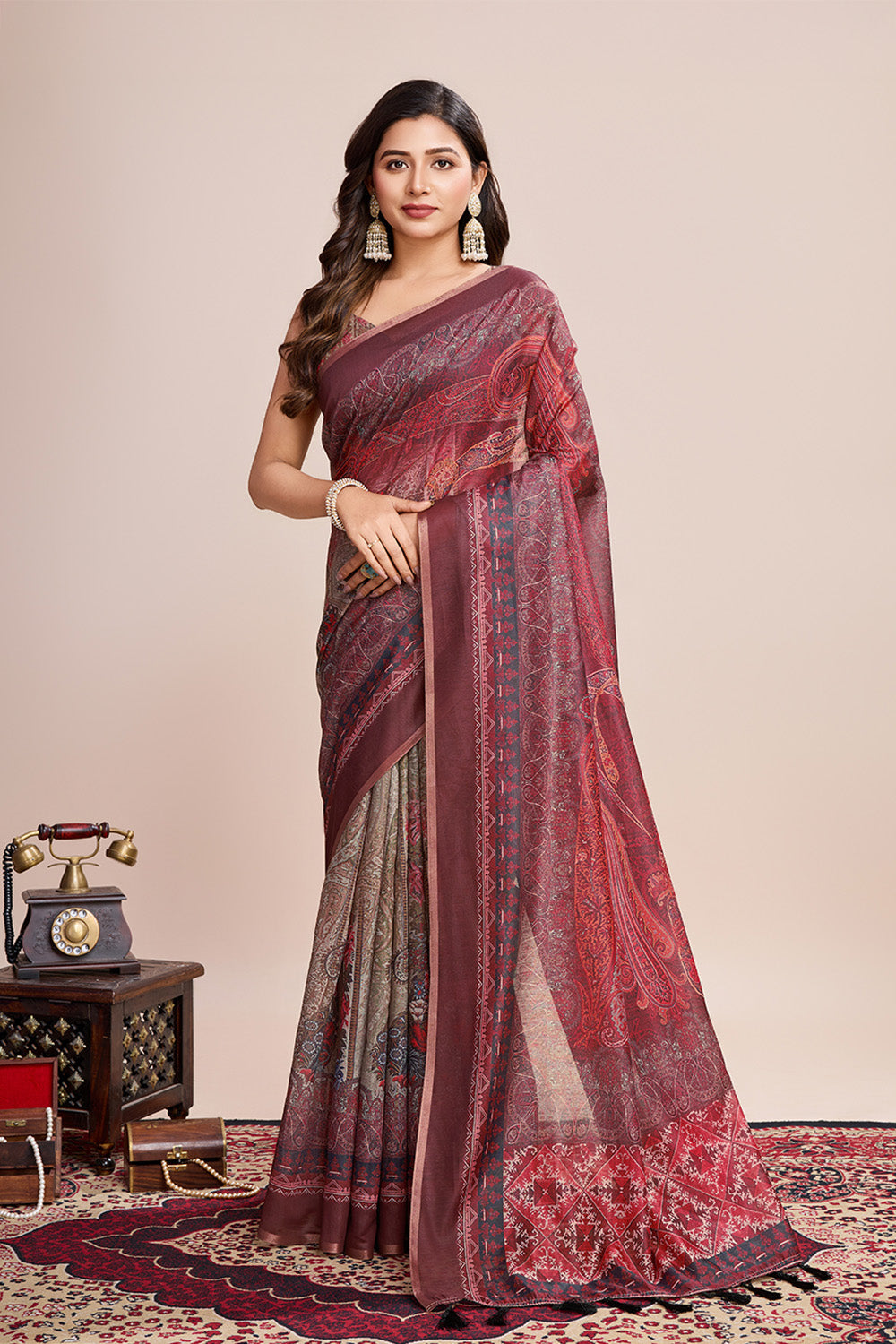 Elevate your traditional attire with our Red Printed Saree With zari Border With Blouse. This stunning saree features intricate print detailing and a delicate zari border for a touch of elegance. Complete with a matching blouse, this saree is perfect for any occasion.