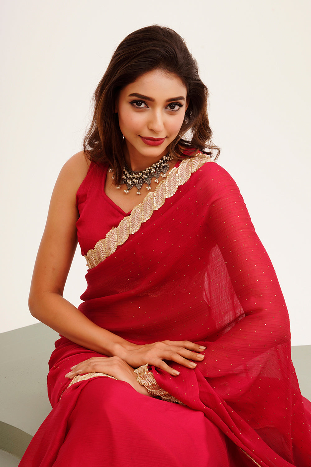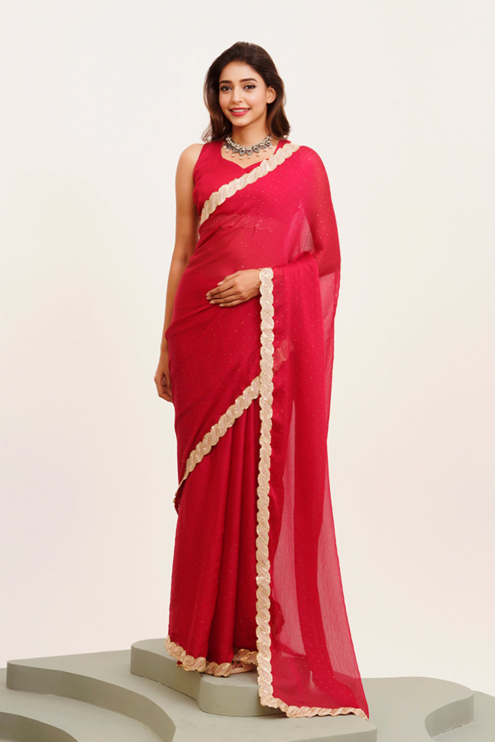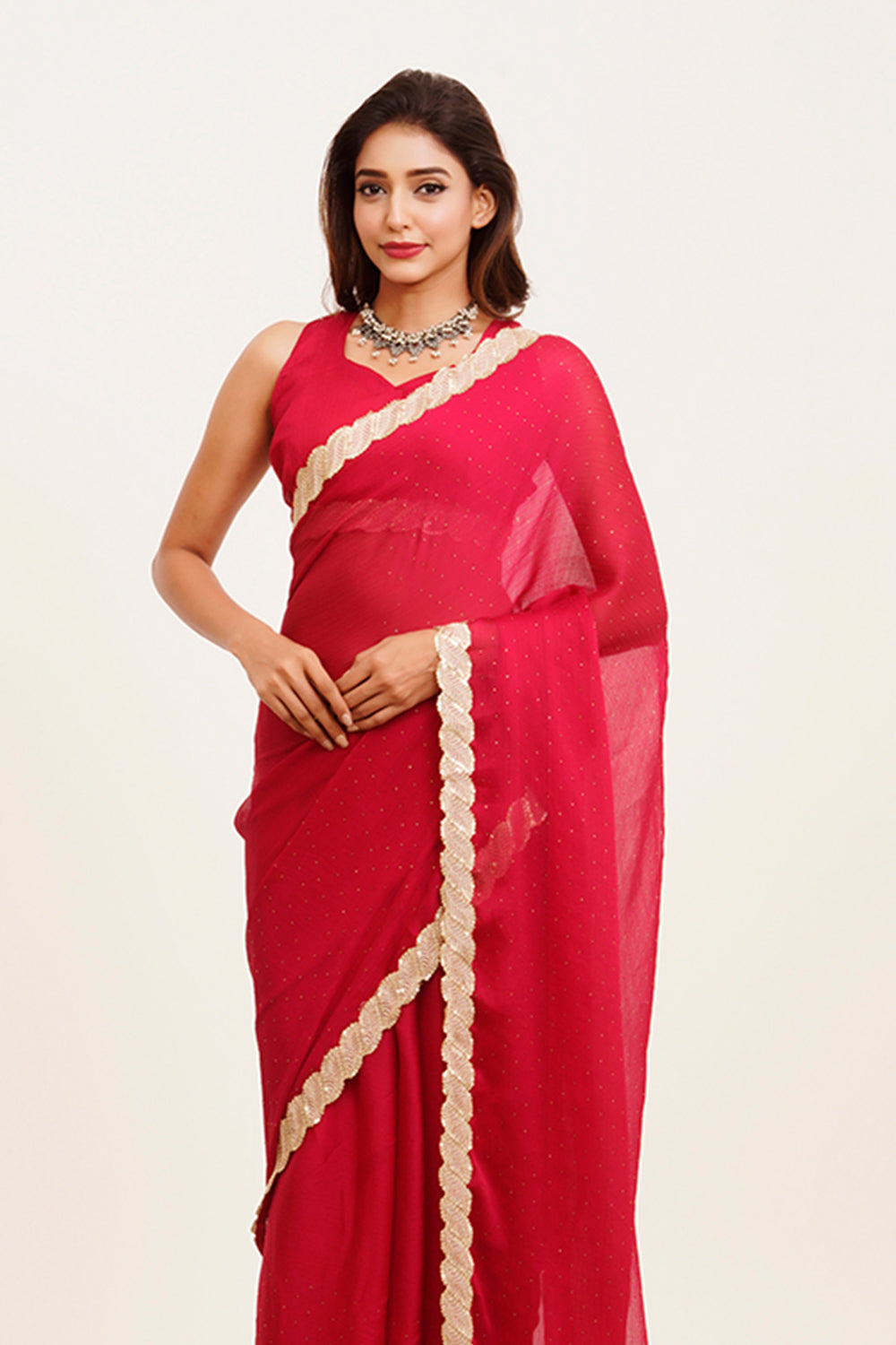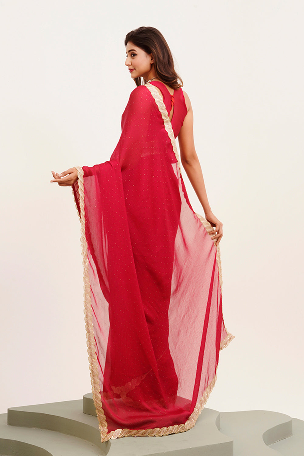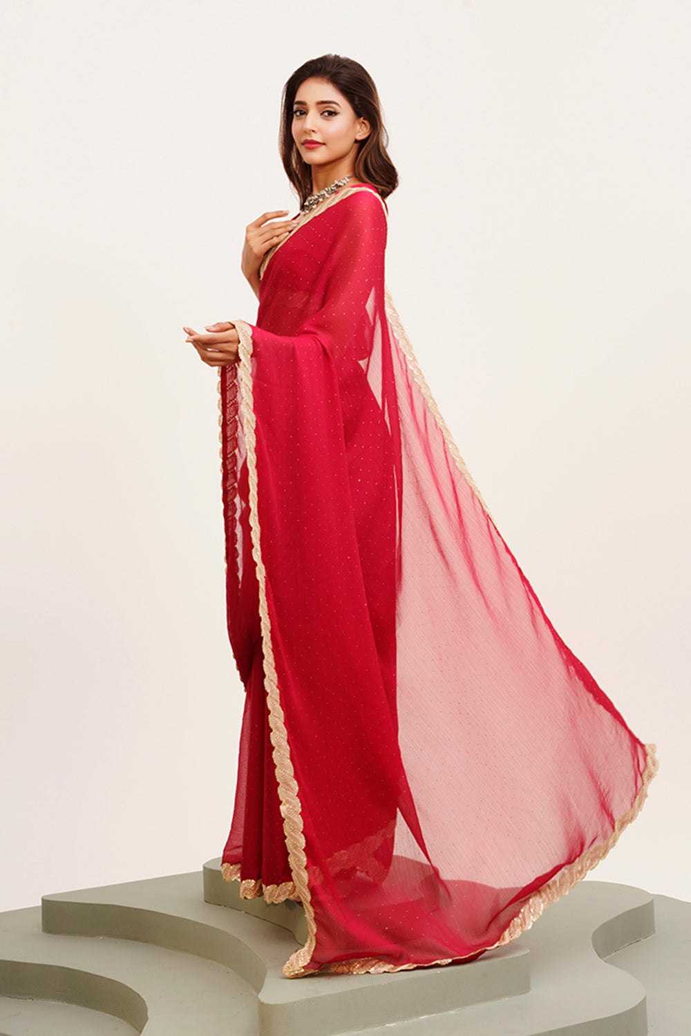 Elevate your traditional wardrobe with this exquisite red sequinned chiffon saree, paired with a matching blouse. The lightweight chiffon fabric ensures graceful draping and comfort, while the intricate sequinned detailing adds a subtle shimmer perfect for festive occasions or evening events. Designed for elegance and ease, this saree combines classic charm with contemporary style, making it a versatile choice for sophisticated celebrations.
