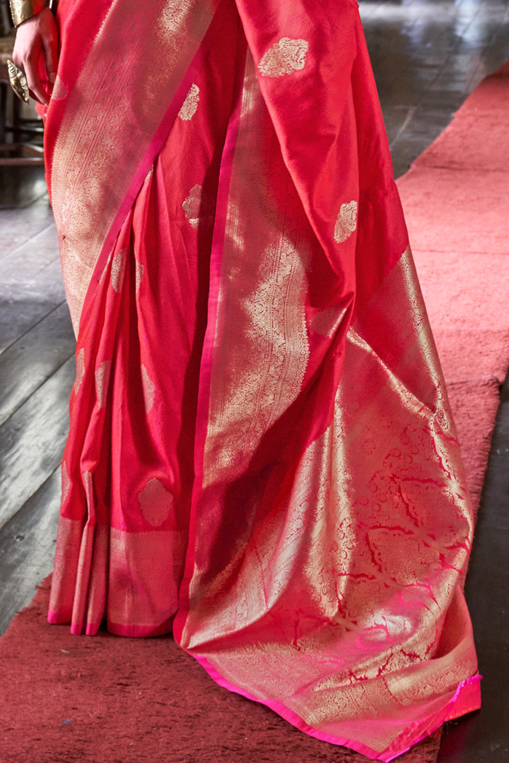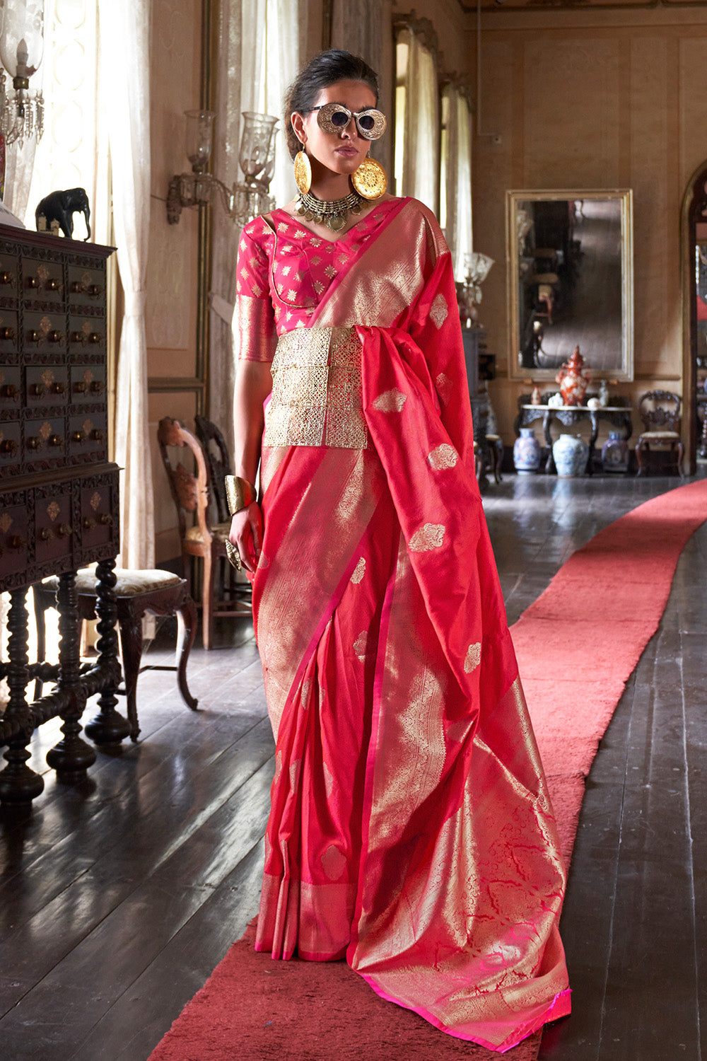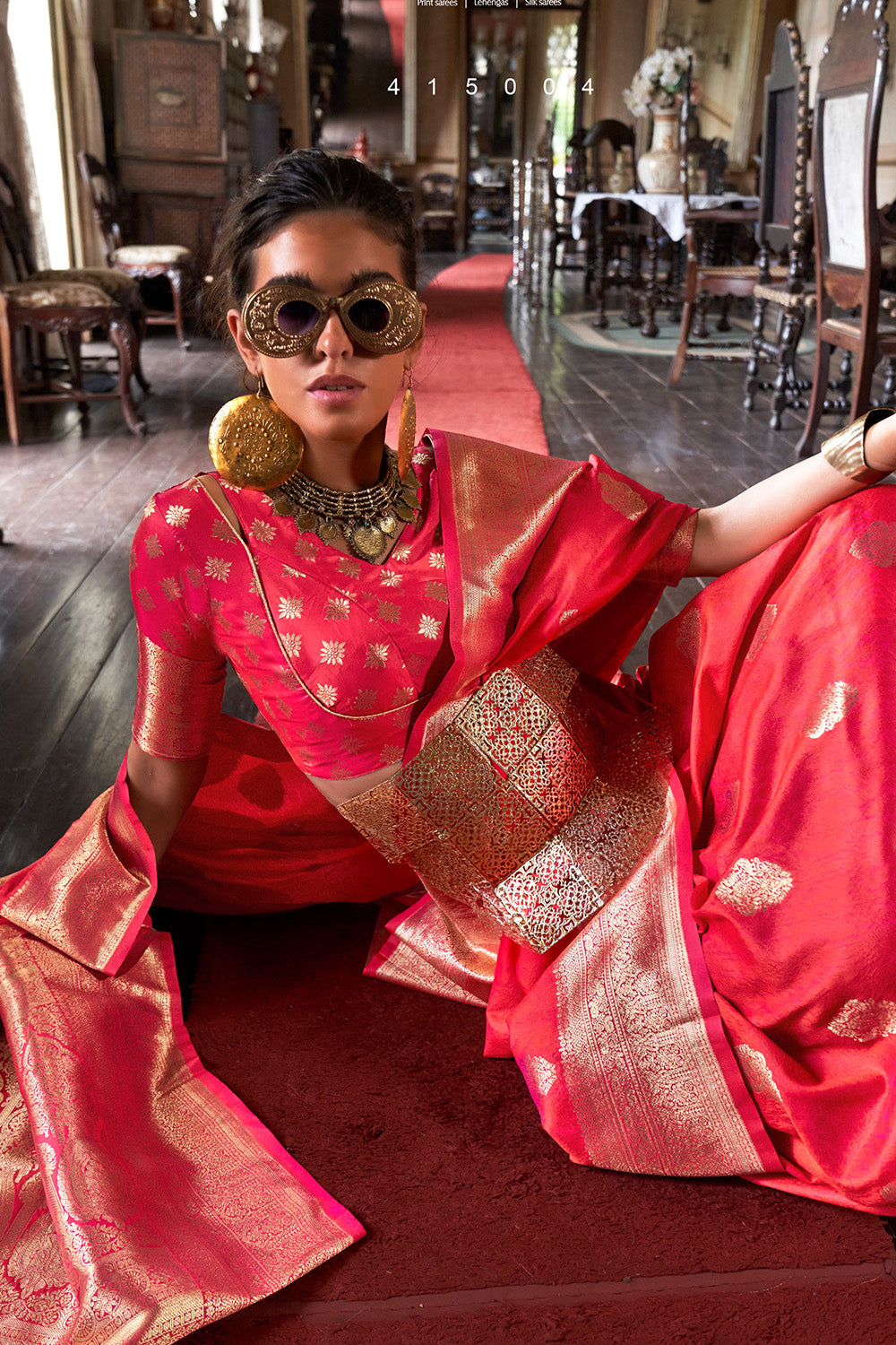 This Red Two Tone Saree, complemented by a brocade blouse, showcases a striking interplay of rich red shades for a sophisticated appeal. The saree’s smooth fabric offers a fluid drape, enhancing the nuanced color contrast. Paired with a finely woven brocade blouse, this ensemble is ideal for festive and formal occasions. It combines expert craftsmanship with elegant design, delivering both comfort and timeless style for a distinguished ethnic look.