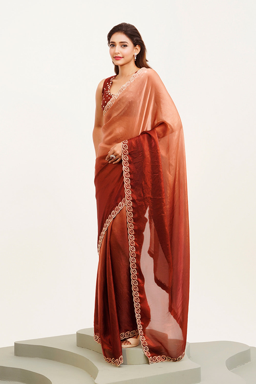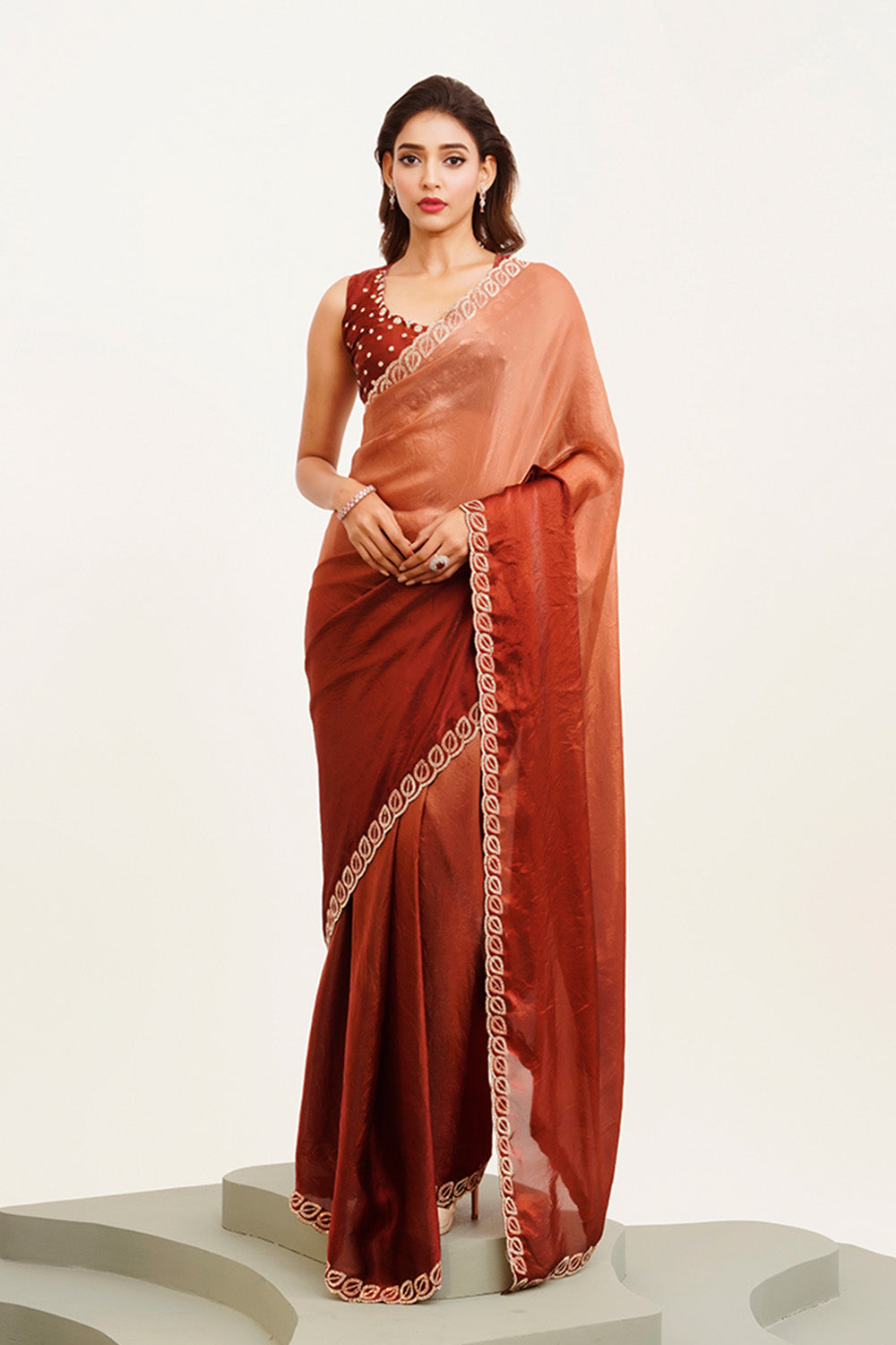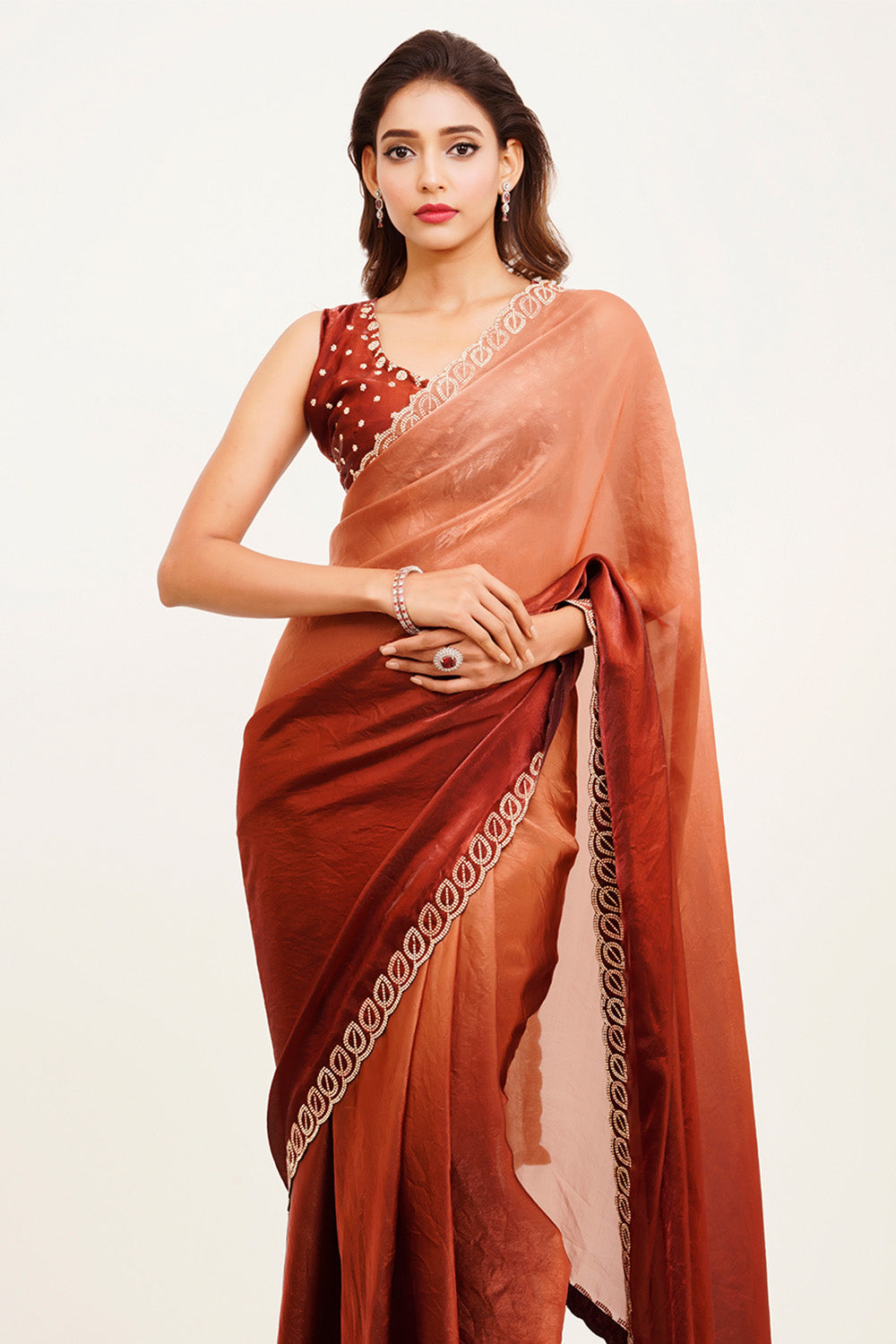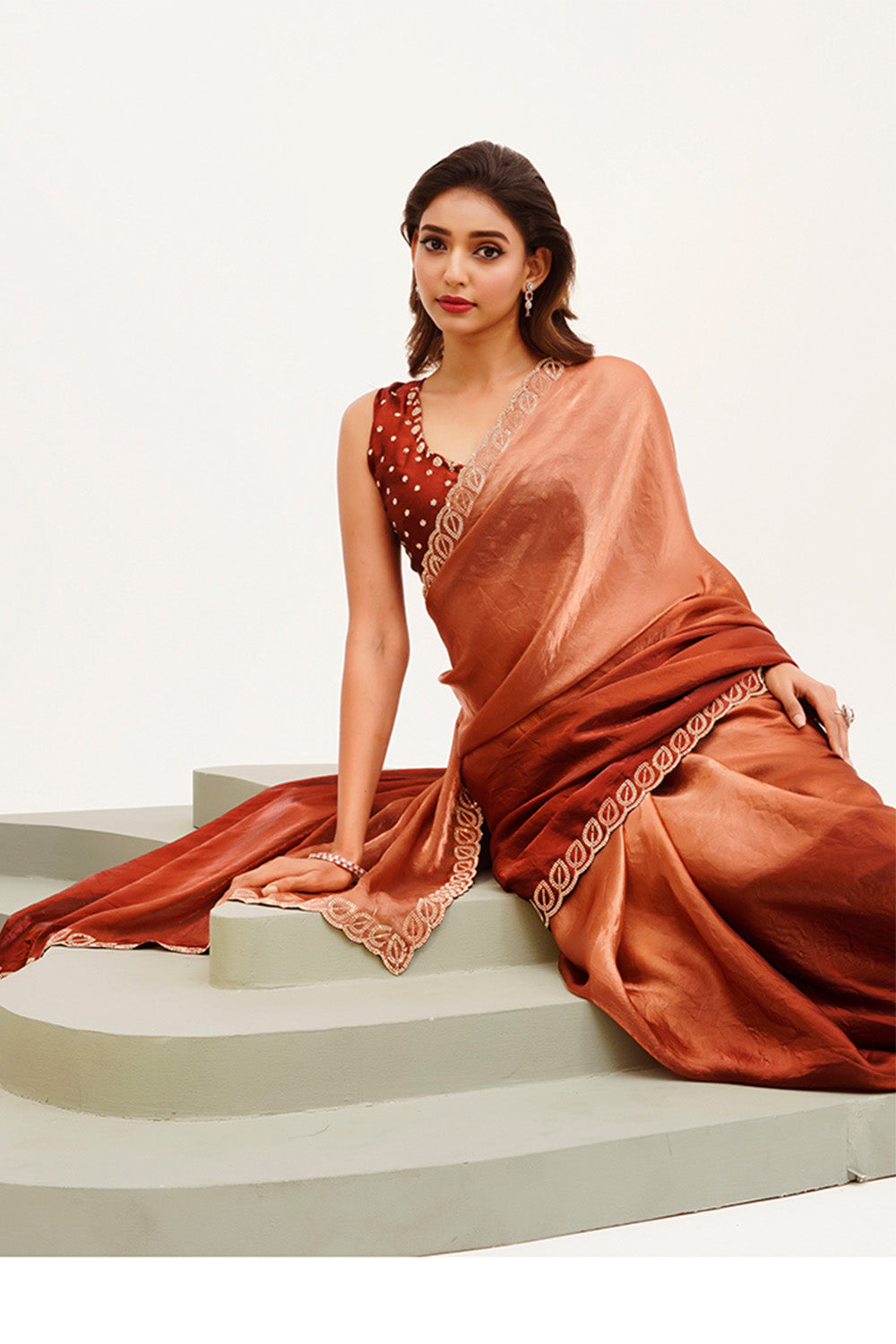 Elevate your ethnic wardrobe with this Rust Beads and Stones Satin Saree, expertly crafted to blend elegance with shimmer. The satin fabric offers a smooth, lustrous finish that drapes beautifully, while the intricate bead and stone embellishments add refined texture and sparkle. Paired with a matching blouse, this saree is ideal for festive occasions and formal events, providing a poised and sophisticated silhouette. Designed for comfort and style, it effortlessly enhances your traditional look with a contemporary edge.